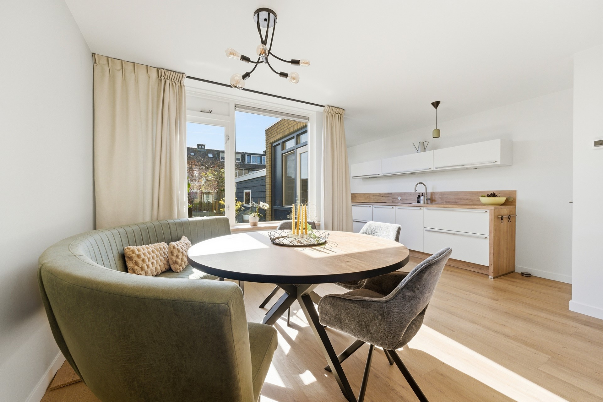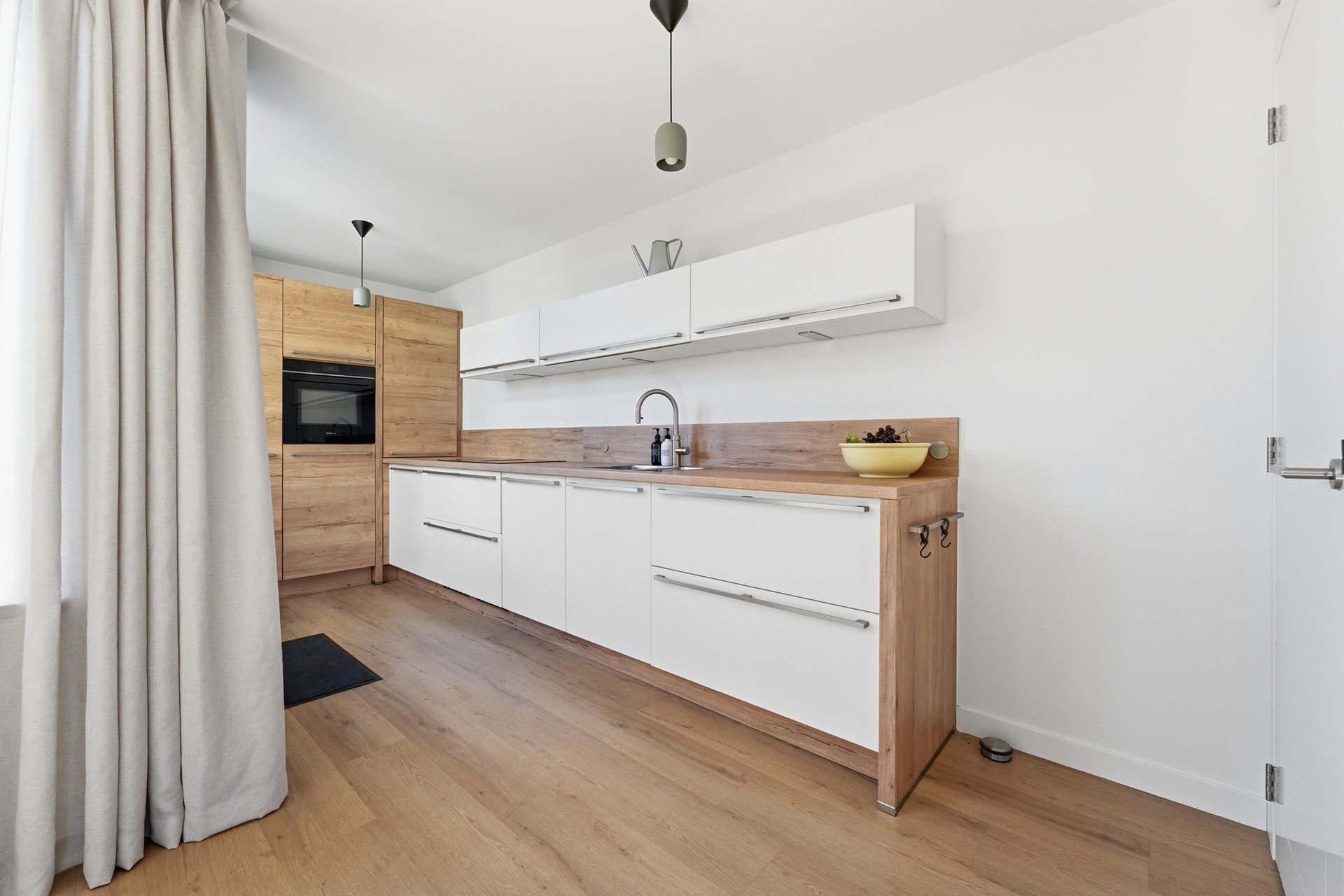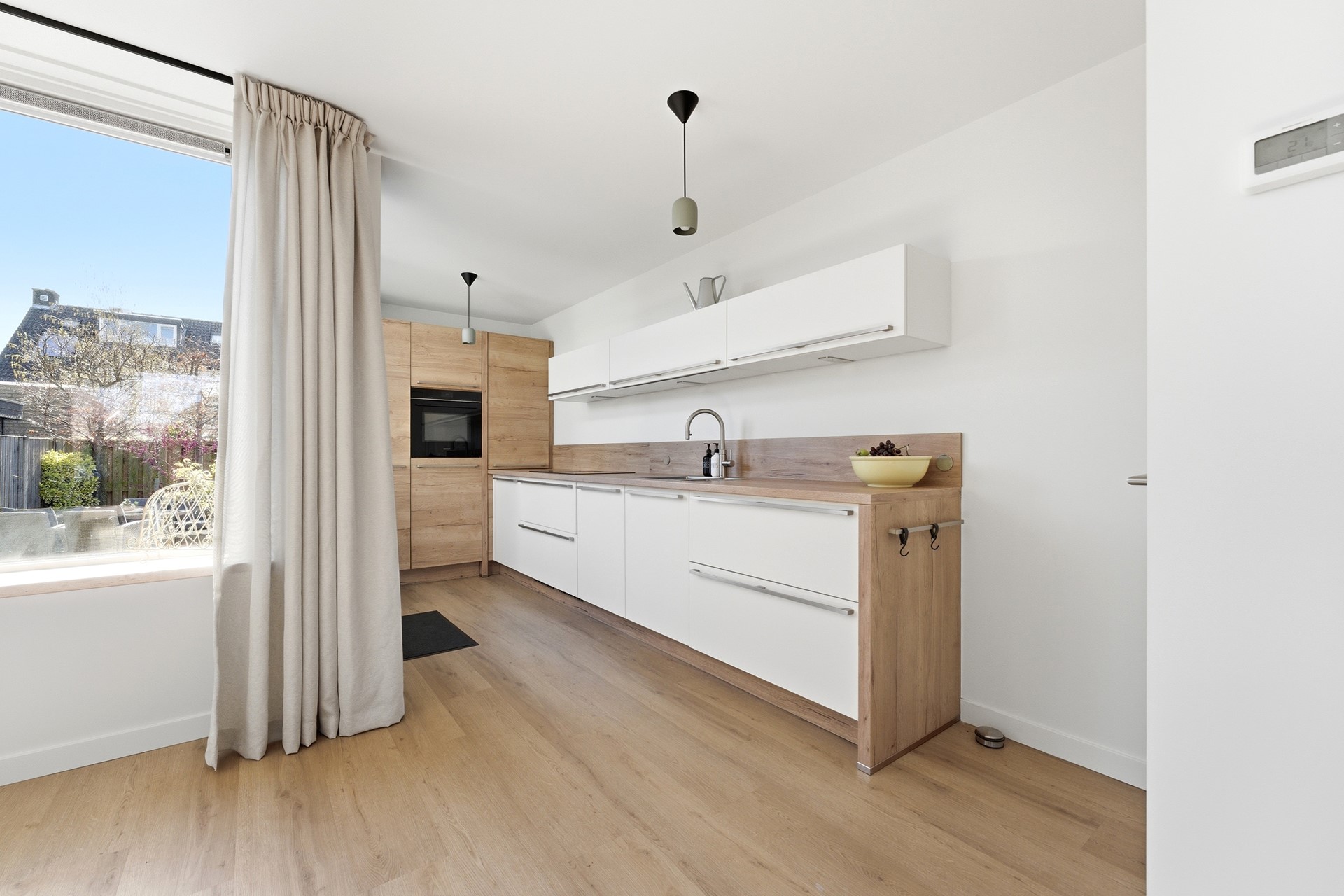 Keuken: In de open keuken uit 2024 komen design en functionaliteit samen. Deze strakke ruimte is uitgevoerd in een tijdloze, neutrale kleurstelling en nodigt direct uit tot uitgebreid koken. Je beschikt hier over topapparatuur, waaronder een inductiekookplaat met geïntegreerde afzuiging, een Quooker en een moderne oven. De koelkast, vriezer en vaatwasser zijn naadloos ingebouwd. Via de achterdeur betrek je de tuin eenvoudig bij je leefruimte.