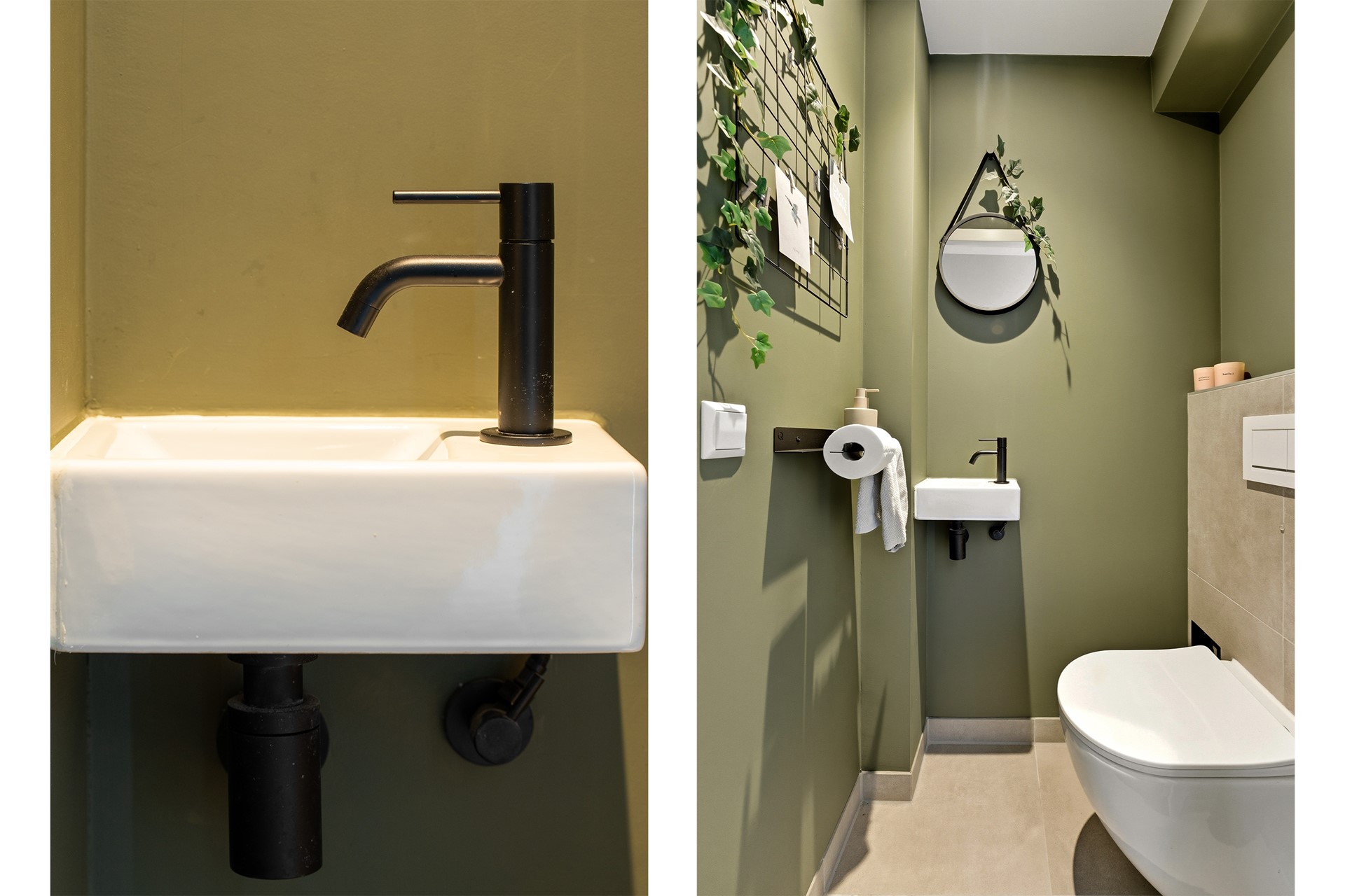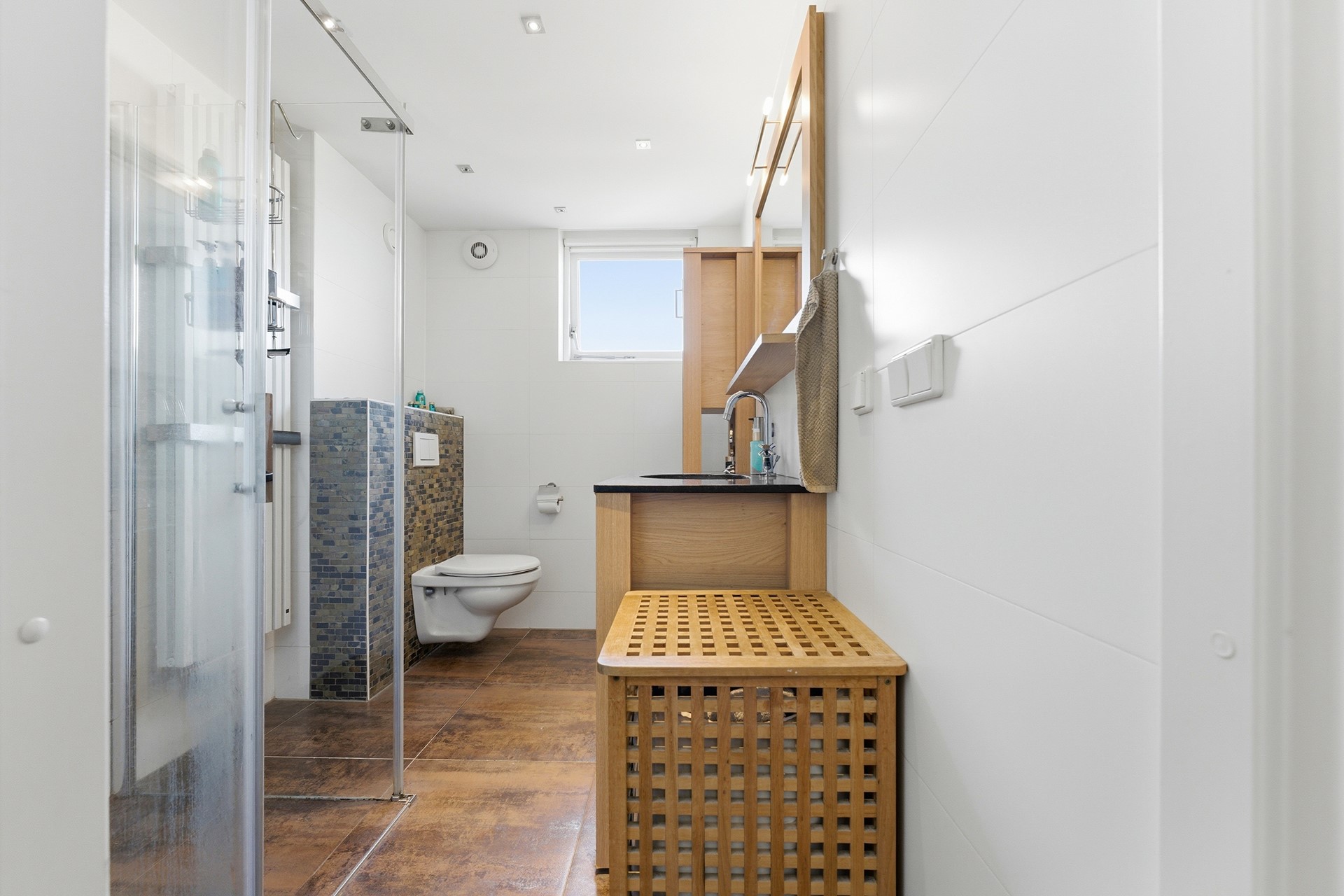 Toilet: De toiletruimte is uitgevoerd in een moderne stijl. Je beschikt hier over een zwevend toilet, een fonteintje, inbouwspots en mechanische ventilatie. Deze ruimte is strak afgewerkt met stucwerk.