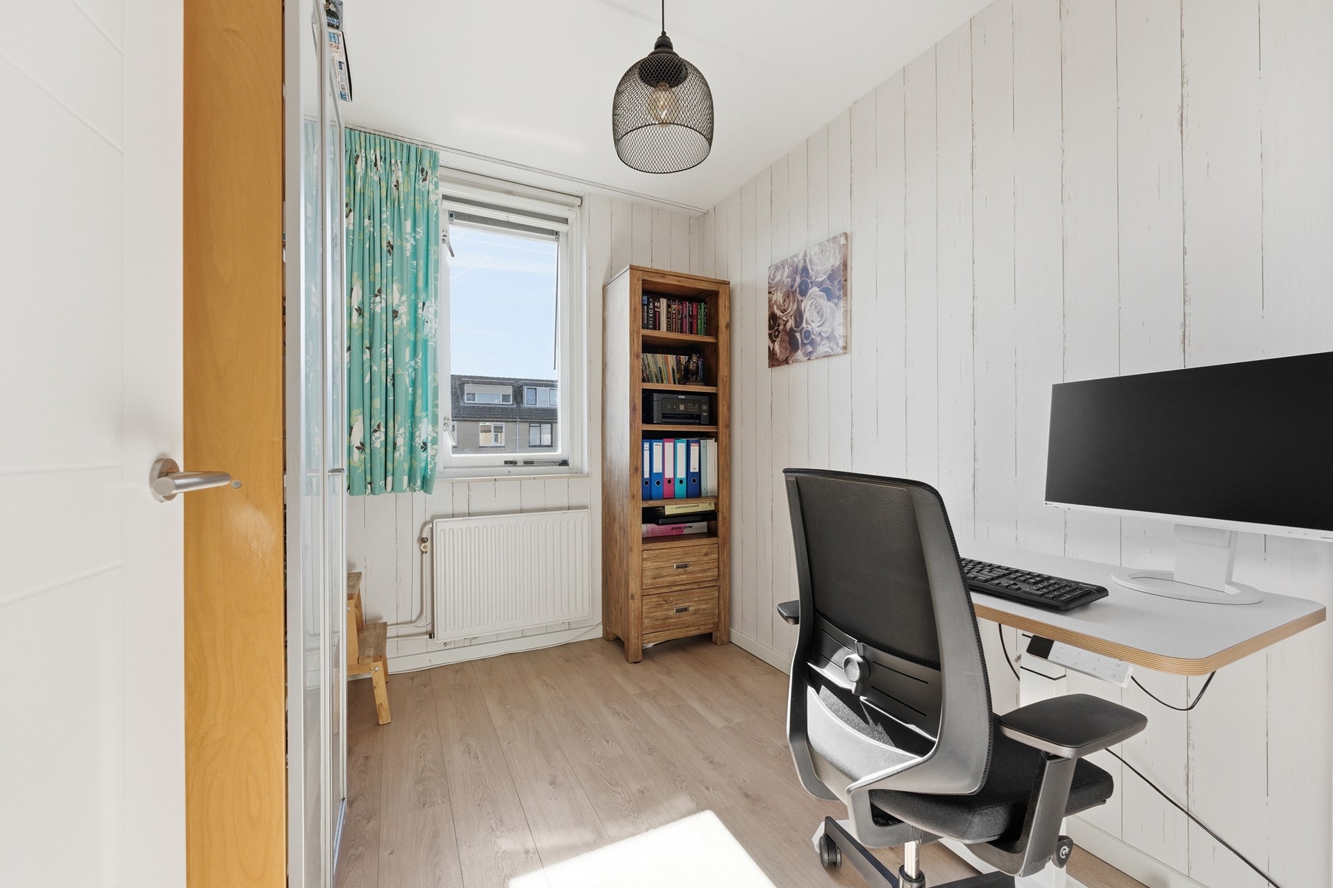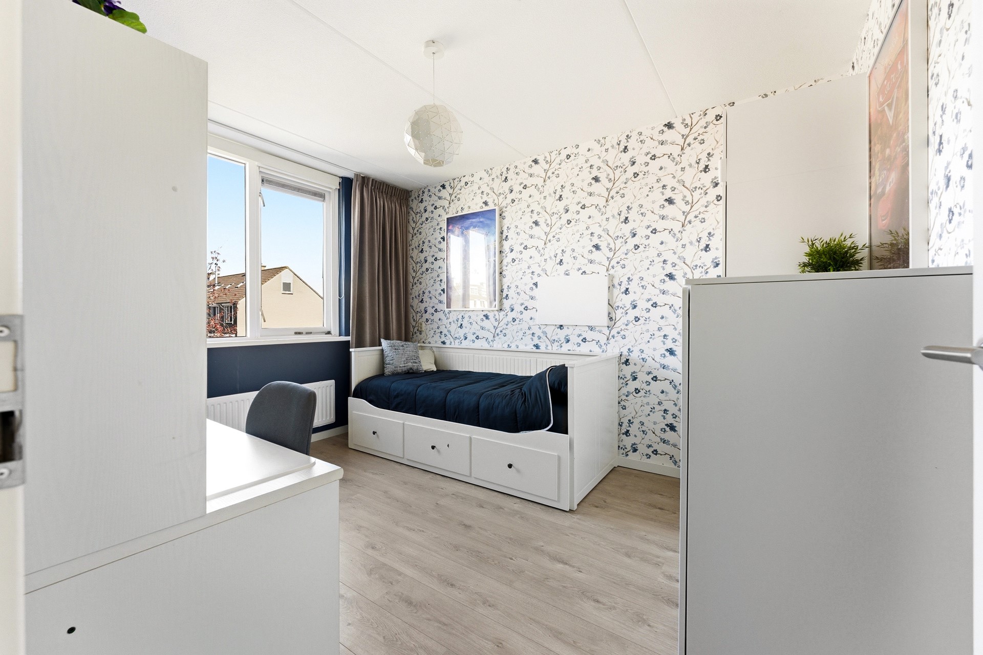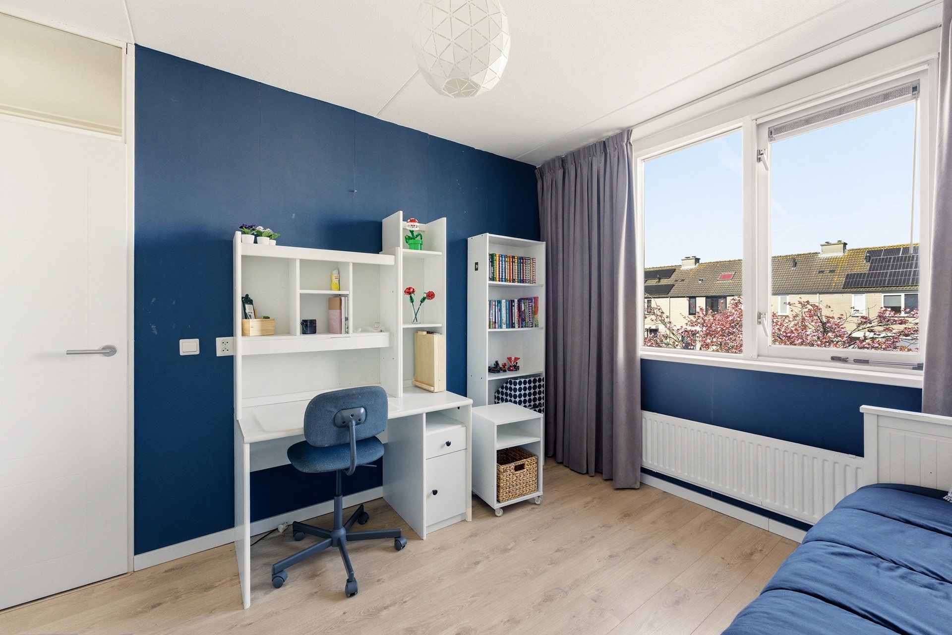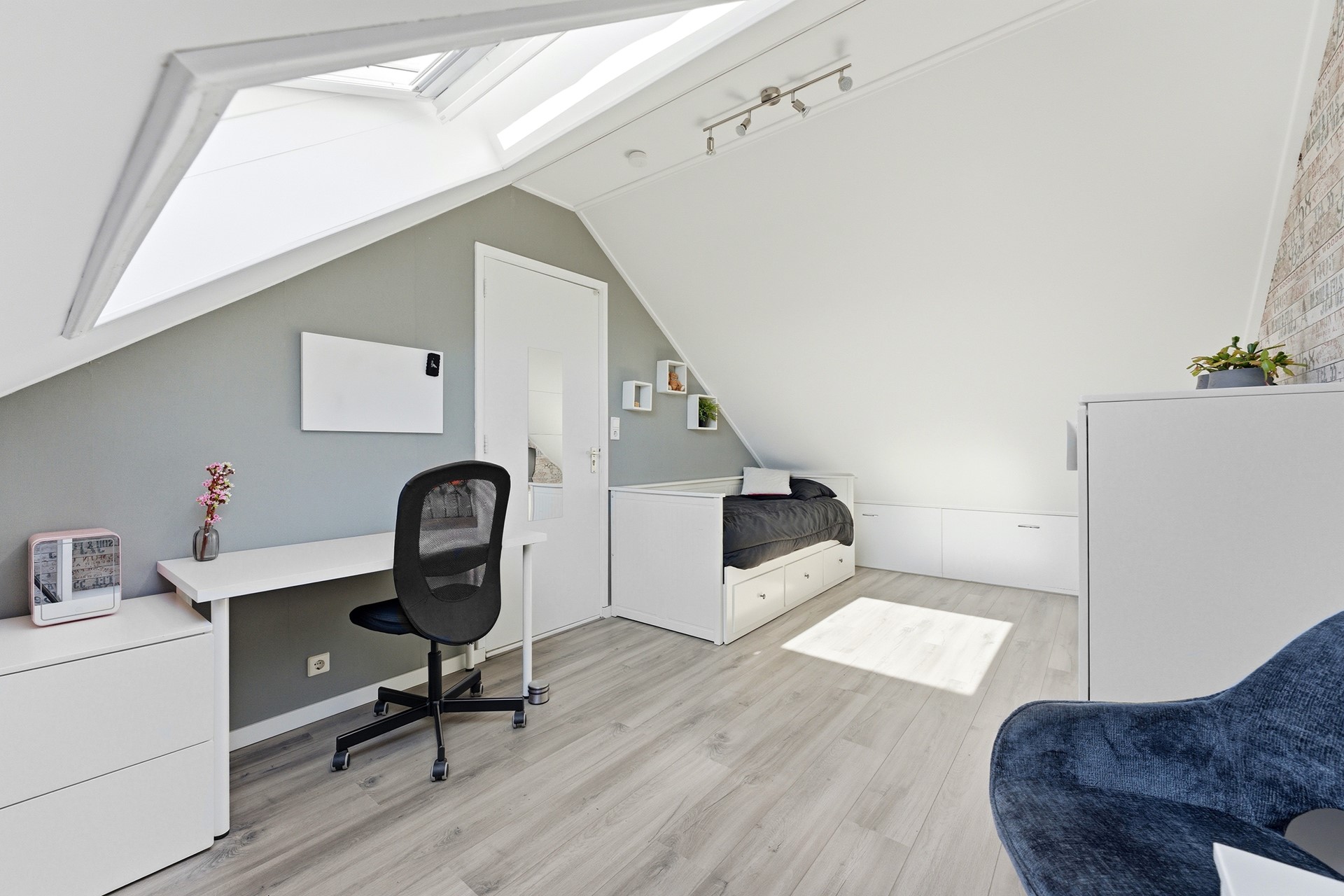 Slaapkamer 1: Deze kamer ligt aan de voorzijde van de woning en geniet van een prettige, natuurlijke lichtinval. Je kunt de zoninval hier eenvoudig naar wens reguleren dankzij de aanwezige screen. Het is een ideale kinder- of tienerkamer met meer dan voldoende ruimte voor zowel een bed als een bureau.