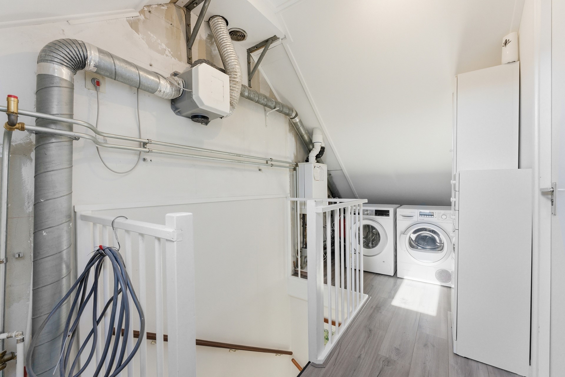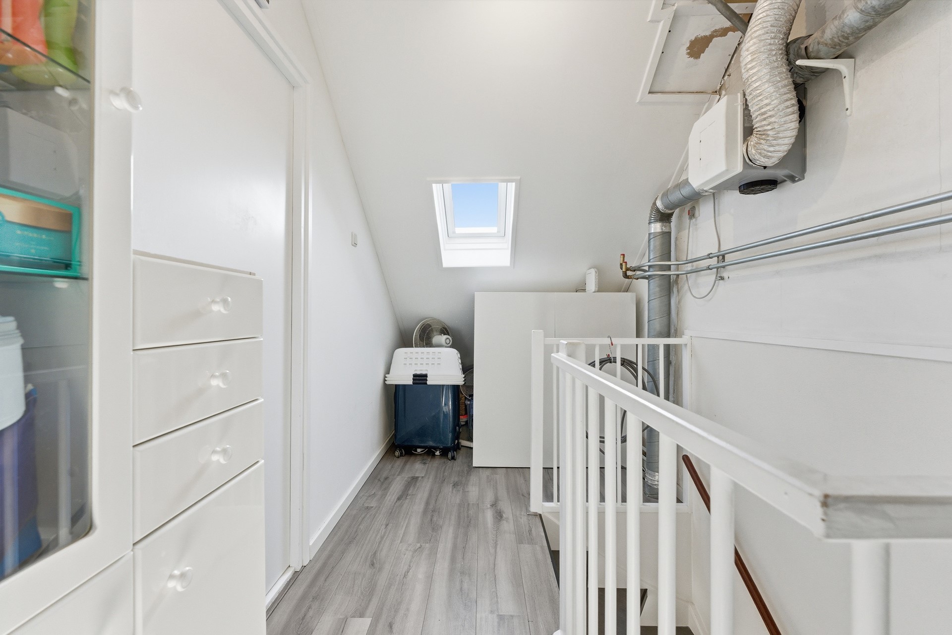 Voorzolder: Op de voorzolder bevindt zich de opstelplaats voor de Cv-ketel en vind je de aansluitingen voor de wasmachine en droger. Deze ruimte is keurig afgewerkt met een laminaatvloer, behangwanden en een spuitwerkplafond.