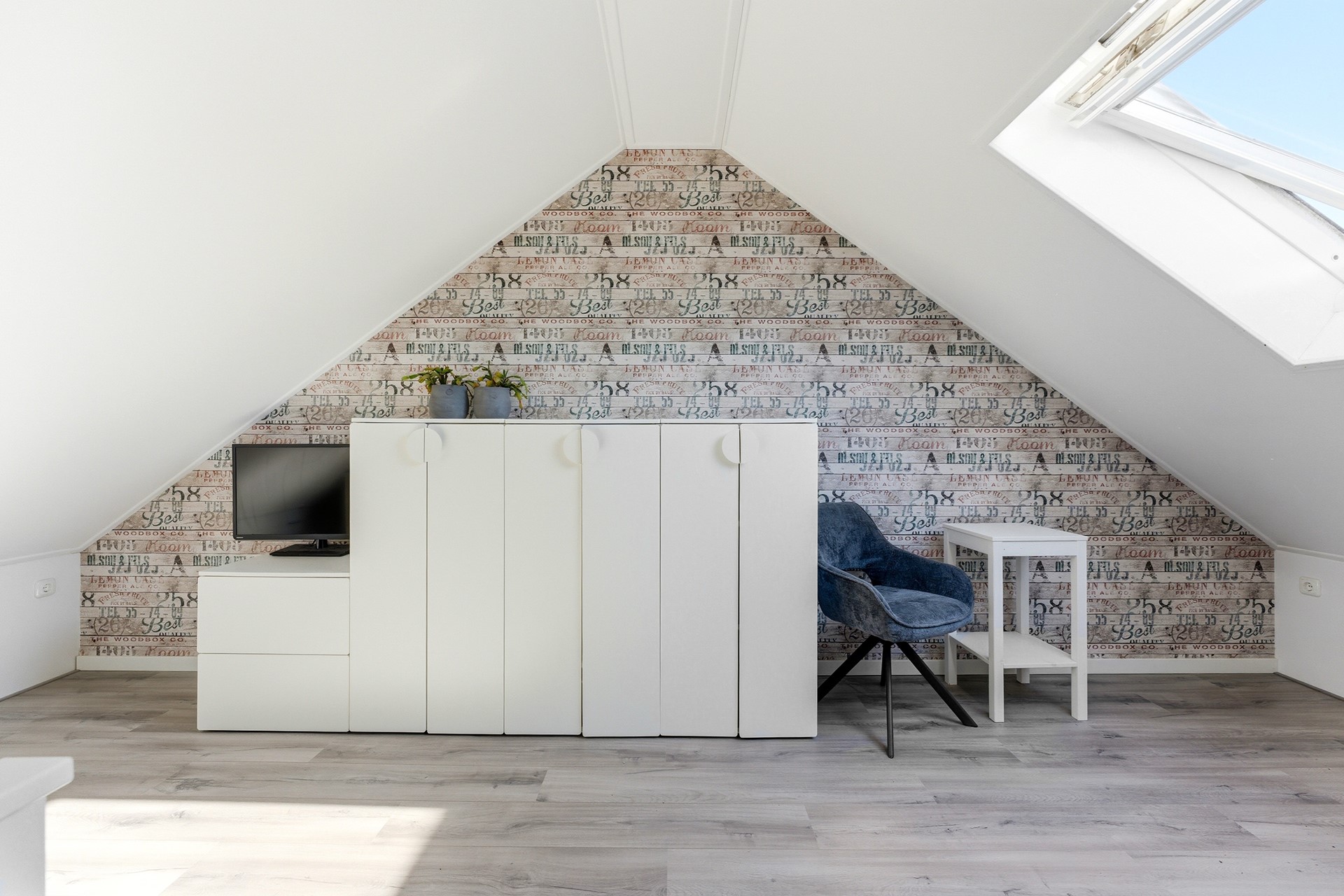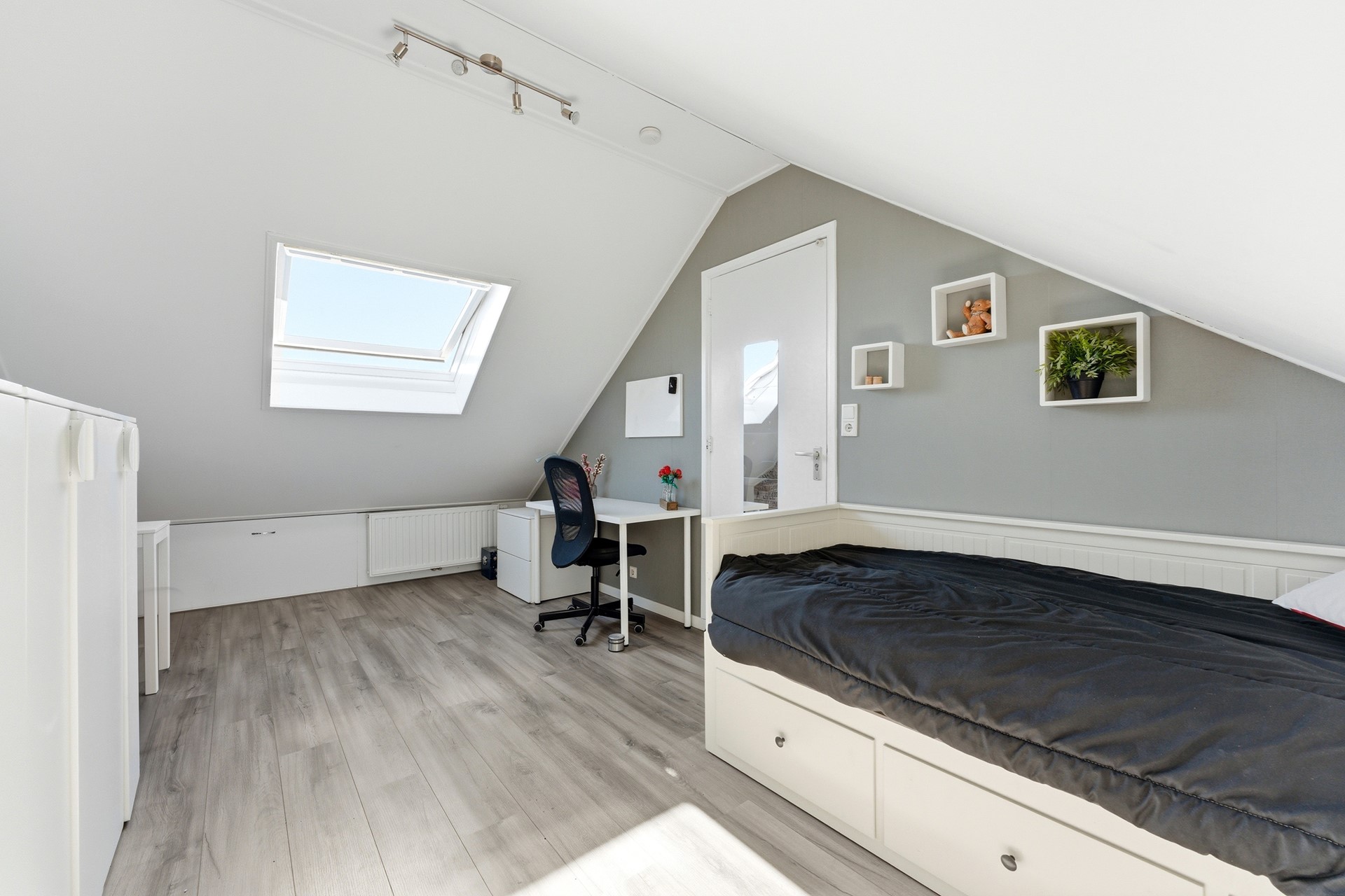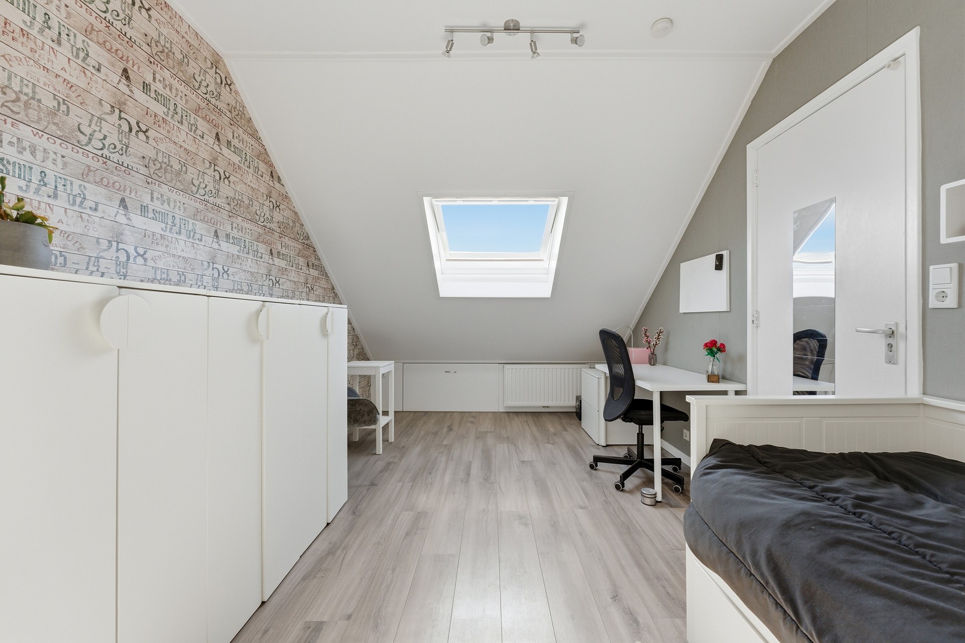 Slaapkamer 4: De vierde slaapkamer is een volwaardige kamer met een groot Velux dakraam dat zorgt voor veel natuurlijk licht. Dit is een ideale plek als extra slaapkamer of rustige werkplek. Deze ruimte is keurig afgewerkt met een laminaatvloer, behangwanden en een spuitwerkplafond.