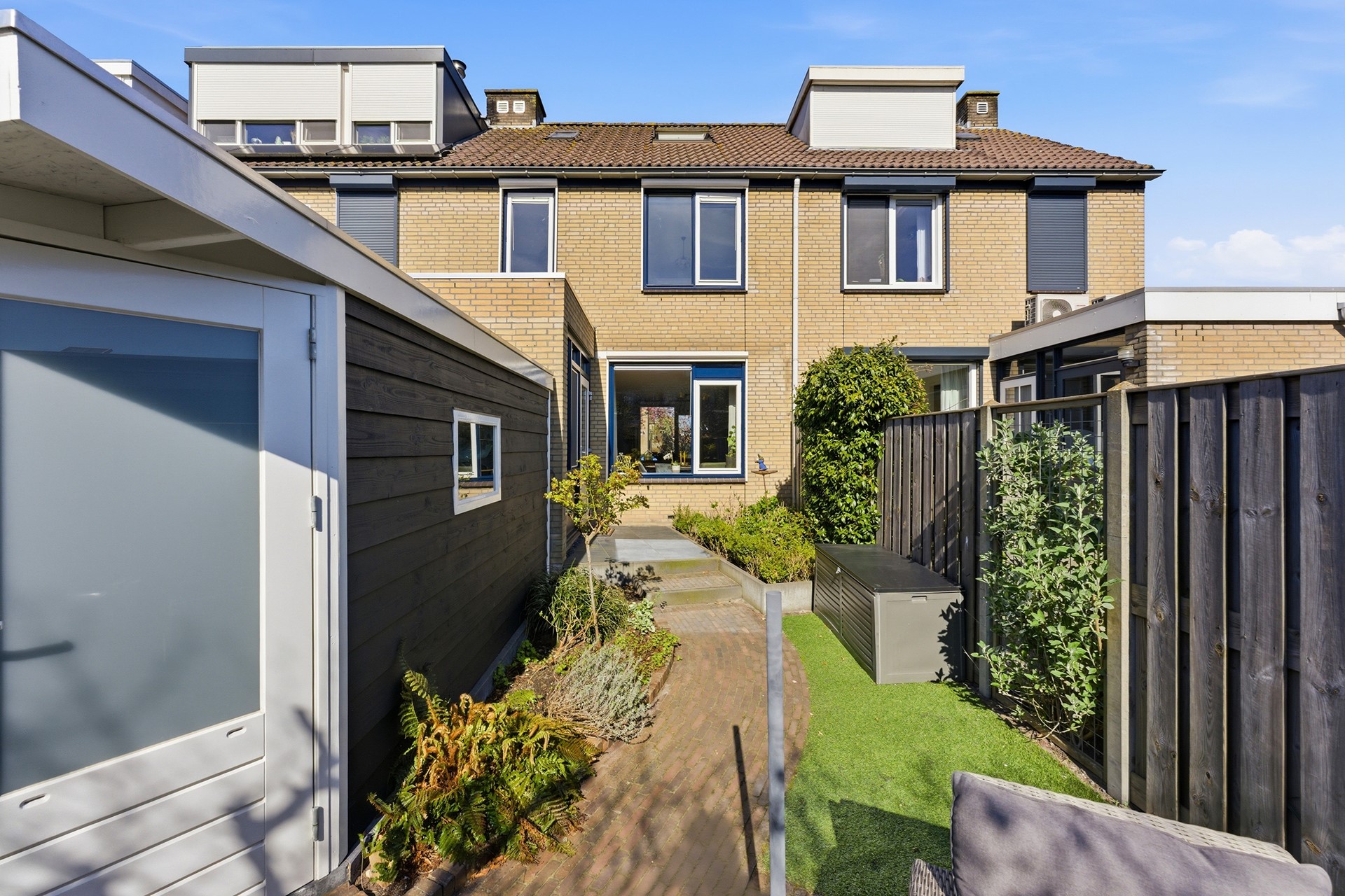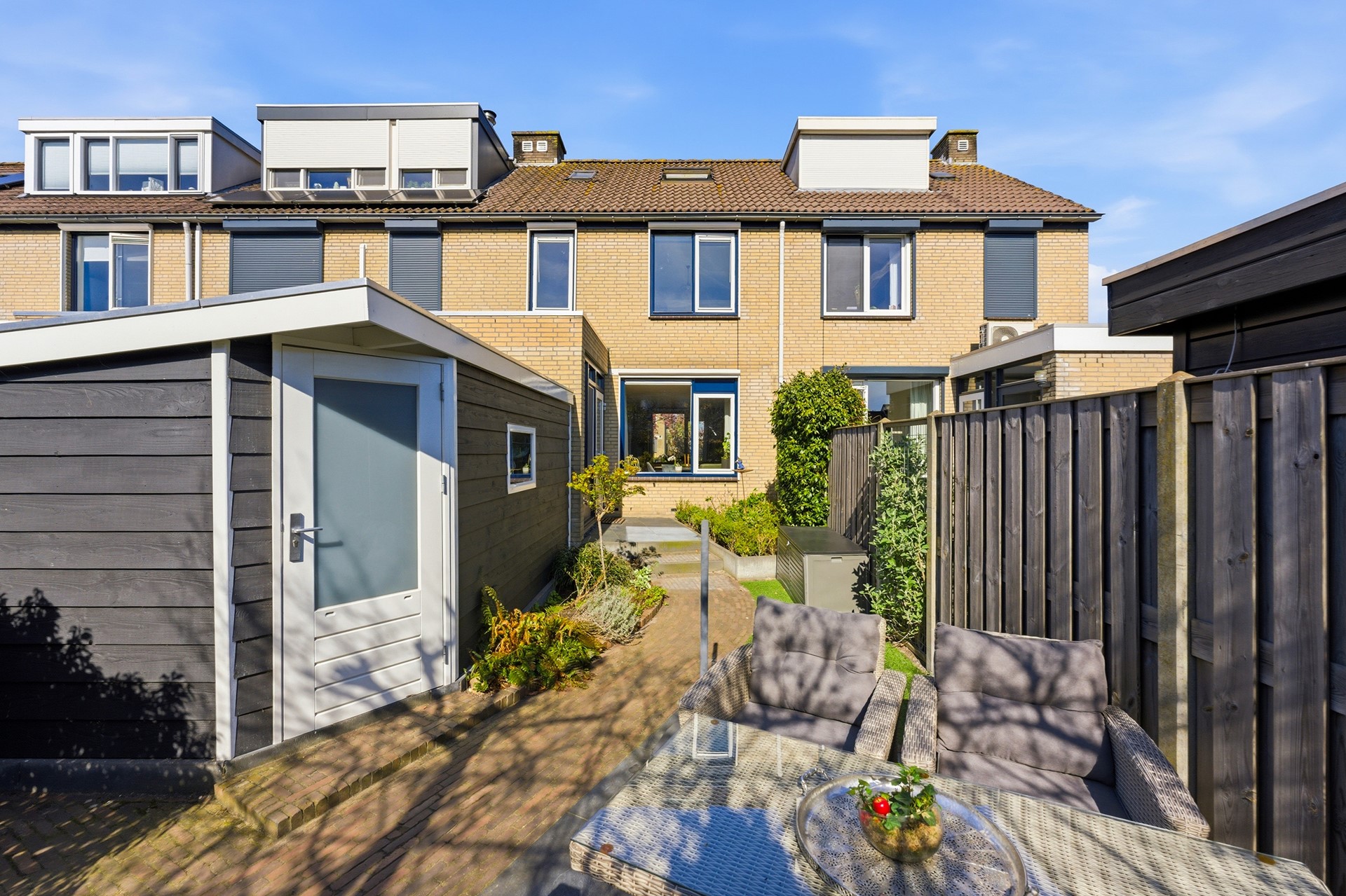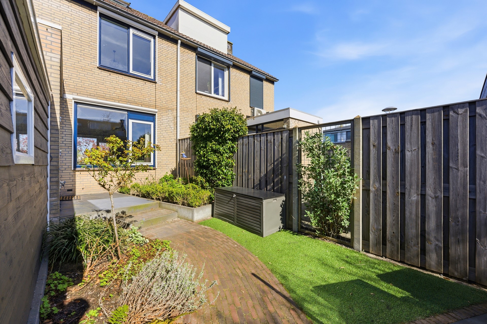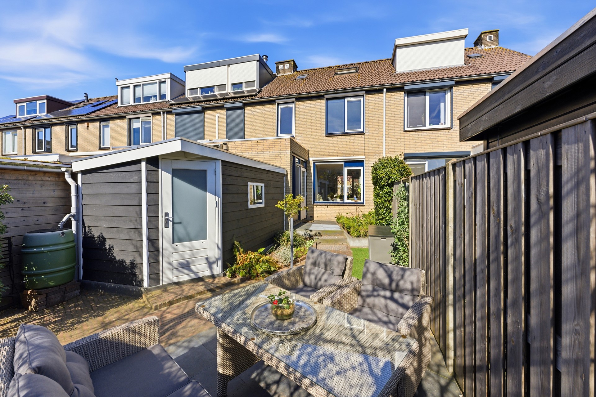 Achtertuin: In deze diepe achtertuin (ca. 11,00 x 5,20 m) op het zuidoosten geniet je de hele dag van de zon. Het is een heerlijke plek met een fijn zonneterras waar je in alle rust kunt ontspannen. De tuin is met zorg onderhouden en biedt een mooie variatie aan beplanting en sierbestrating. Voor optimaal gemak is er een watervoorziening, elektra en een screen aanwezig. Dankzij de praktische achterom is de tuin ook met de fiets goed bereikbaar.