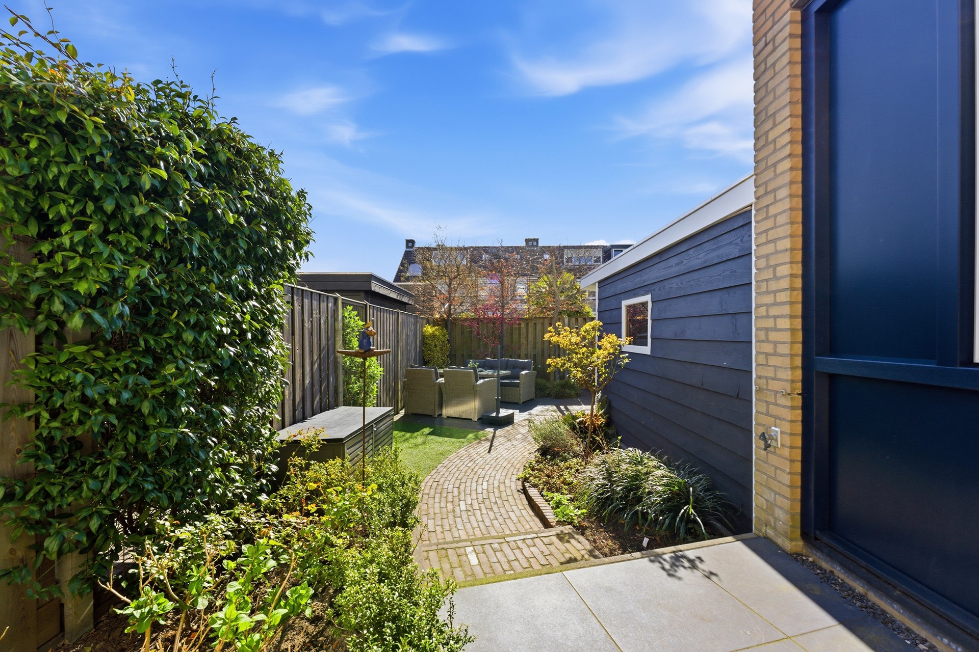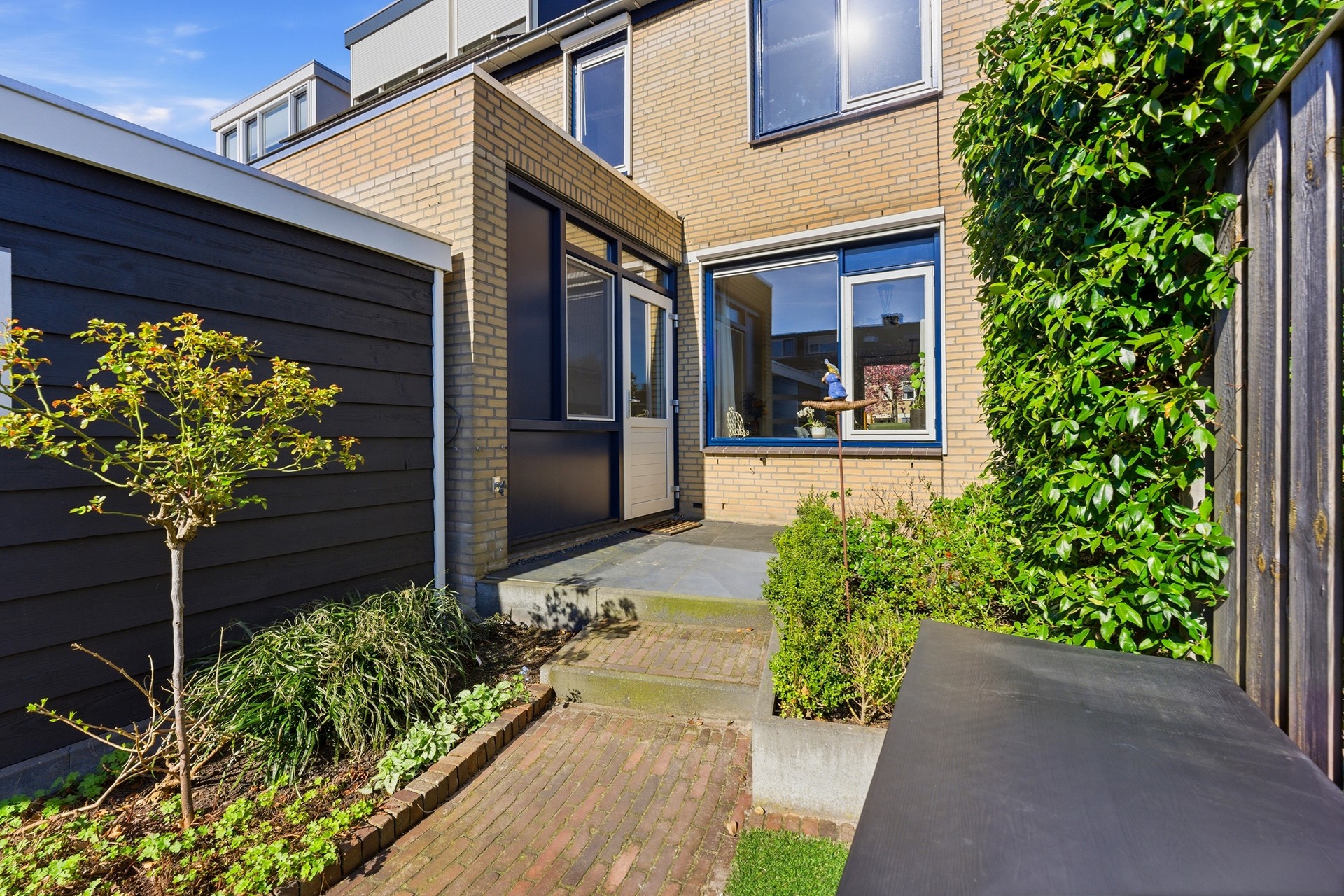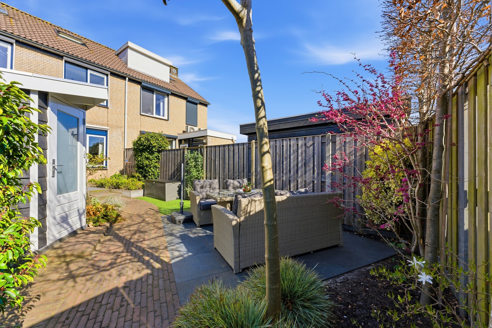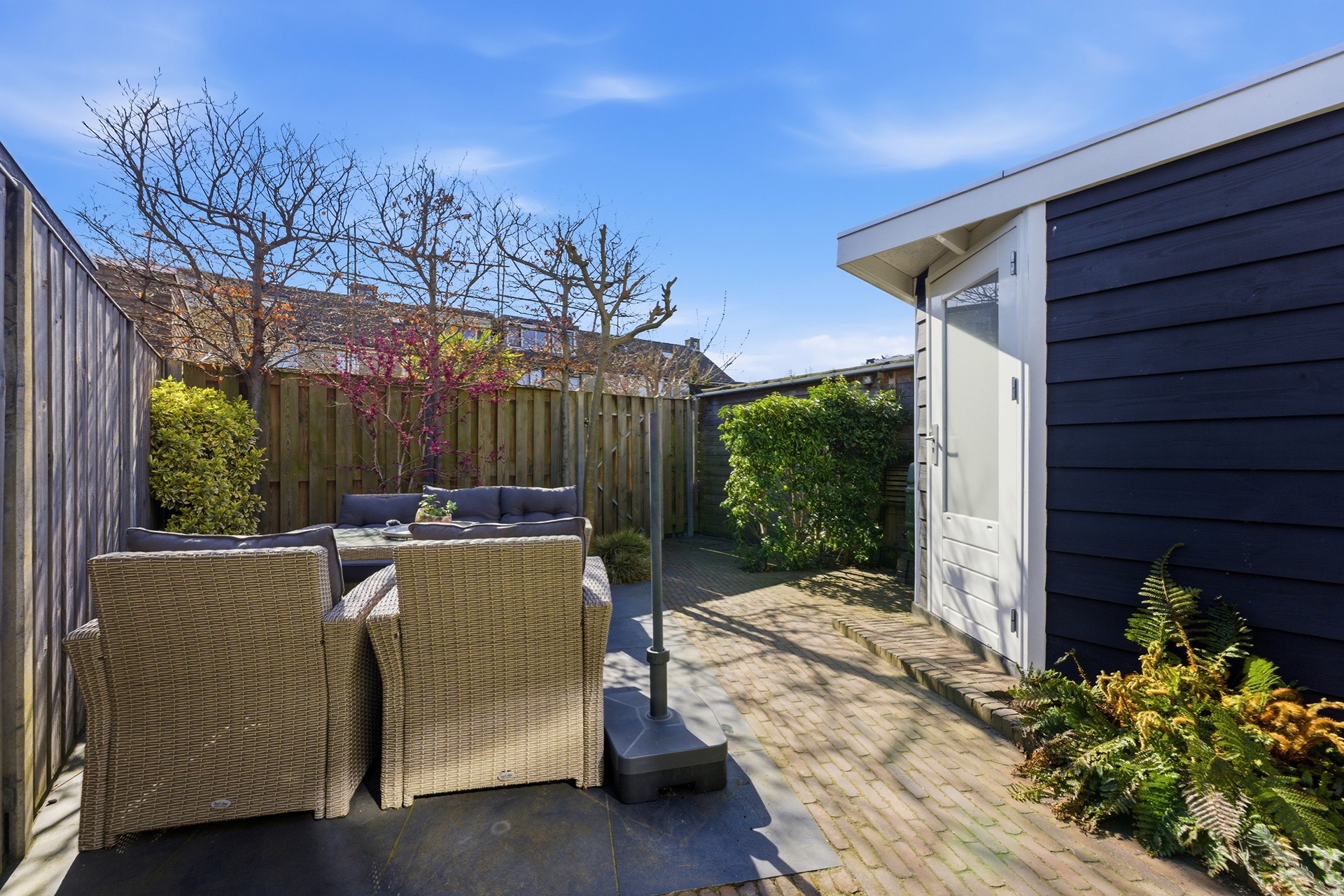 Achtertuin: In deze diepe achtertuin (ca. 11,00 x 5,20 m) op het zuidoosten geniet je de hele dag van de zon. Het is een heerlijke plek met een fijn zonneterras waar je in alle rust kunt ontspannen. De tuin is met zorg onderhouden en biedt een mooie variatie aan beplanting en sierbestrating. Voor optimaal gemak is er een watervoorziening, elektra en een screen aanwezig. Dankzij de praktische achterom is de tuin ook met de fiets goed bereikbaar.