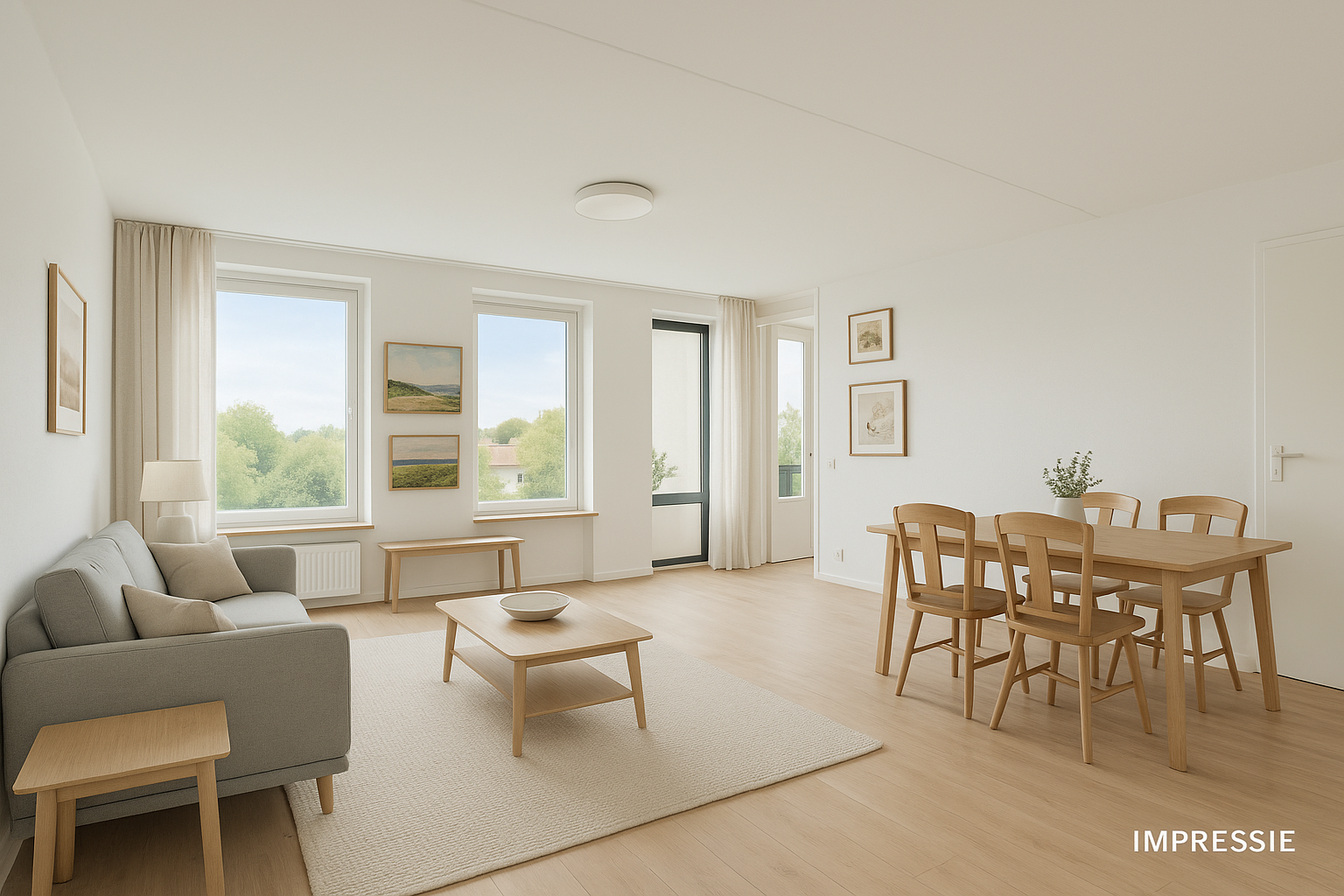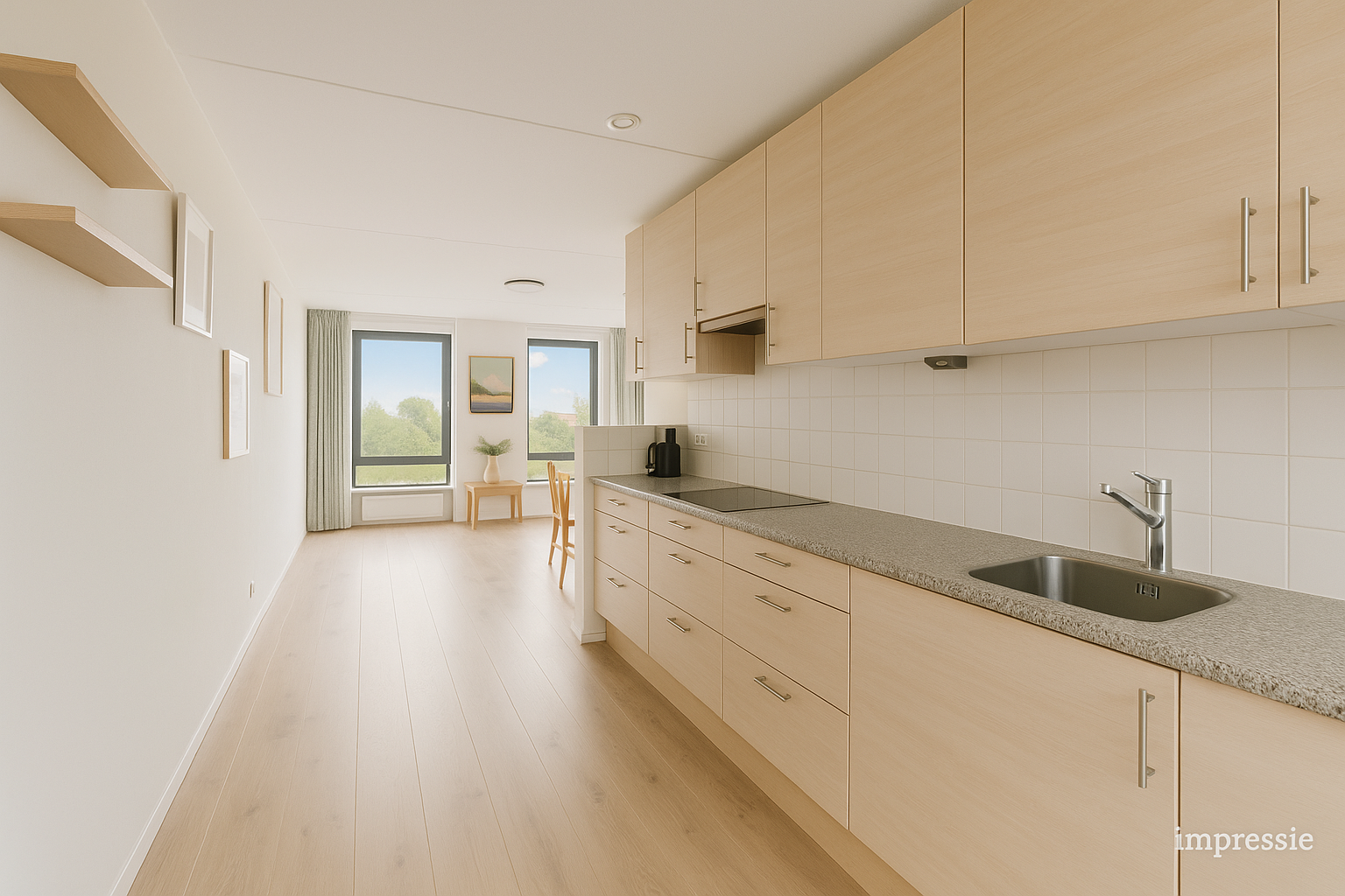 Woonkamer: Wanneer u de woonkamer binnenkomt, valt direct de prettige lichtinval op dankzij de grote ramen aan de voorzijde. De ruimte voelt open en aangenaam aan, met volop plek voor een comfortabele zithoek en een eettafel. De open keuken sluit mooi aan op het geheel, wat zorgt voor een gezellige en praktische leefruimte. Vanuit de woonkamer heeft u toegang tot de loggia. Wilt u meer ruimte? Dan bestaat de mogelijkheid om de naastgelegen slaapkamer bij de woonkamer te betrekken en zo een extra royale living te creëren. De ruimte is afgewerkt met een laminaatvloer, spachtelputz wanden en een spuitwerk plafond.