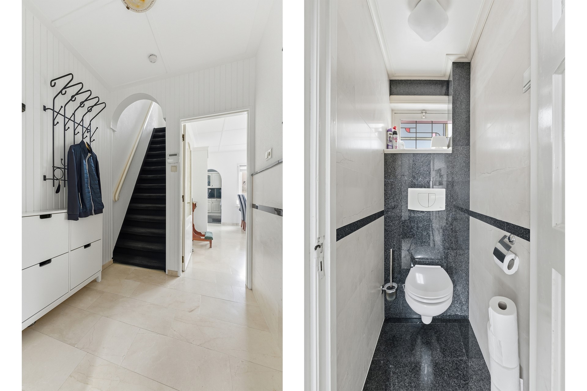 Entree: Je betreedt de woning in een ruime hal die toegang geeft tot het toilet, de woonkamer en de trapopgang naar de eerste verdieping. De karakteristieke glas-in-looddeur maakt de entree compleet. De hal is afgewerkt met natuursteen op de vloer, natuursteen en spachtelputz op de wanden en een plafond met ornamenten.