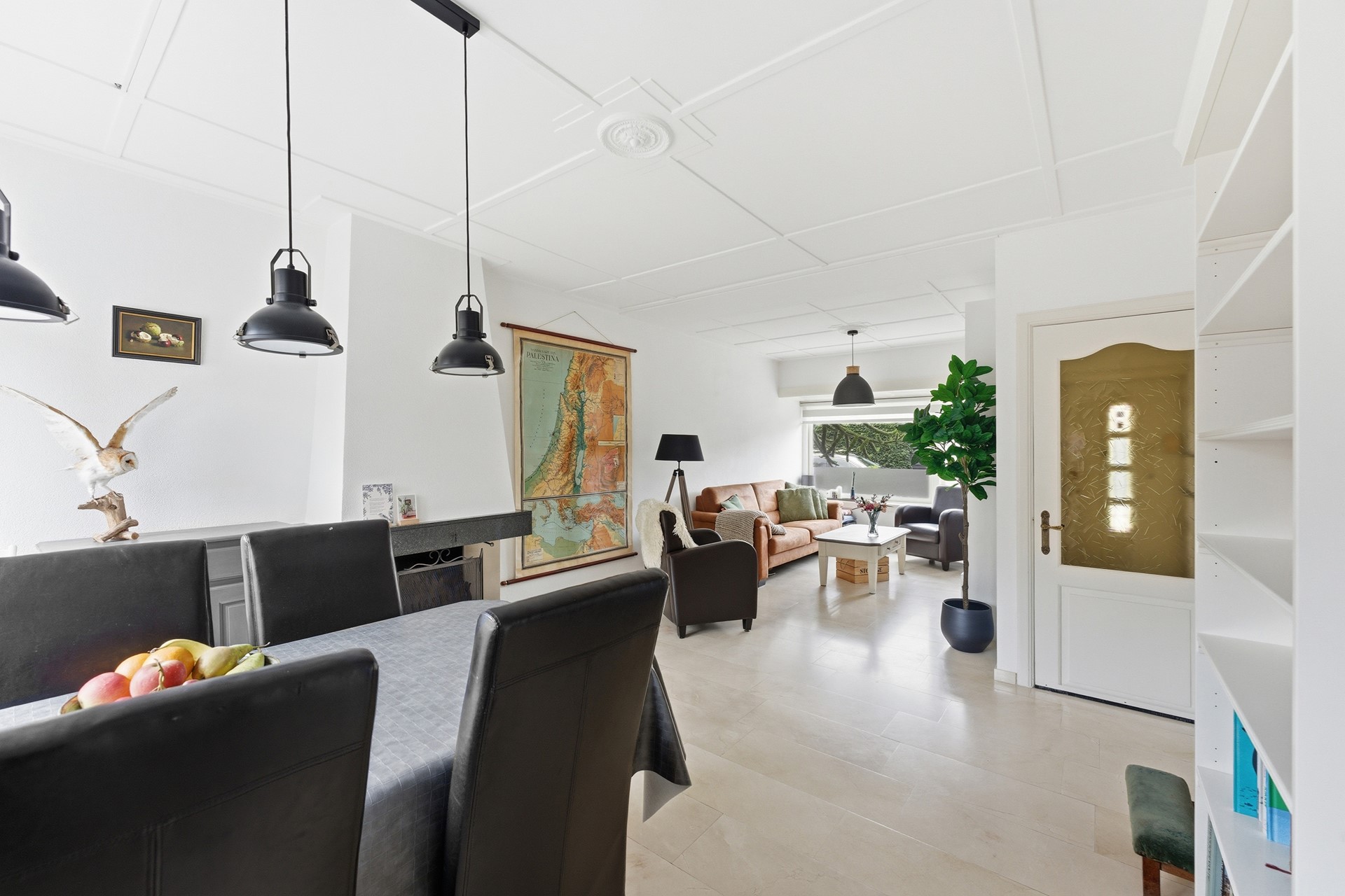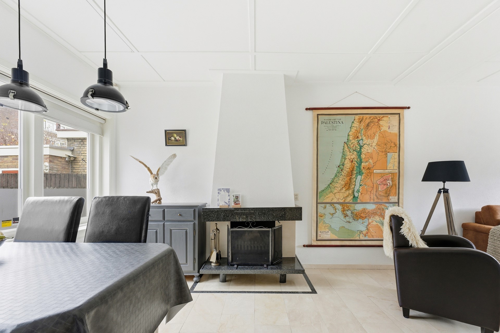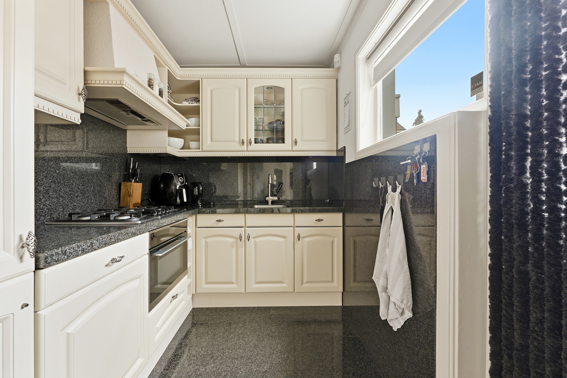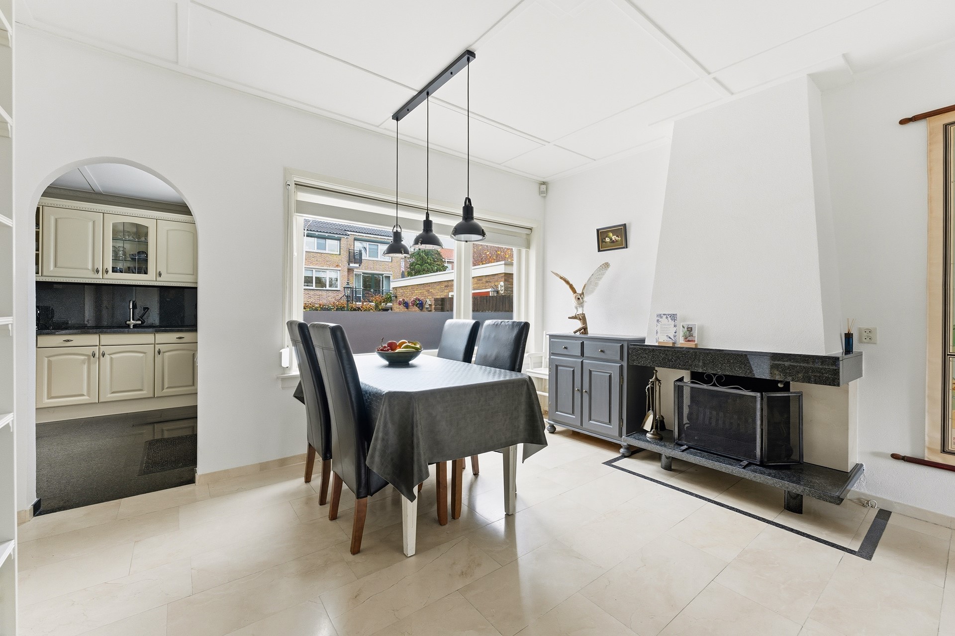 Woonkamer: De doorzonwoonkamer heeft een fijne lichtinval dankzij de leuke erker aan de voorzijde en het raam aan de achterzijde, waar een rolluik aanwezig is. In de winter kun je gezellig de open haard aansteken. De ruimte loopt mooi door richting de keuken en biedt verschillende indelingsmogelijkheden. De woonkamer is afgewerkt met natuursteen op de vloer, spachtelputz wanden en een ornamentenplafond.
