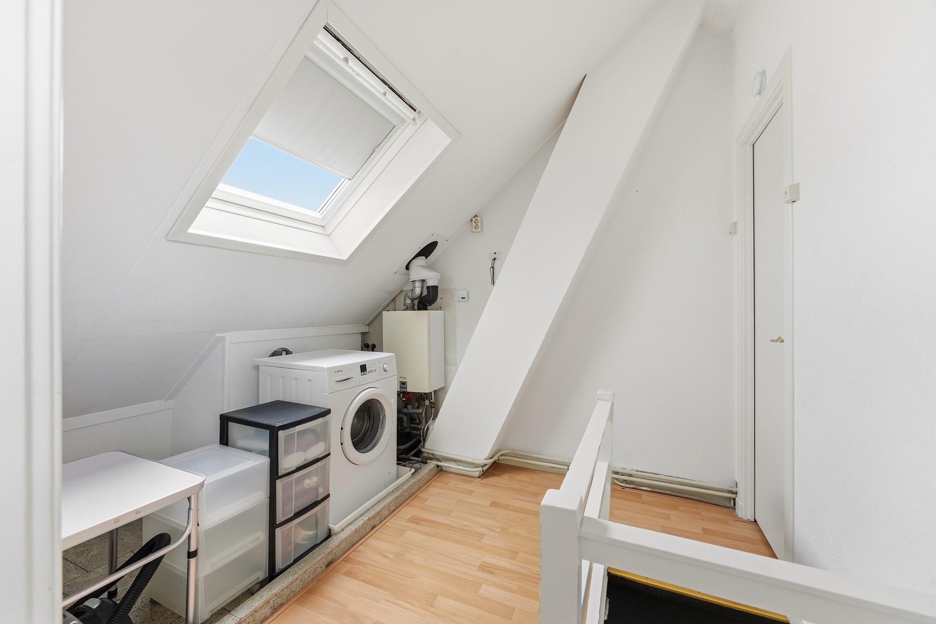 Voorzolder: De ruime voorzolder geeft toegang tot een opbergruimte en een slaapkamer. In de opbergruimte kun je mooi de seizoensspullen kwijt. Op deze verdieping vind je ook de opstelplaats voor de CV-ketel en de aansluiting voor de wasmachine. Het dakraam zorgt voor natuurlijke lichtinval. De ruimte is afgewerkt met een laminaatvloer, spachtelputz wanden en een gips plafond.
