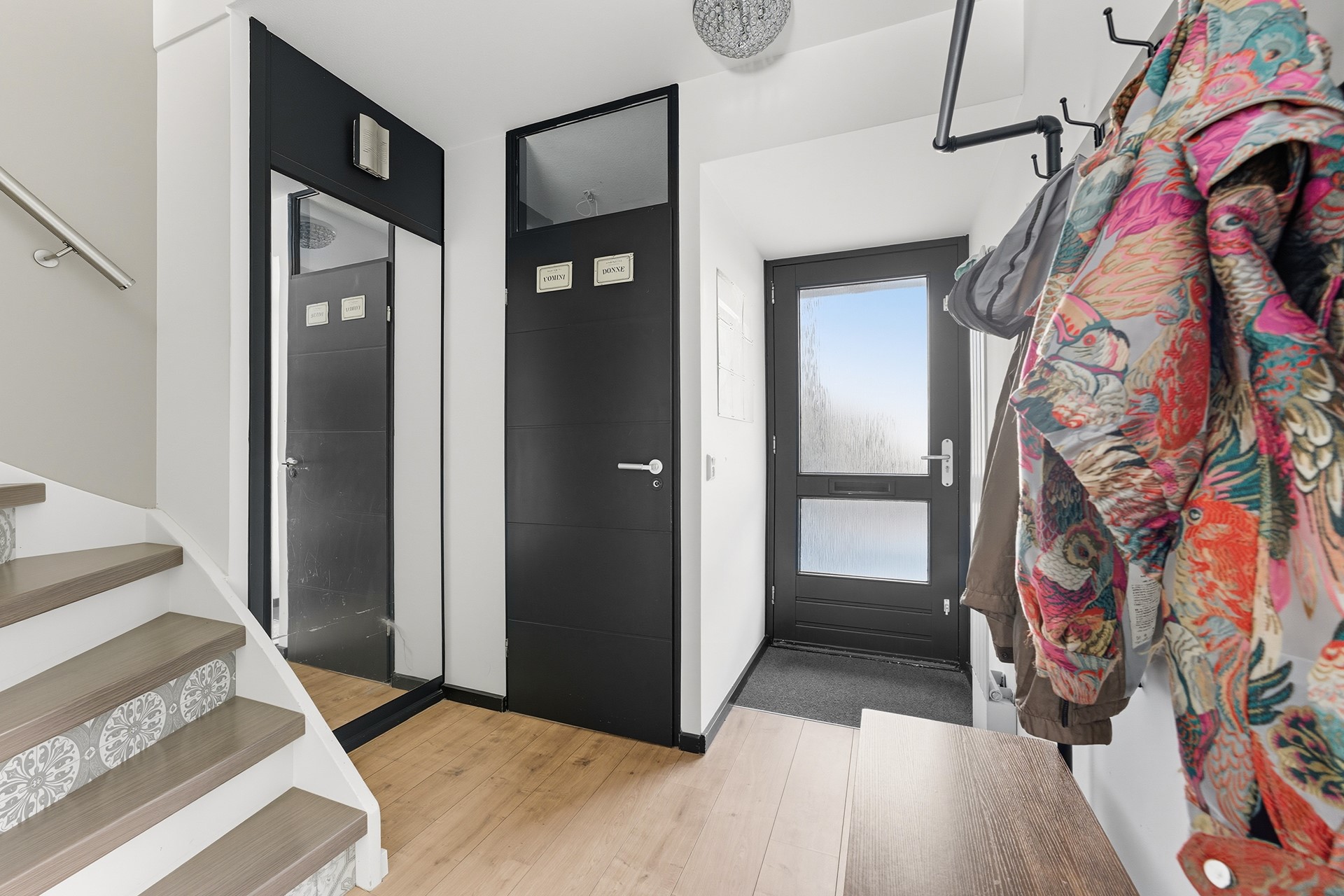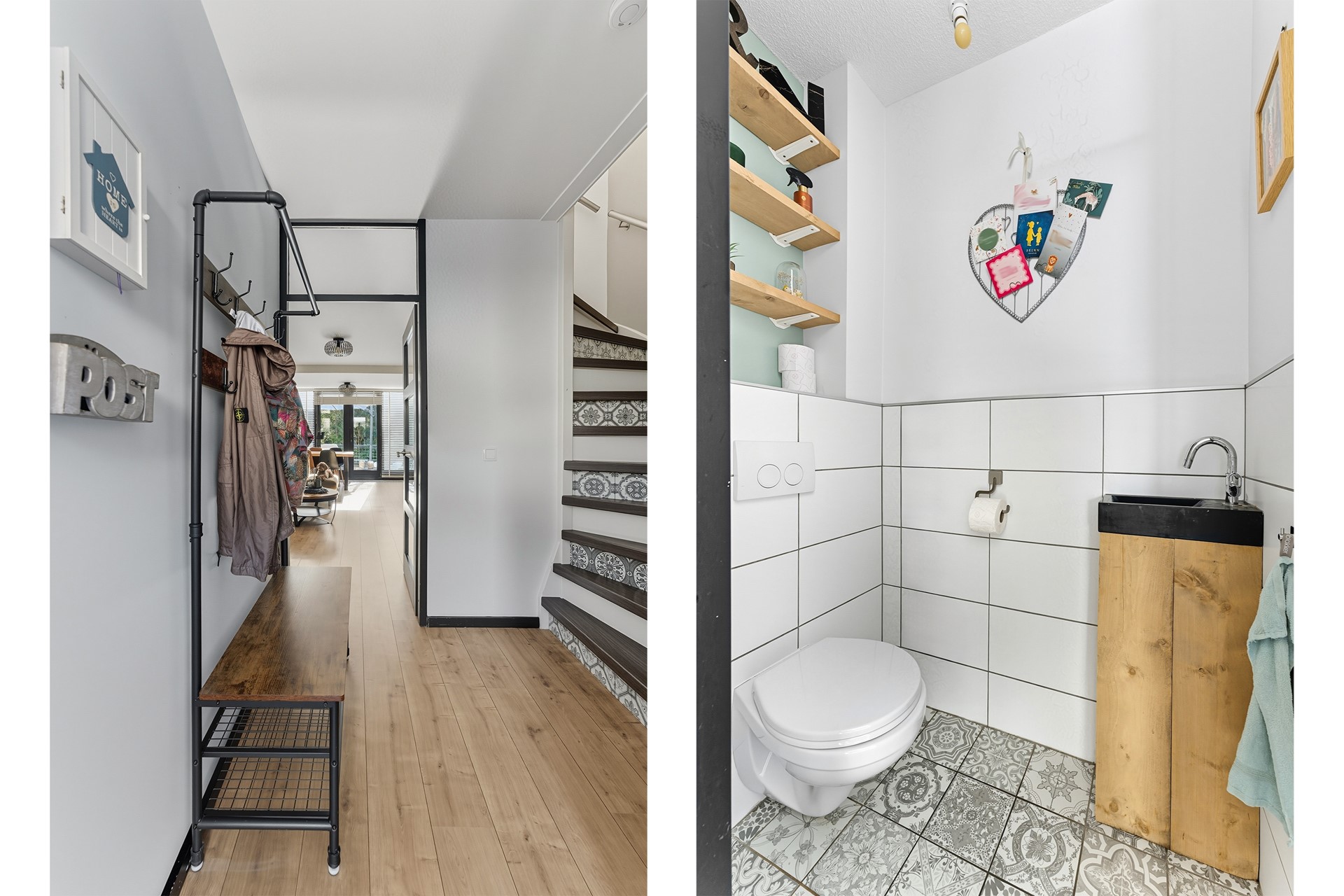 Entree: Zodra je de woning binnenstapt, kom je in de ruime hal met genoeg ruimte voor je jassen, schoenen en tassen. De meterkastdeur is voorzien van een grote spiegel, handig om nog even je kapsel of outfit te checken, voordat je de deur uitgaat. De hal krijgt extra charme door de trap met Portugese tegels. Vanuit de hal heb je toegang tot het toilet en de woonkamer.