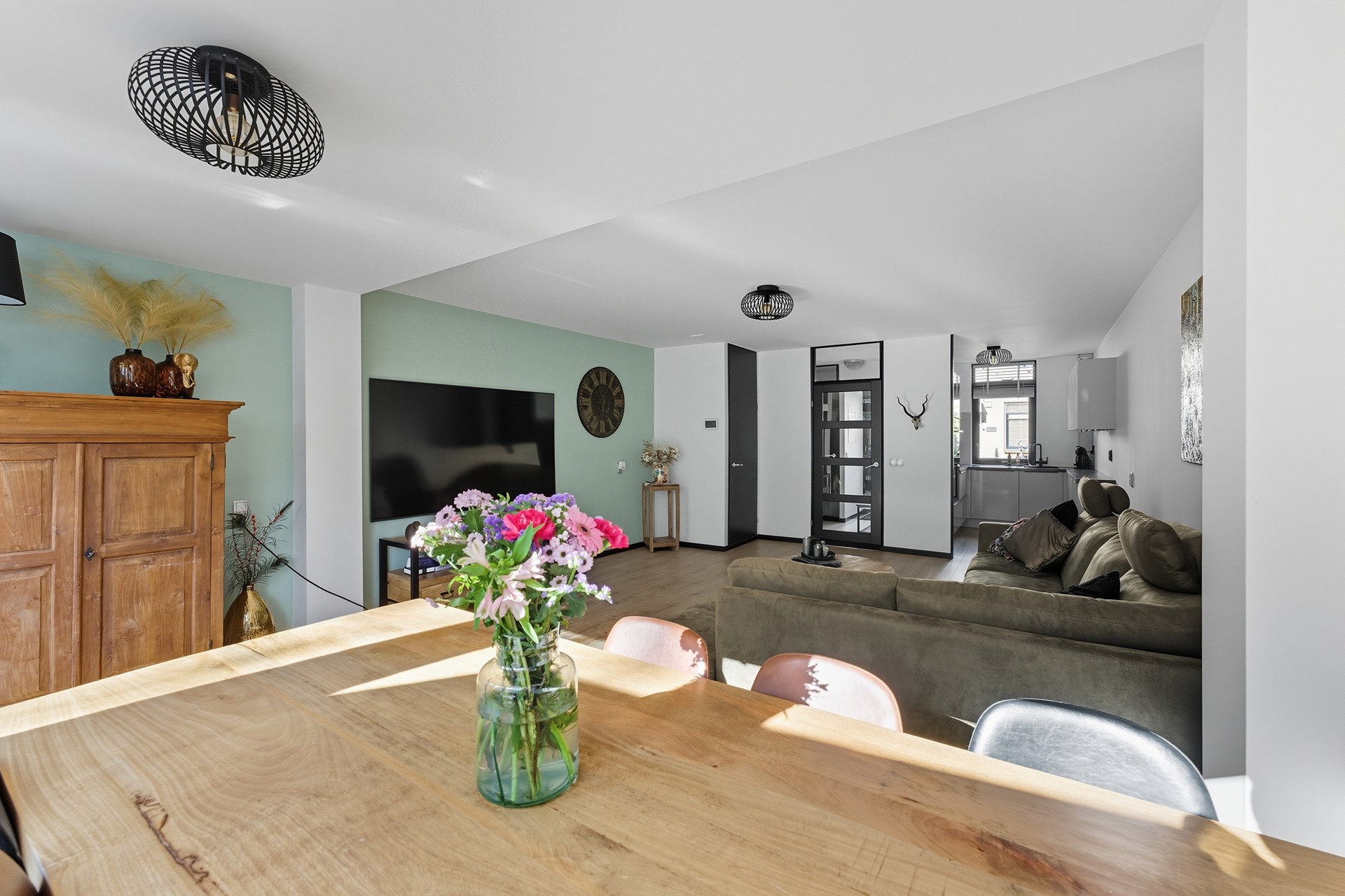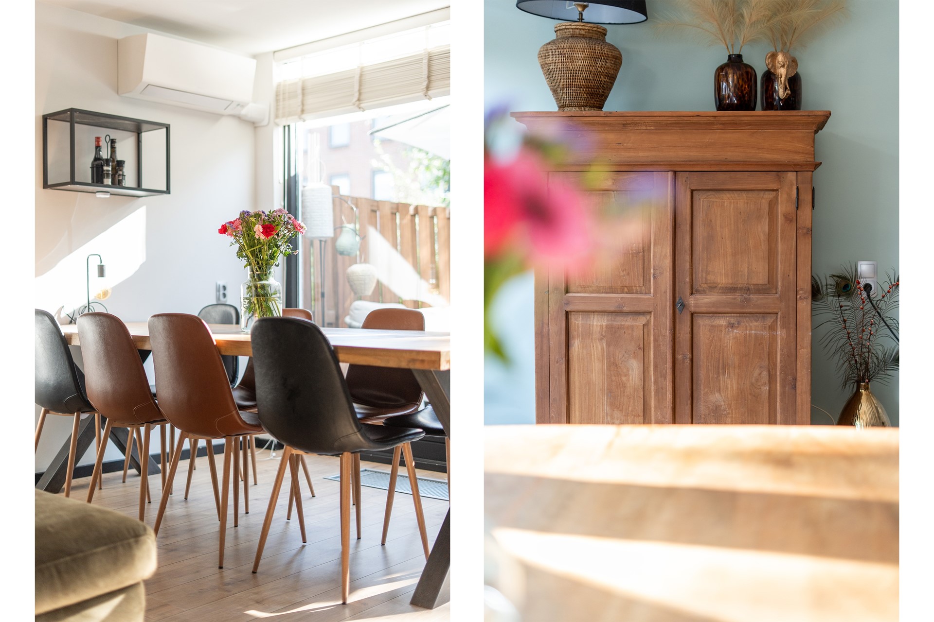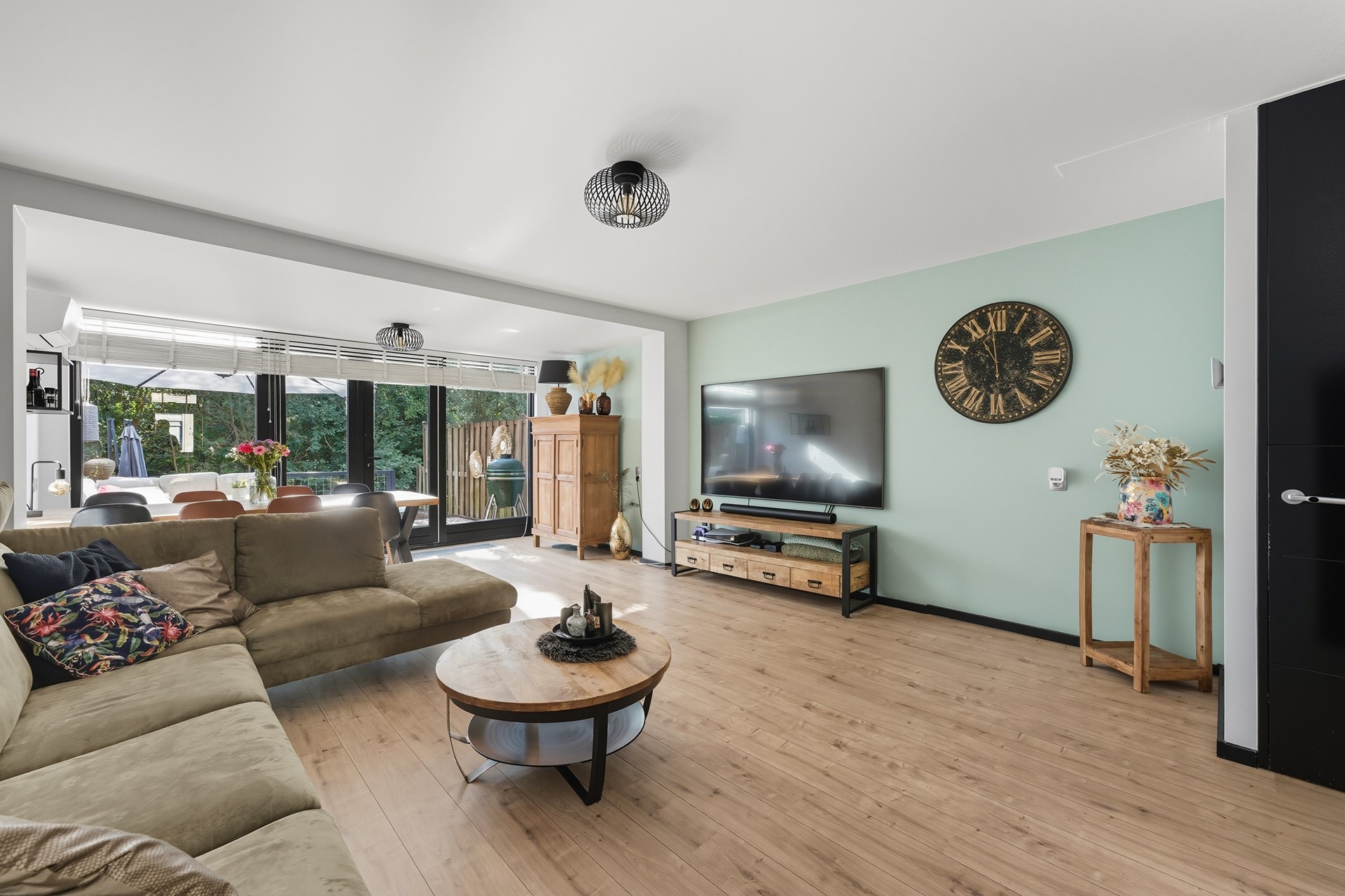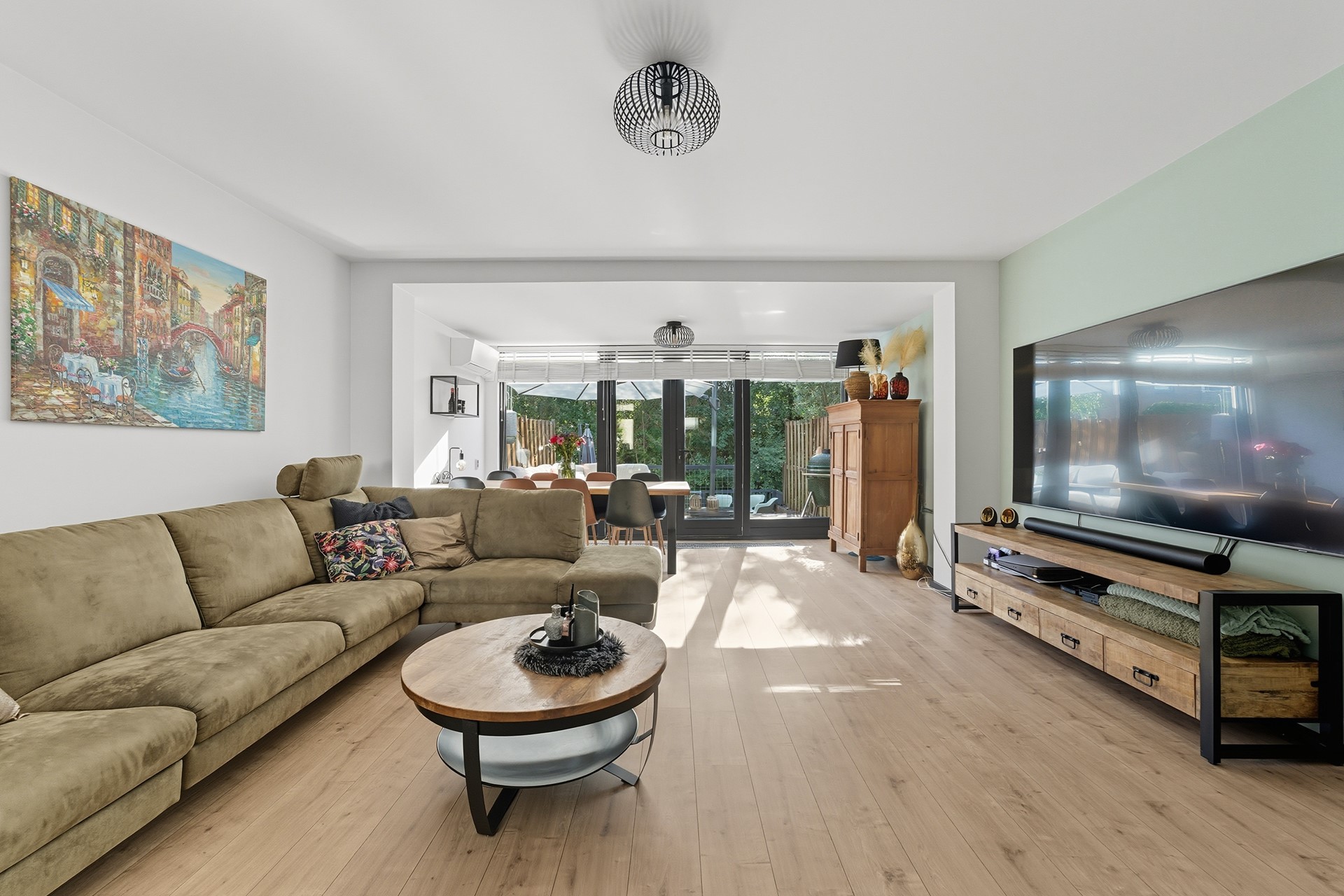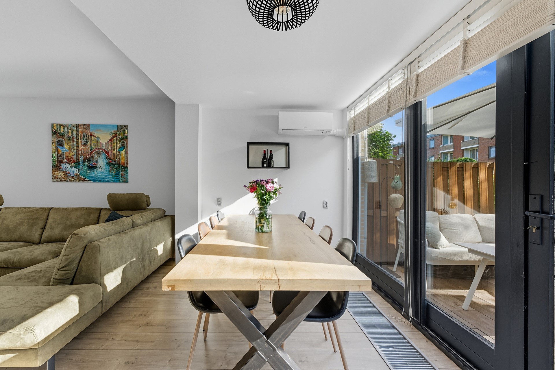 Woonkamer: De tuingerichte woonkamer is heerlijk licht en heeft openslaande deuren naar de achtertuin, zo haal je het buitenleven echt naar binnen. De ruime aanbouw zorgt voor extra leefruimte en de trapkast zorgt voor extra bergruimte. De begane grond is voorzien van airconditioning. Vanuit de woonkamer loop je door naar de moderne keuken. De ruimte is keurig afgewerkt met een spuitwerk plafond, gestuukte wanden en een laminaatvloer.