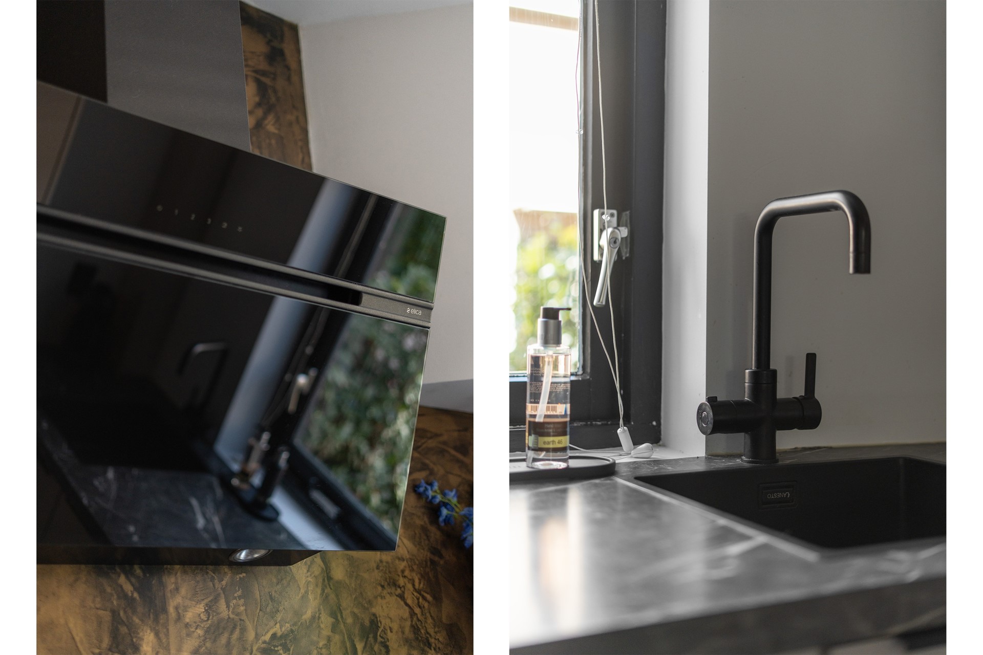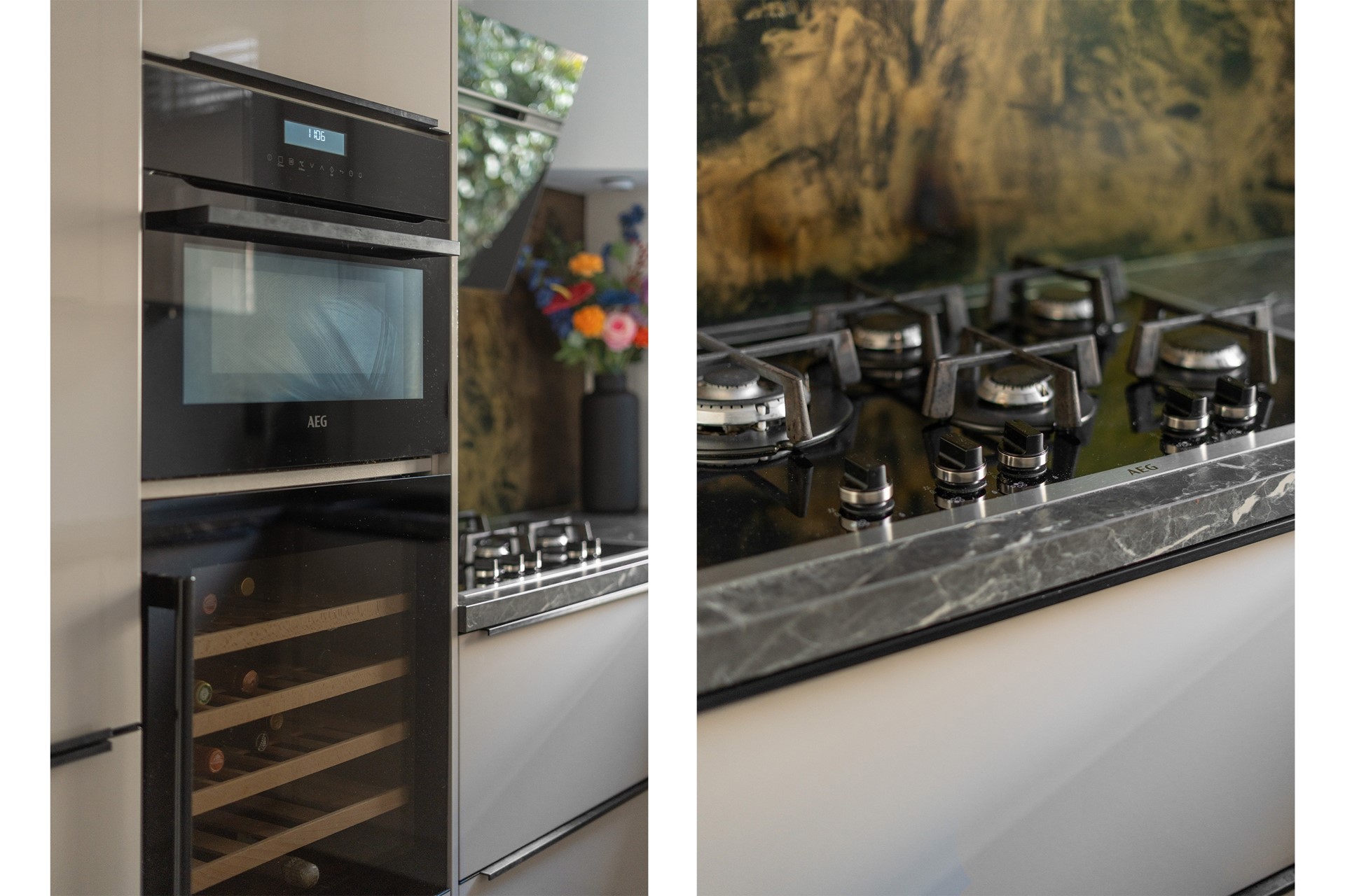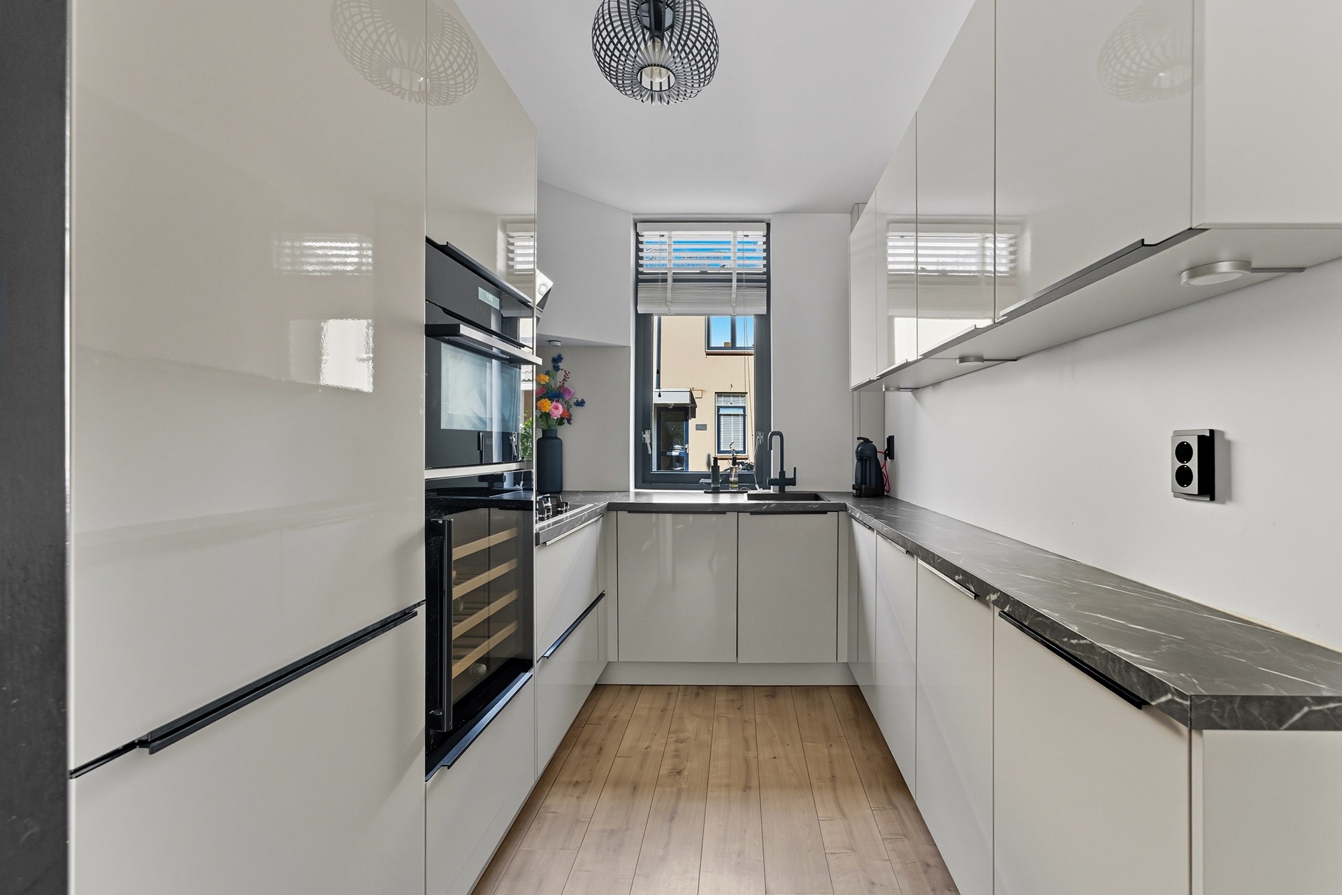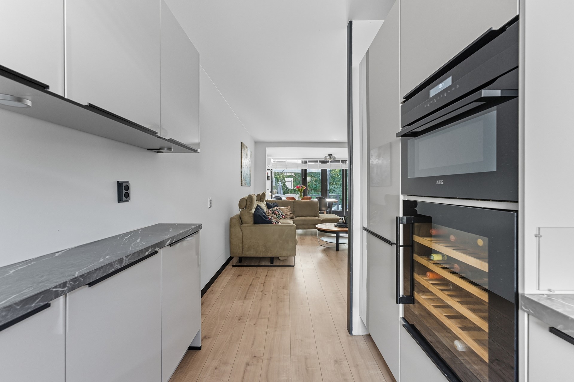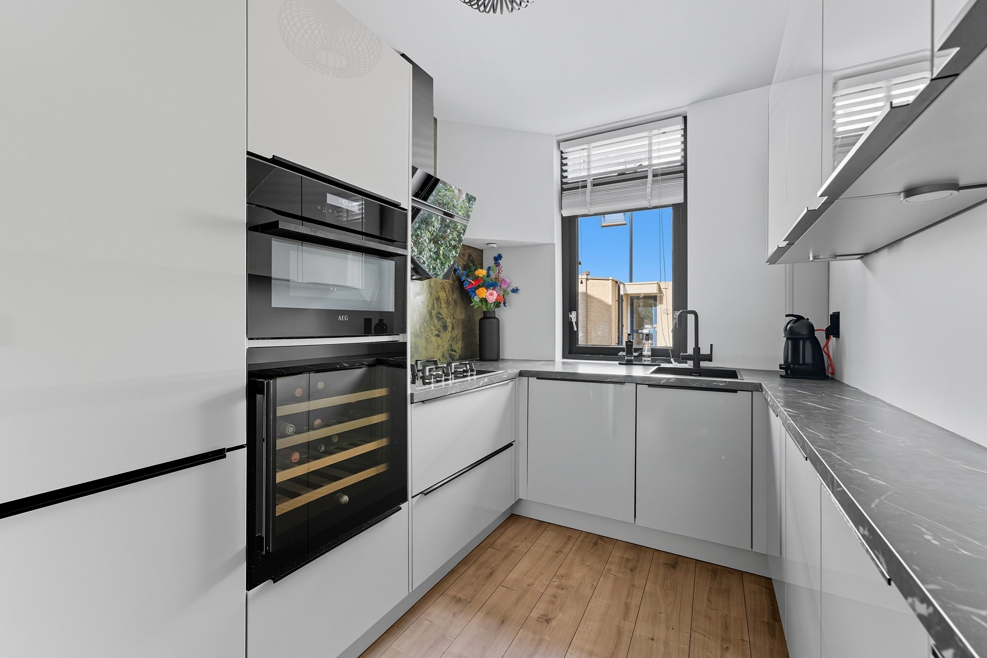 Keuken: Een strakke, praktische en moderne keuken! De keuken uit 2021 is opgesteld in U-vorm en afgewerkt met een marmerlook werkblad. Hier kook je met alle luxe die je wenst: een oven/magnetron combinatie, afzuigkap, koel-/vriescombinatie, 5-pits gasstel, Quooker en de wijnkoeler maakt de luxe compleet. Er is veel bergruimte aanwezig en door het raam kijk je leuk uit op de autovrije straat.