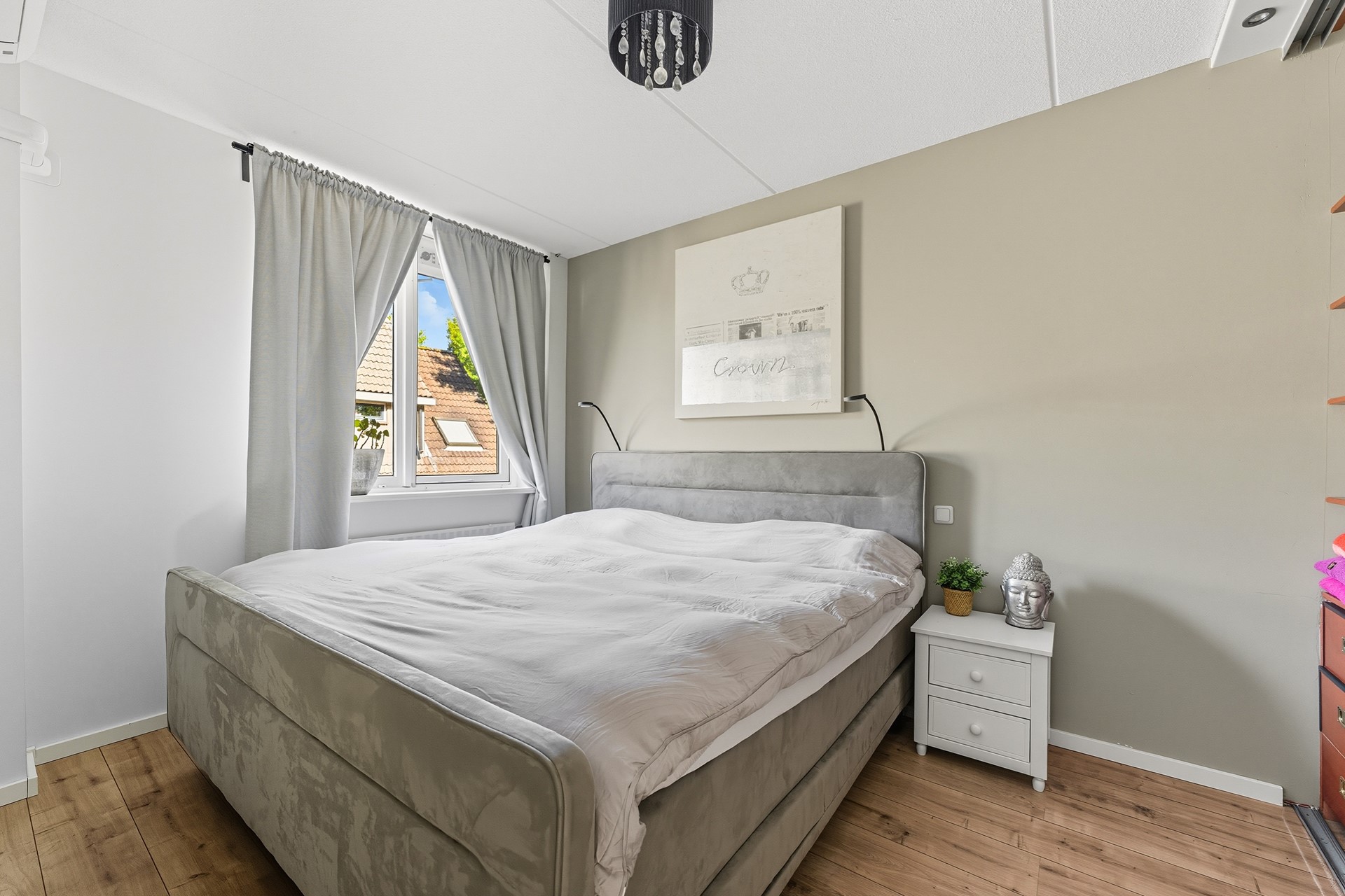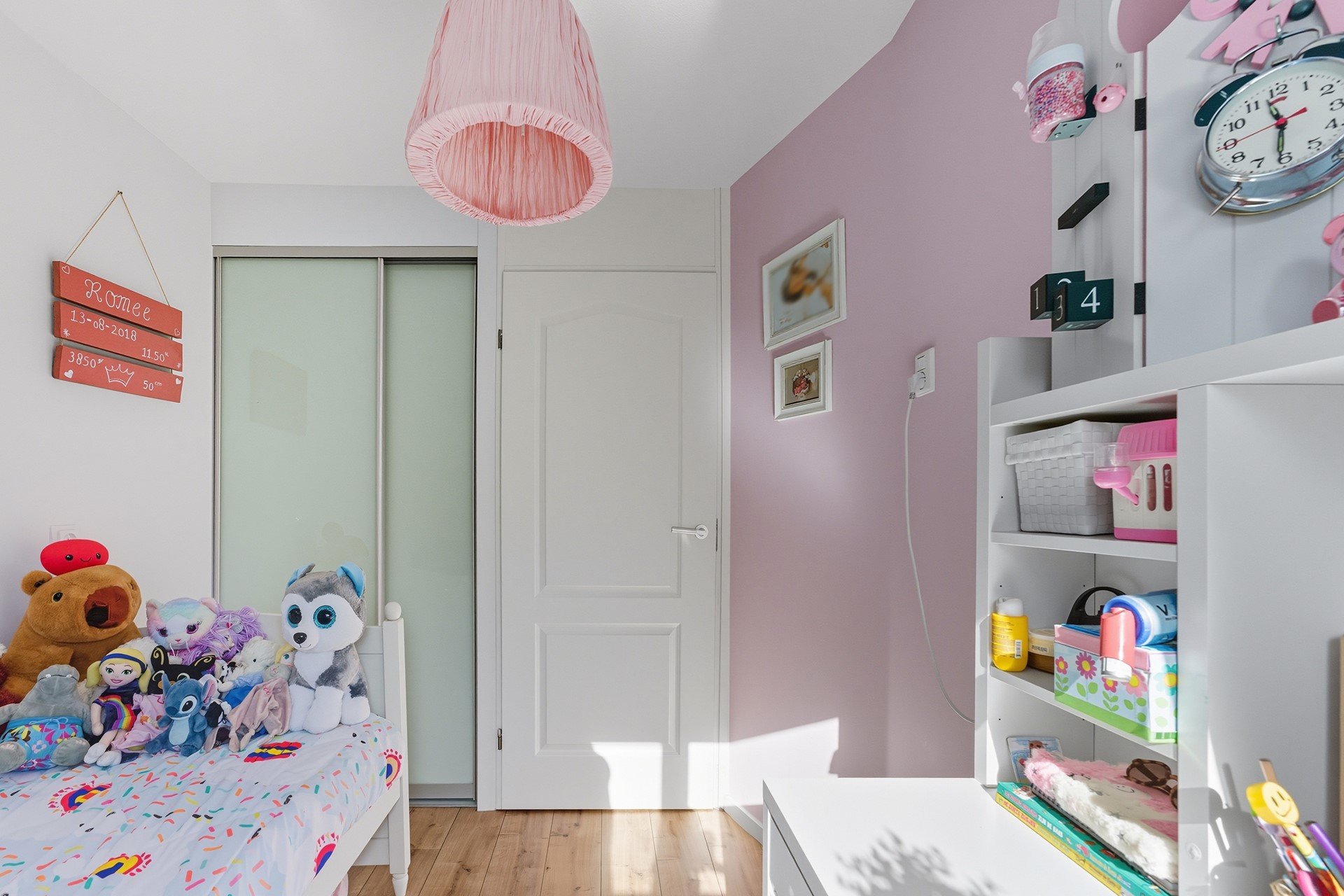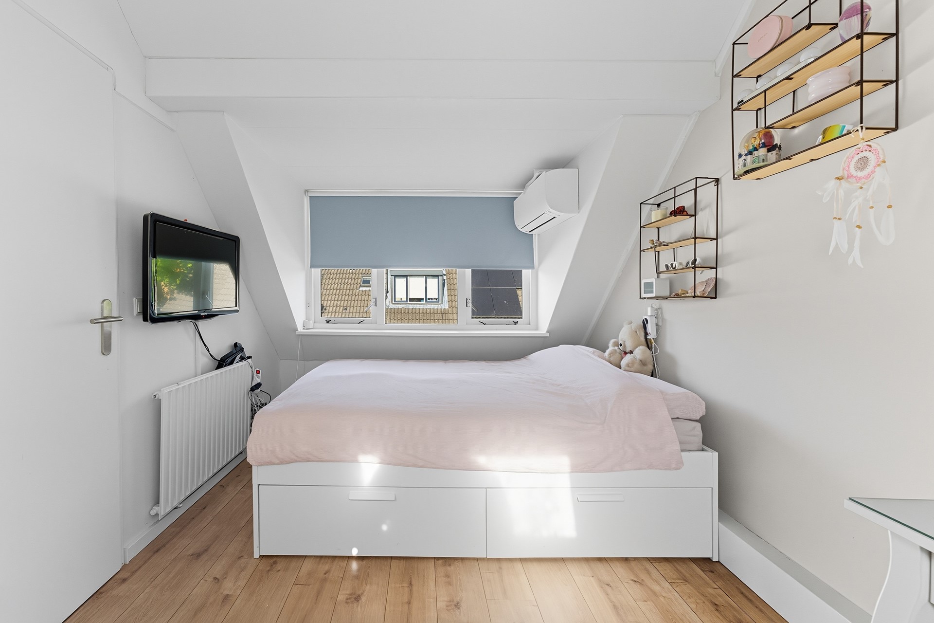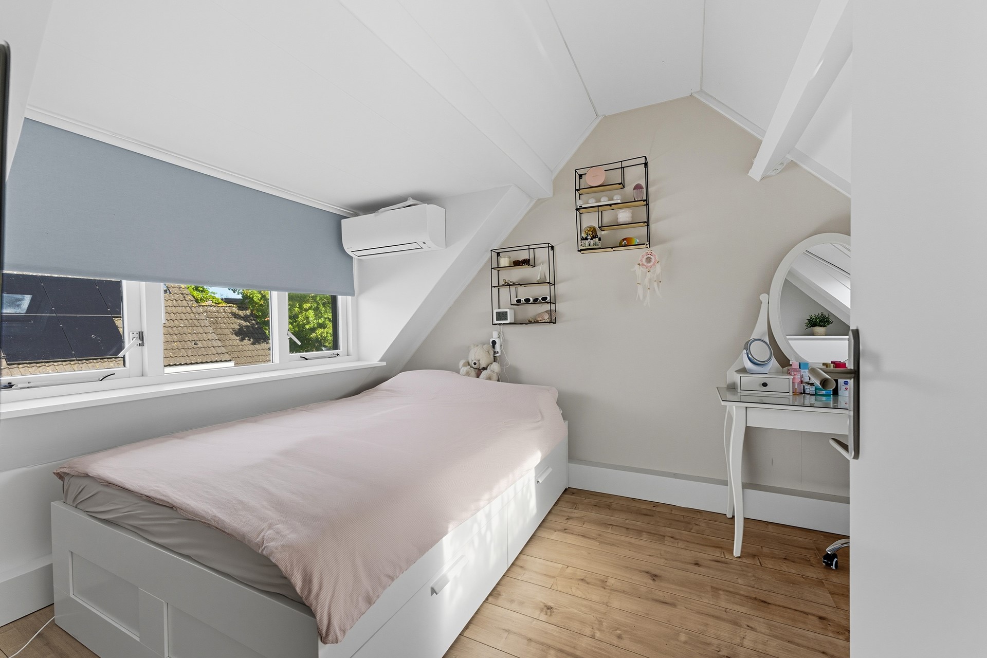 Slaapkamer 4: Lichte en gezellige zolderkamer met een dakkapel aan de voorzijde en een Velux dakraam aan de achterzijde, waardoor er volop daglicht binnenkomt. De knieschotten aan beide zijden bieden handige opbergruimte. De airconditioning zorgt voor een behaaglijke temperatuur. De ruimte is afgewerkt met een laminaatvloer, gipsplafond en voorzien van een rolluik.