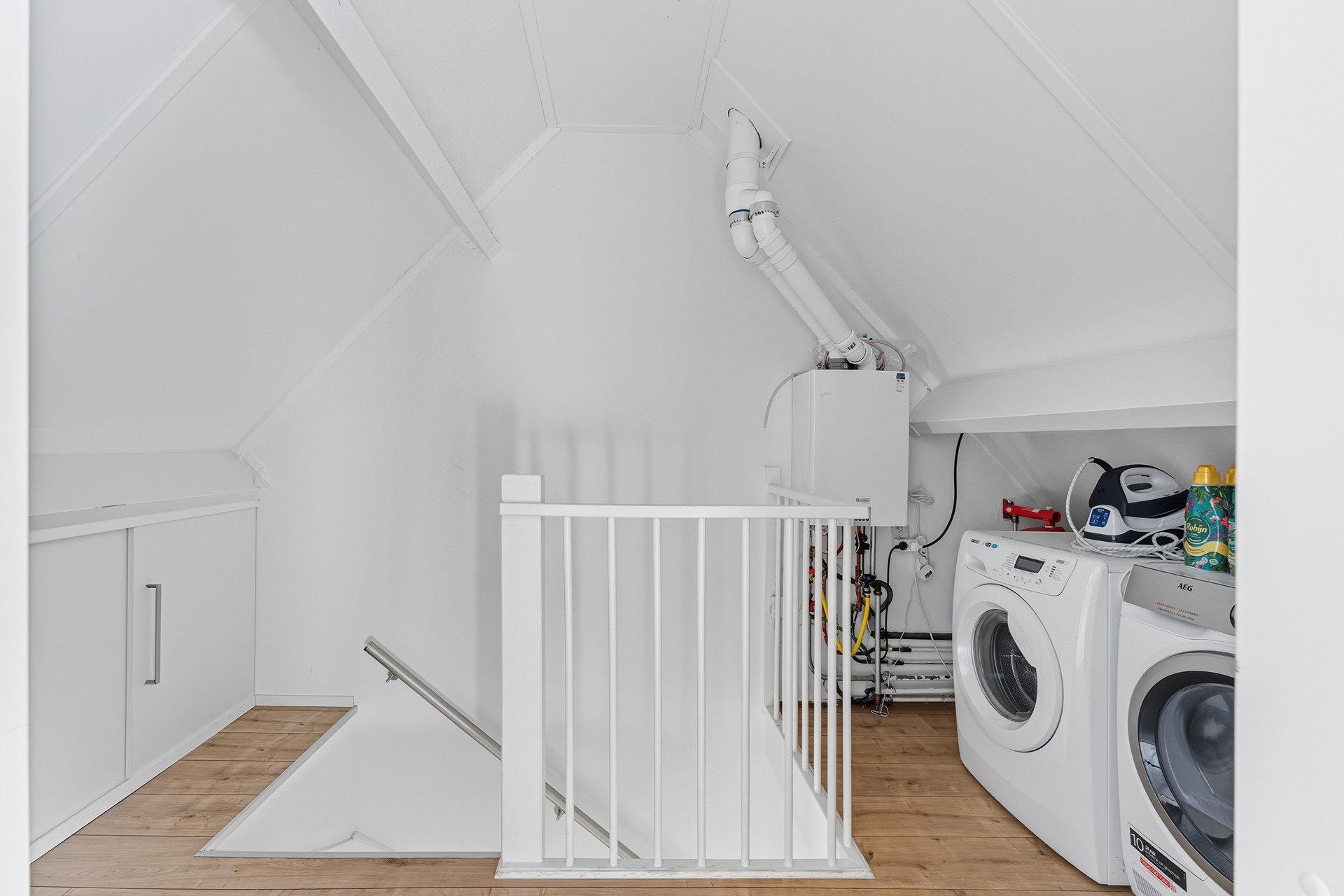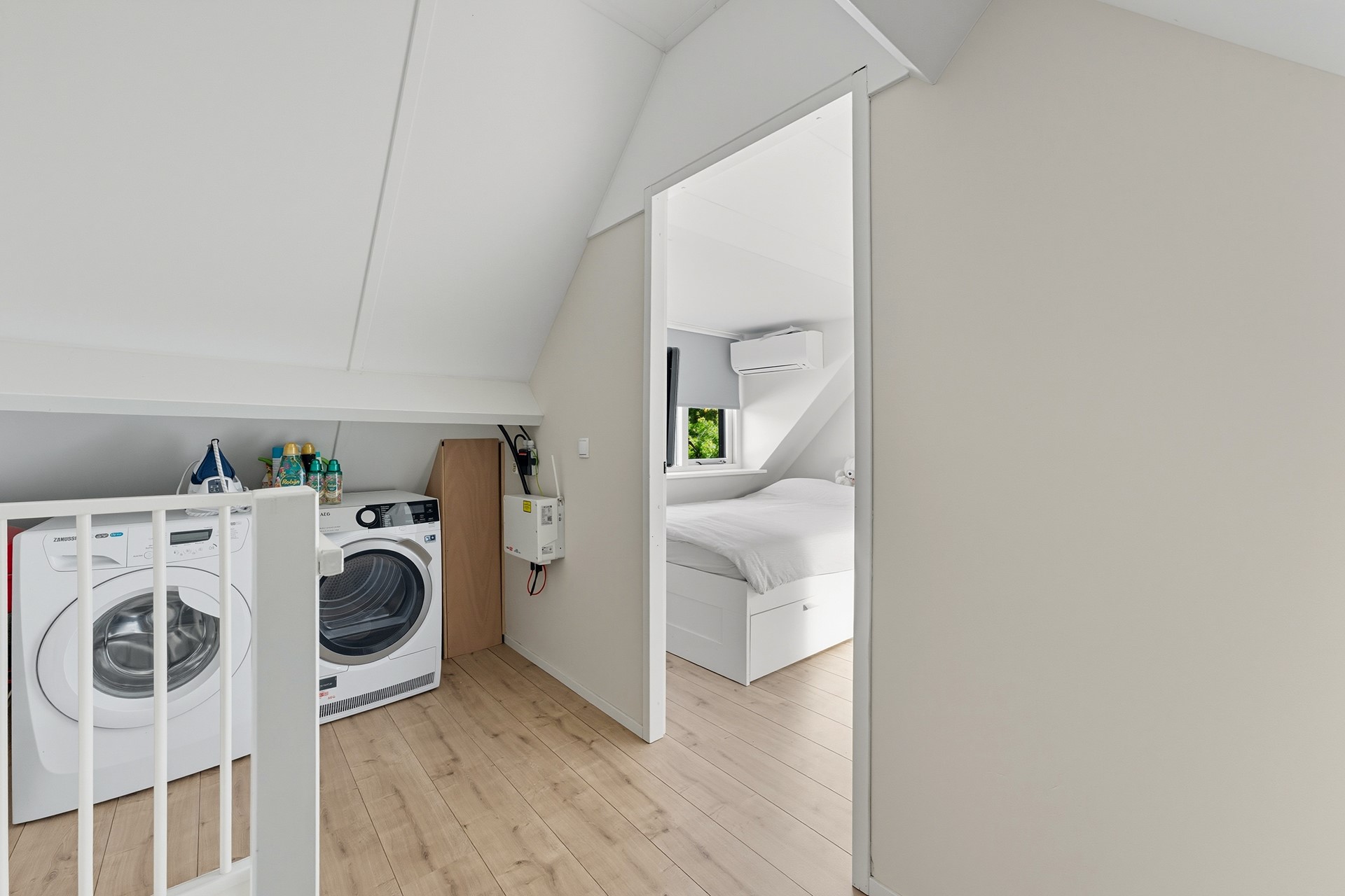 Voorzolder: Royale en hoge voorzolder met volop ruimte om de was te doen en spullen op te bergen, zoals schaatsen of vakantiespullen. Hier vind je ook de Cv-ketel, de omvormer van de zonnepanelen en de aansluitingen voor wasmachine en droger. Via een deur loop je zo naar slaapkamer vier. De ruimte is netjes afgewerkt met een laminaatvloer, gestuukte wanden en een gipsplafond, waardoor het een frisse en lichte indruk maakt.
