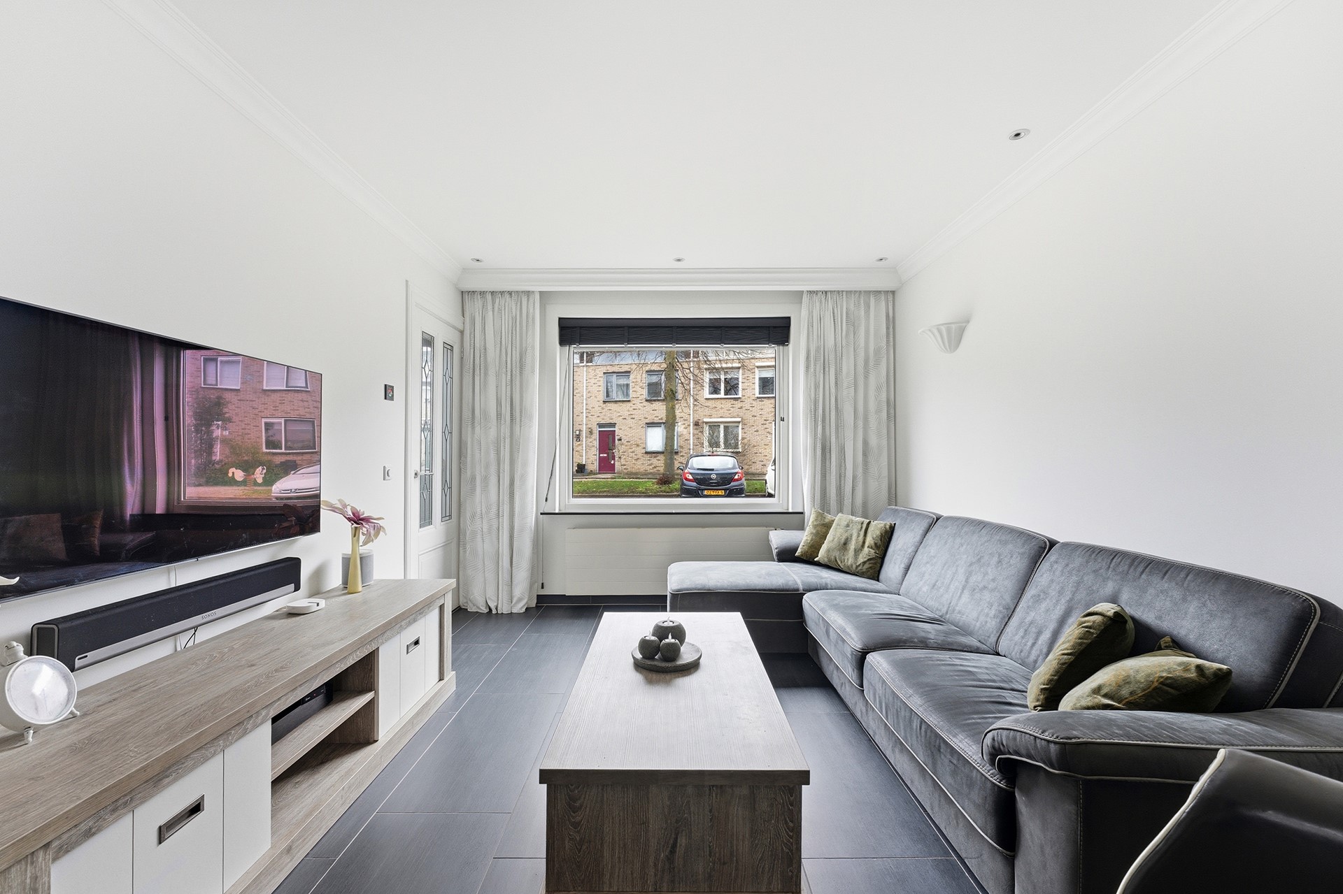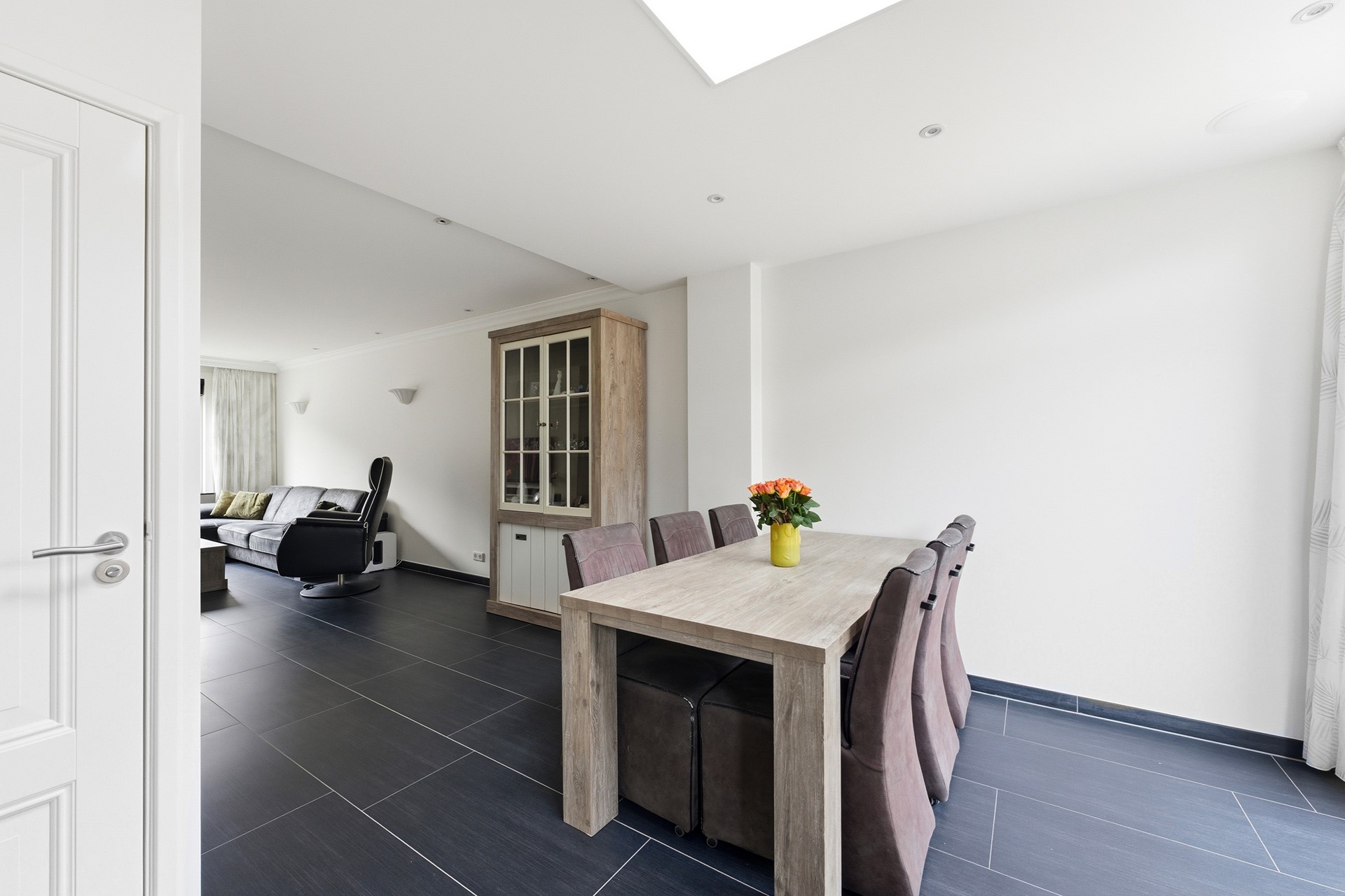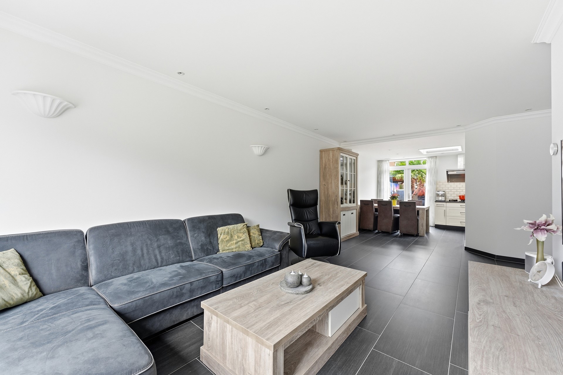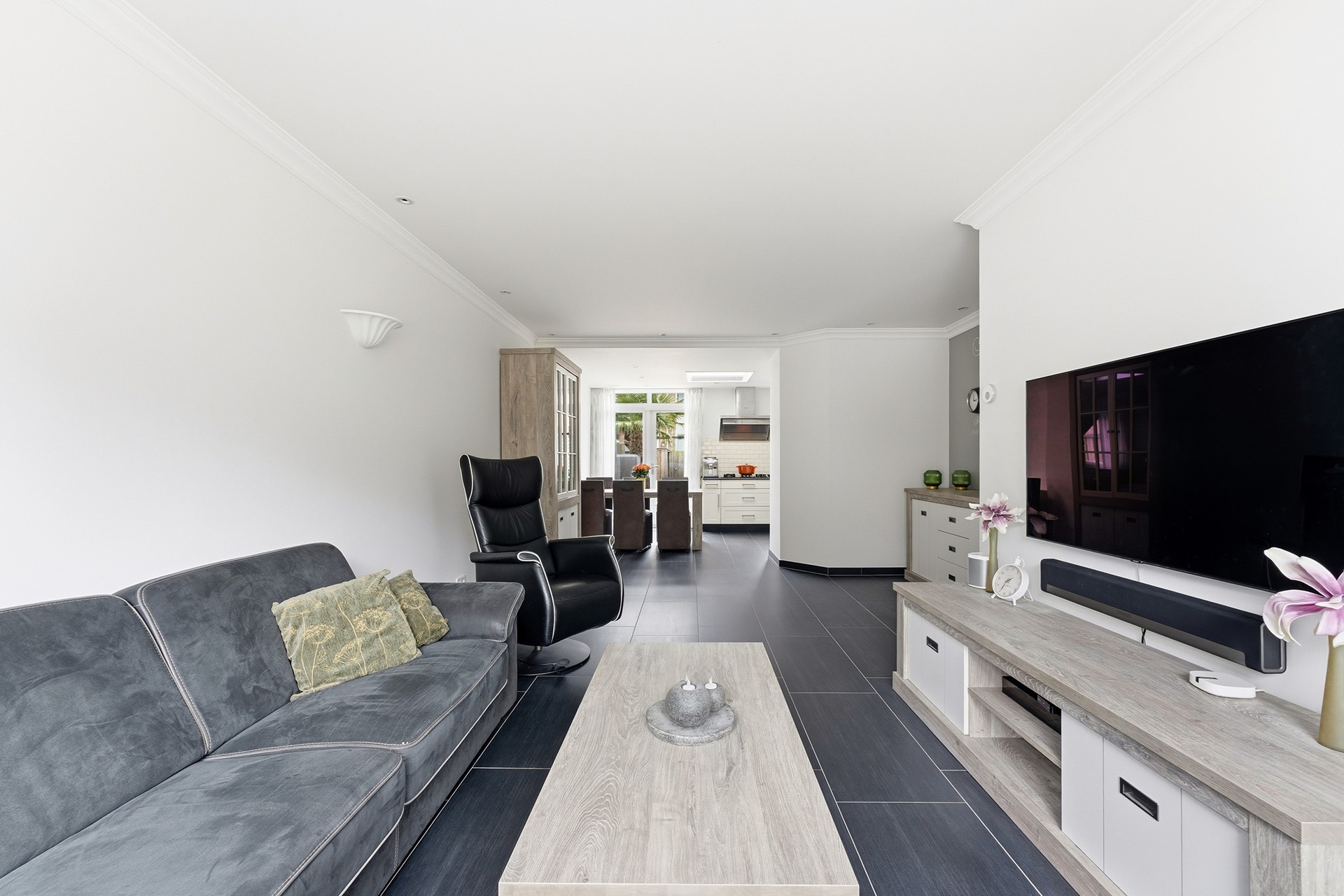 Woonkamer: De woonkamer vormt samen met de open keuken een prettige leefruimte. In de woonkamer is een trapkast aanwezig voor extra bergruimte. De begane grond is voorzien van vloerverwarming. Inbouwspots met RGB-verlichting zorgen voor verschillende lichtinstellingen. De ruimte is afgewerkt met een plavuizenvloer en gestuukte wanden en plafond.