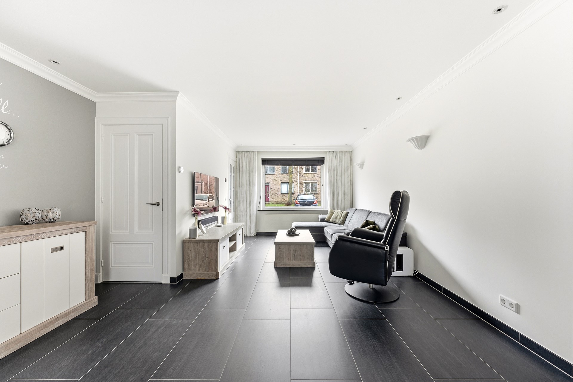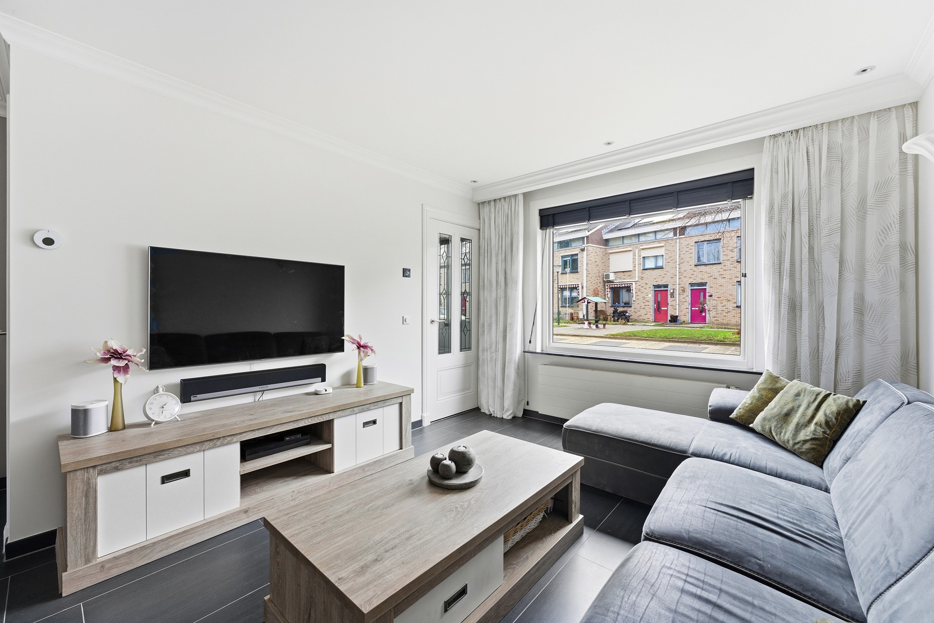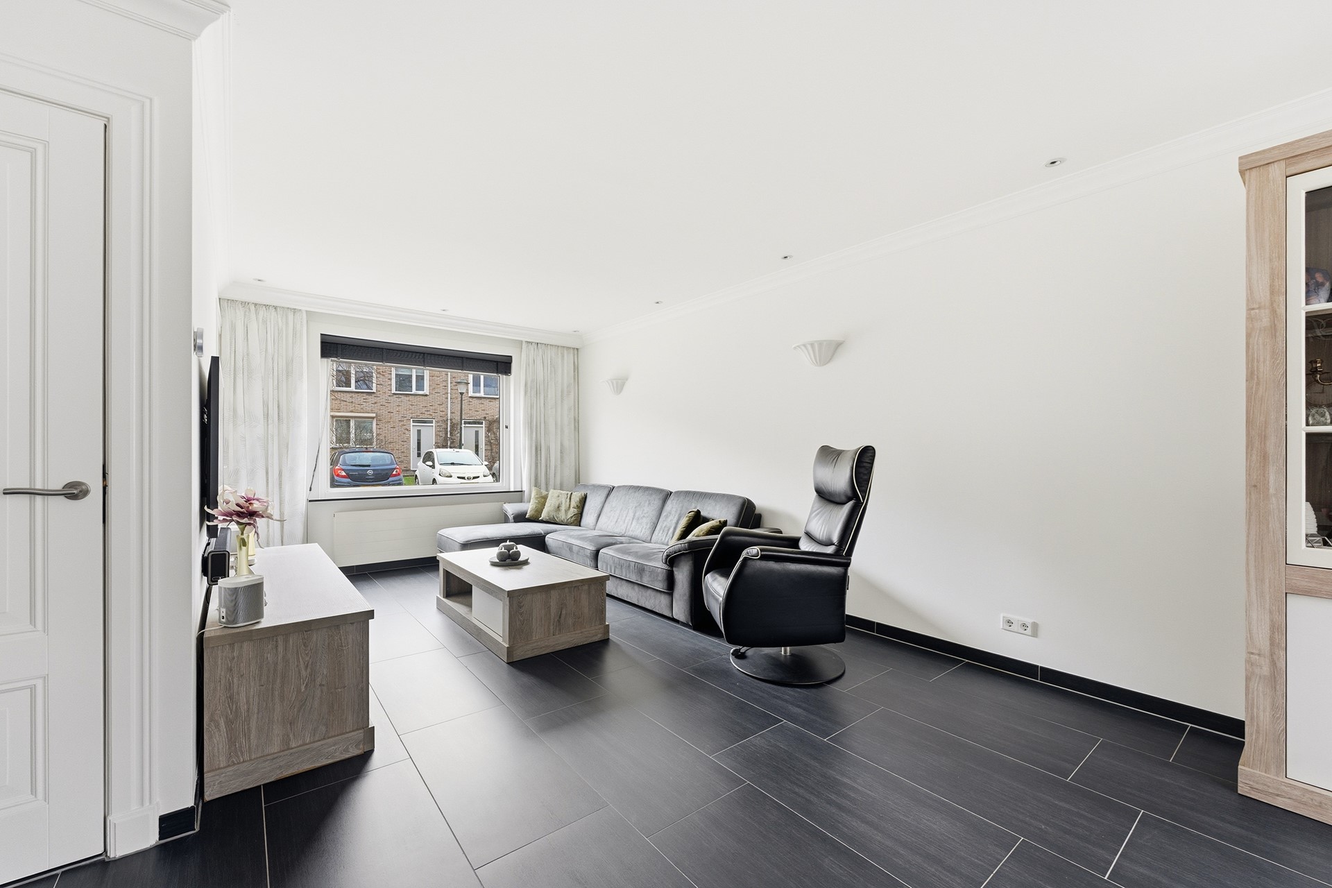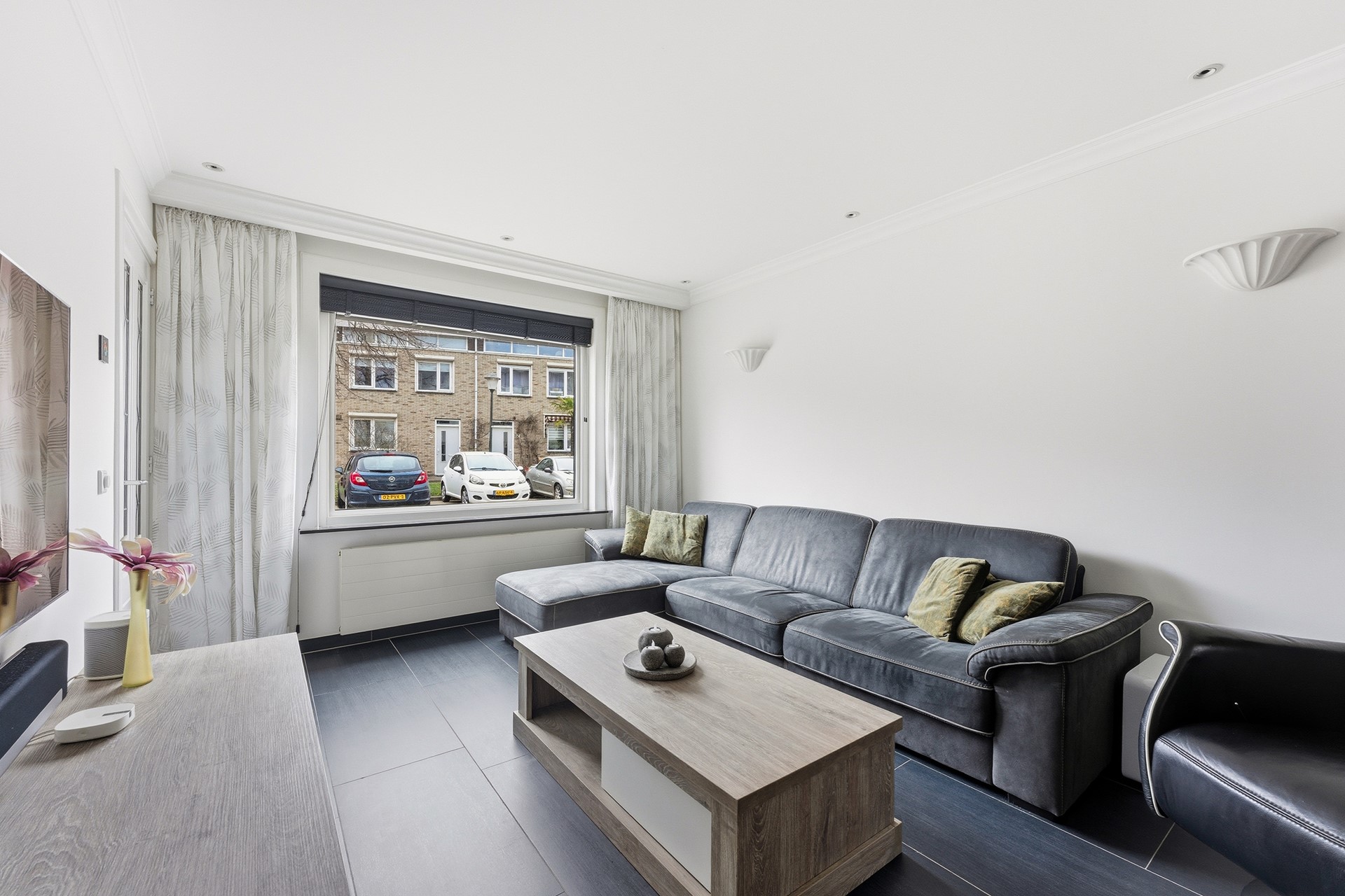 Woonkamer: De woonkamer vormt samen met de open keuken een prettige leefruimte. In de woonkamer is een trapkast aanwezig voor extra bergruimte. De begane grond is voorzien van vloerverwarming. Inbouwspots met RGB-verlichting zorgen voor verschillende lichtinstellingen. De ruimte is afgewerkt met een plavuizenvloer en gestuukte wanden en plafond.