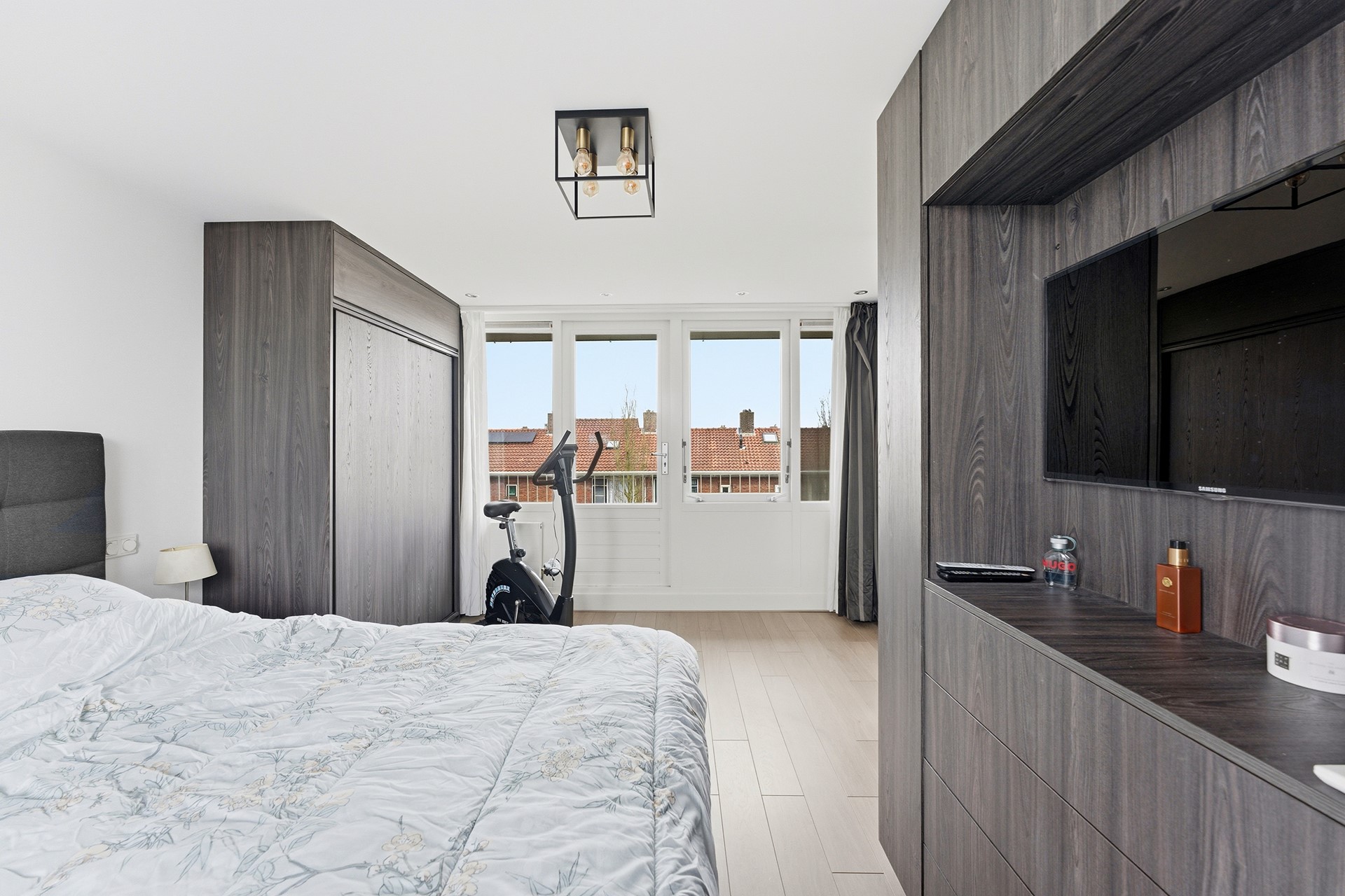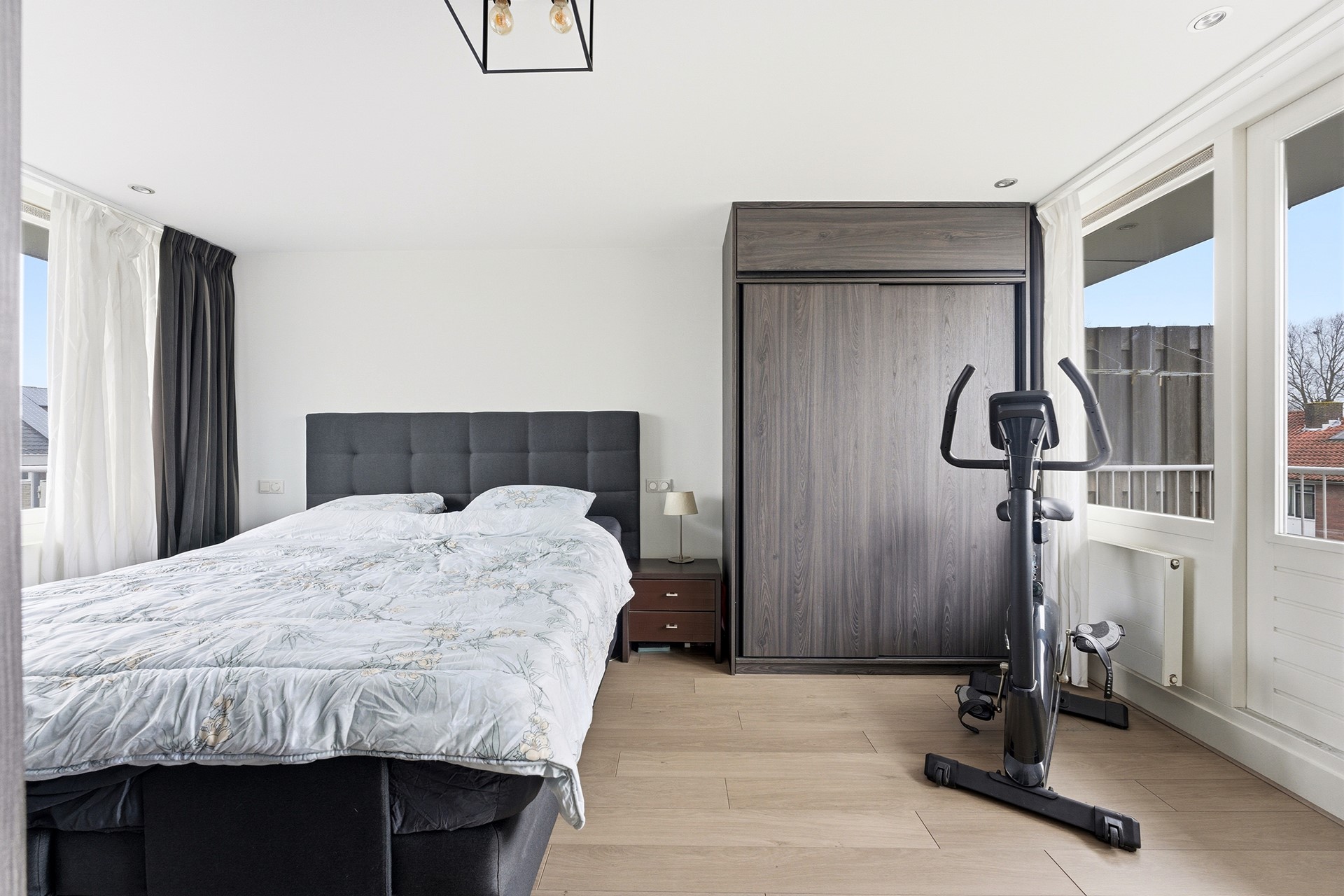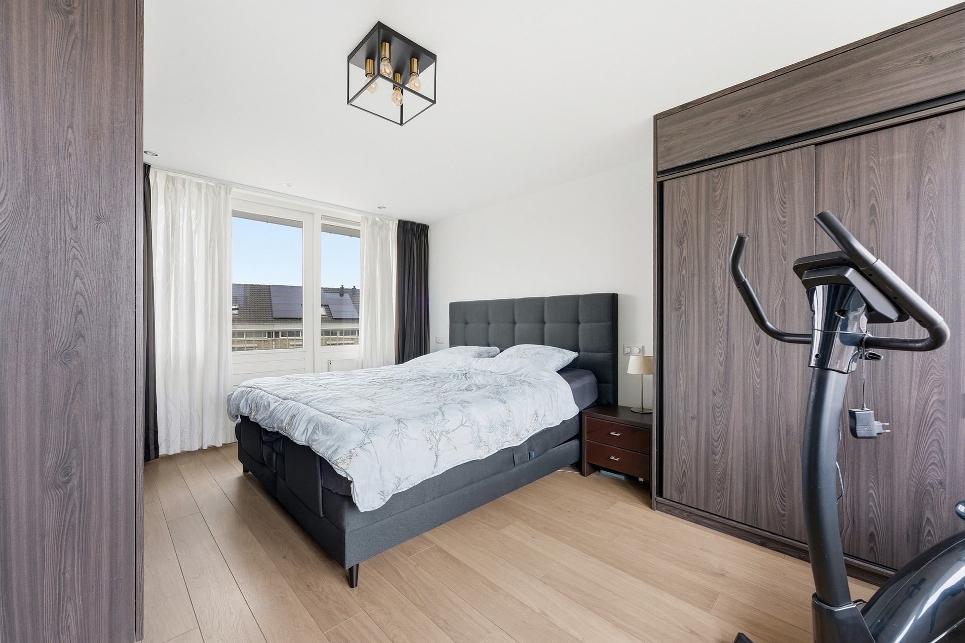 Slaapkamer 4: Dankzij de opbouw is er een extra verdieping gecreëerd. De tweede verdieping is ingericht als grote slaapkamer en beschikt over drie vaste kasten waarvan één is ingericht als tv-meubel. Er is airconditioning aanwezig en via deuren is er toegang tot twee balkons. Eén aan de voorzijde op het noordwesten en één aan de achterzijde op het zuidoosten. Zo kun je zelf kiezen waar de zon staat, even buiten zitten, de was ophangen of een frisse neus halen voor het slapen gaan. Vanuit deze ruimte is tevens de technische ruimte bereikbaar. De vloer is afgewerkt met laminaat en de wanden en het plafond zijn gestuukt.