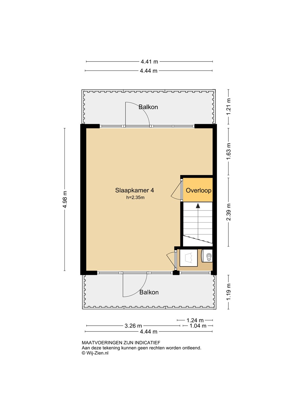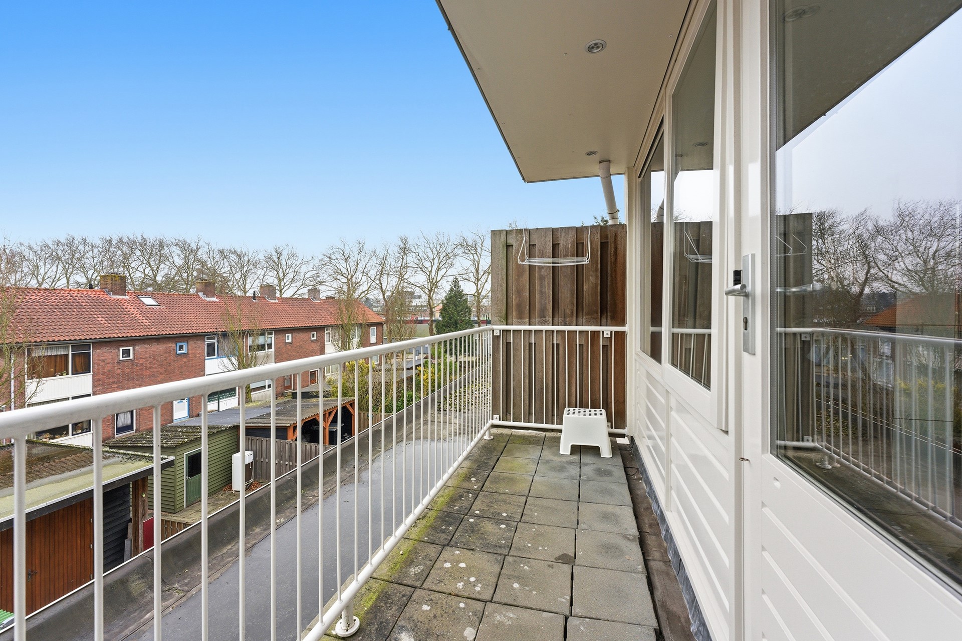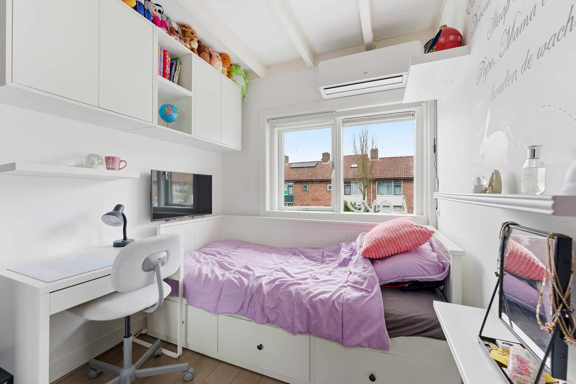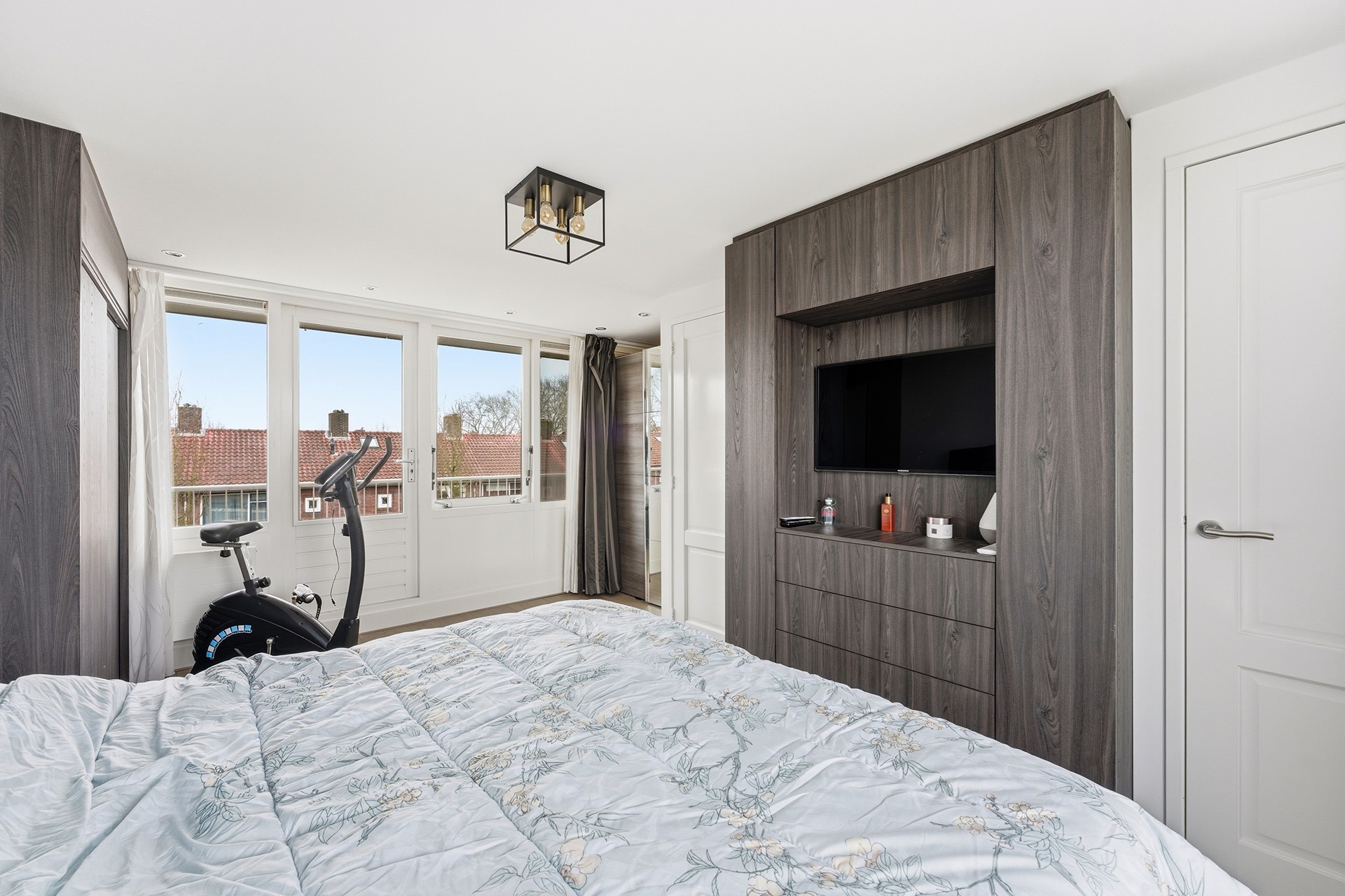 Slaapkamer 4: Dankzij de opbouw is er een extra verdieping gecreëerd. De tweede verdieping is ingericht als grote slaapkamer en beschikt over drie vaste kasten waarvan één is ingericht als tv-meubel. Er is airconditioning aanwezig en via deuren is er toegang tot twee balkons. Eén aan de voorzijde op het noordwesten en één aan de achterzijde op het zuidoosten. Zo kun je zelf kiezen waar de zon staat, even buiten zitten, de was ophangen of een frisse neus halen voor het slapen gaan. Vanuit deze ruimte is tevens de technische ruimte bereikbaar. De vloer is afgewerkt met laminaat en de wanden en het plafond zijn gestuukt.