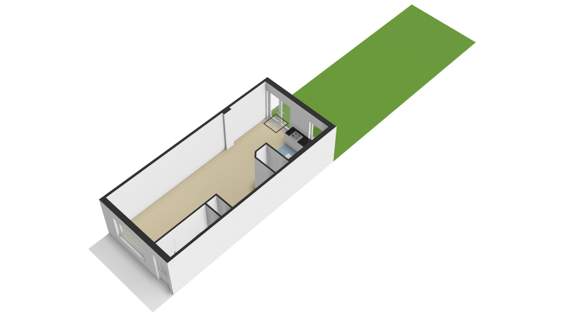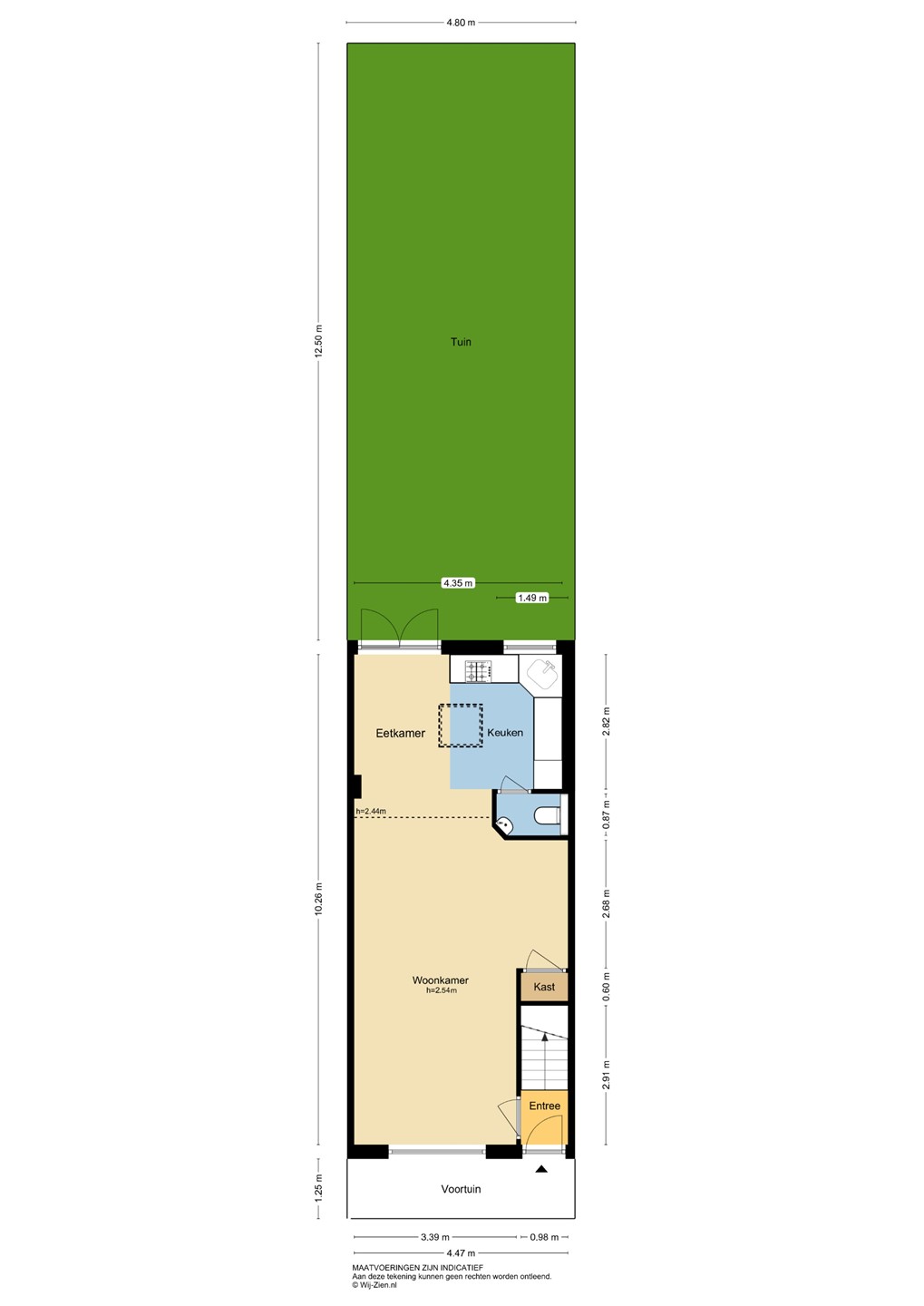 Voortuin: De voortuin ligt op het noordwesten en heeft een afmeting van circa 0,5 x 4,8 meter. Er is ruimte om een bankje te plaatsen of een mooie bloempot neer te zetten, waardoor de entree van de woning verzorgd oogt.