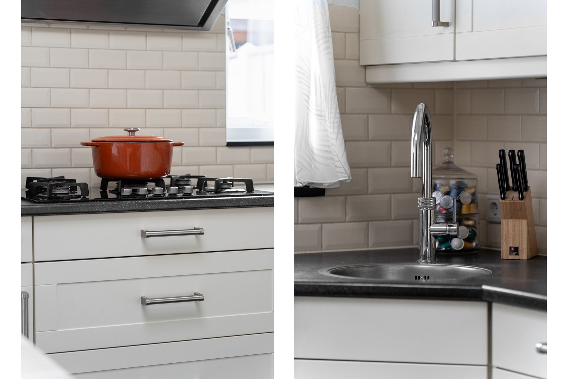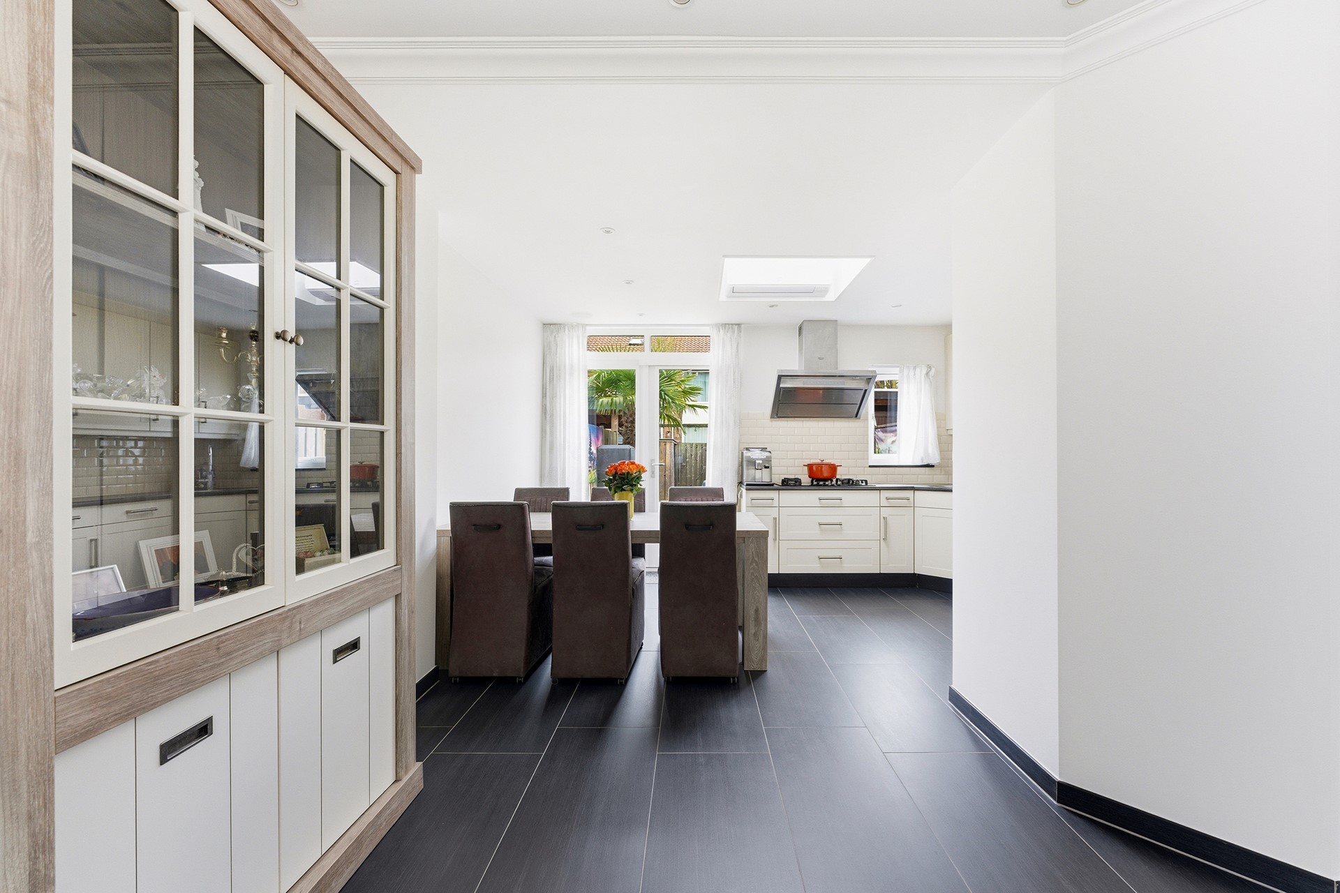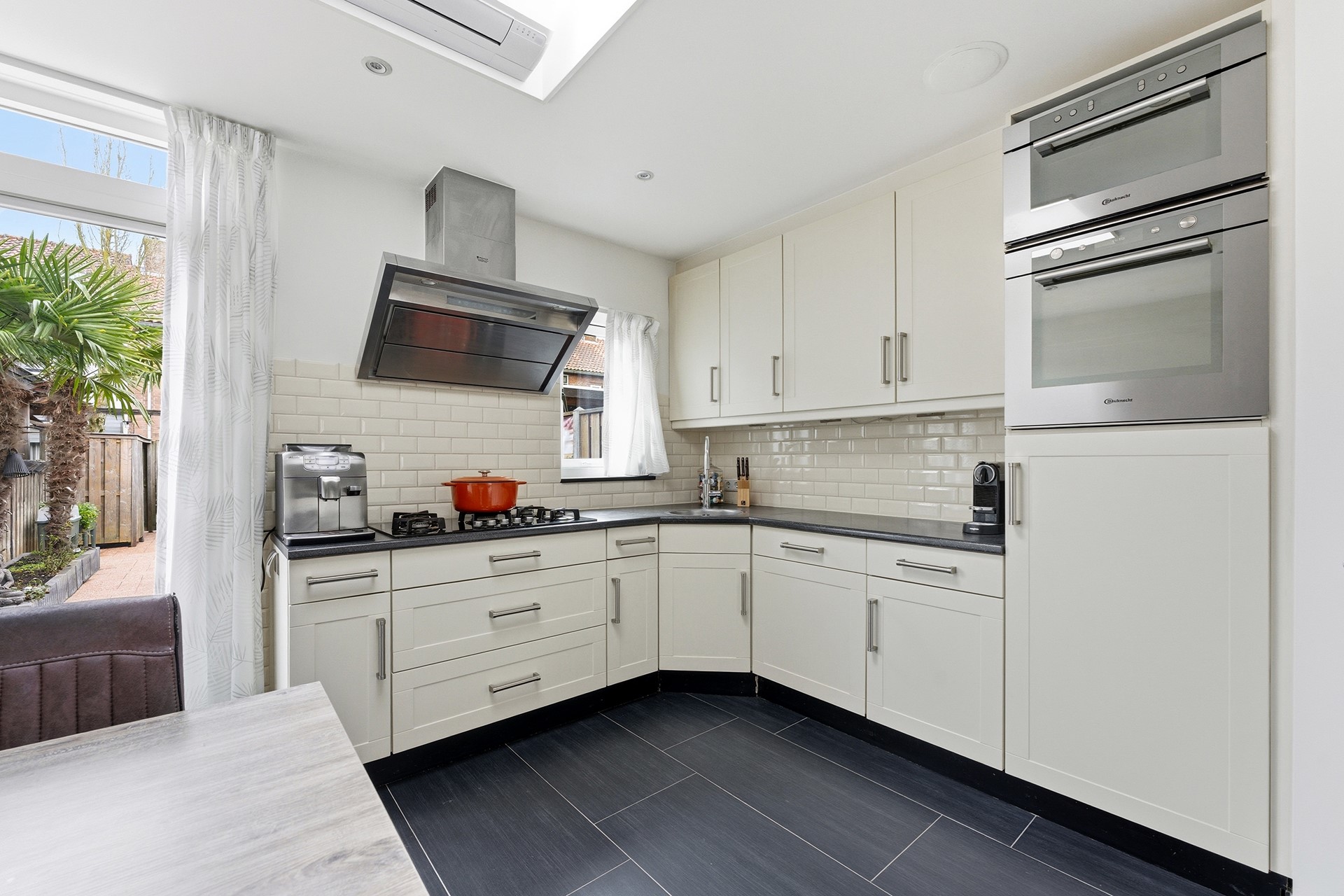 Keuken: De open keuken is geplaatst in de aanbouw en beschikt over openslaande deuren naar de achtertuin. De lichtkoepel met triple glas zorgt voor extra daglicht. De keuken is voorzien van een oven, oven/magnetroncombinatie, koelkast, vaatwasser, 5-pits gasstel op glas en een afzuigkap. Daarnaast is er airconditioning aanwezig en een elektrisch zonnescherm aan de achterzijde. De ruimte is afgewerkt met plavuizen en gestuukte wanden en plafond.