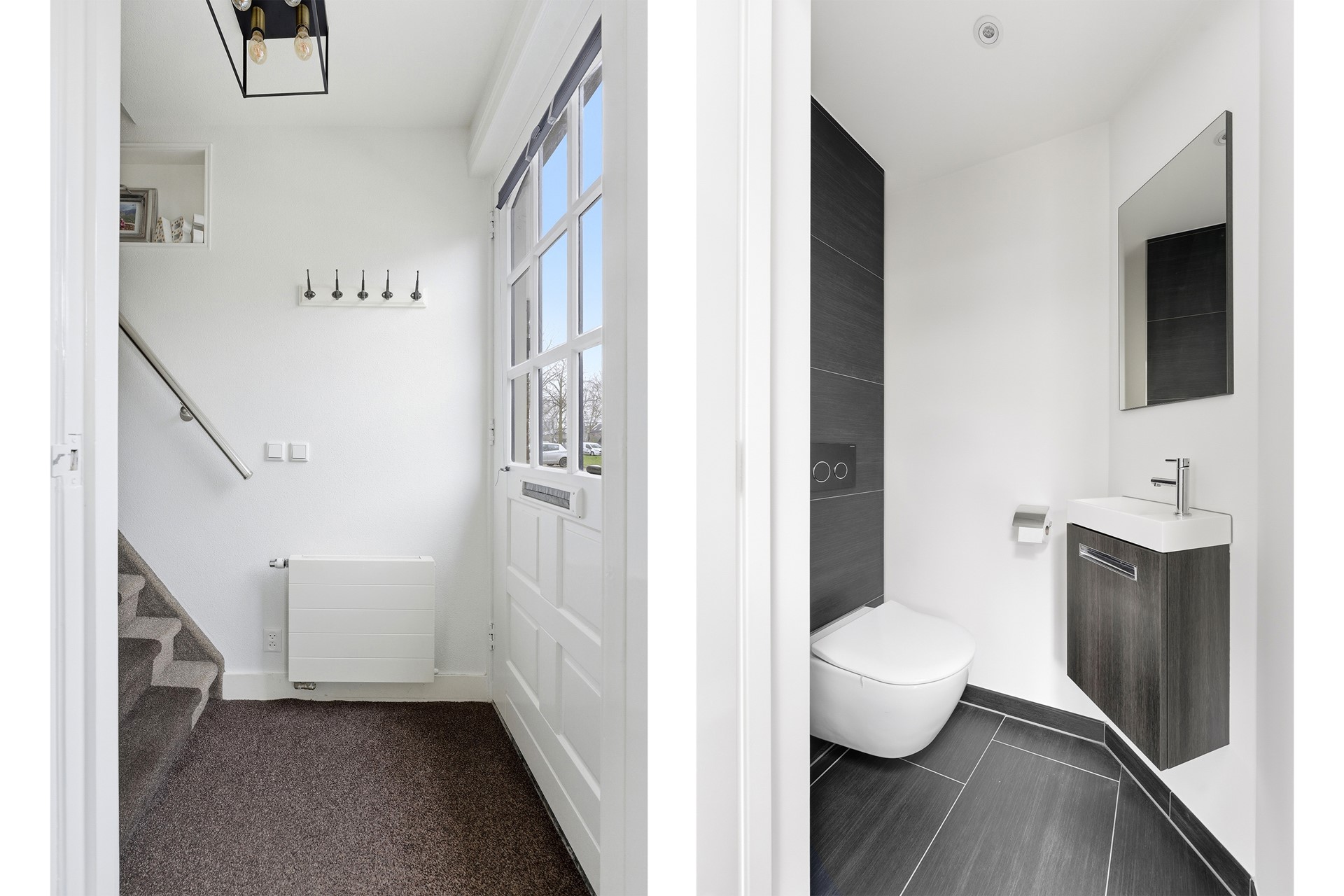 Entree: Via de voordeur bereik je de hal met directe trapopgang naar de eerste verdieping. Vanuit hier is er toegang tot de woonkamer. De hal is voorzien van vloerbedekking, structuurwanden en een plafond met spuitwerk.
