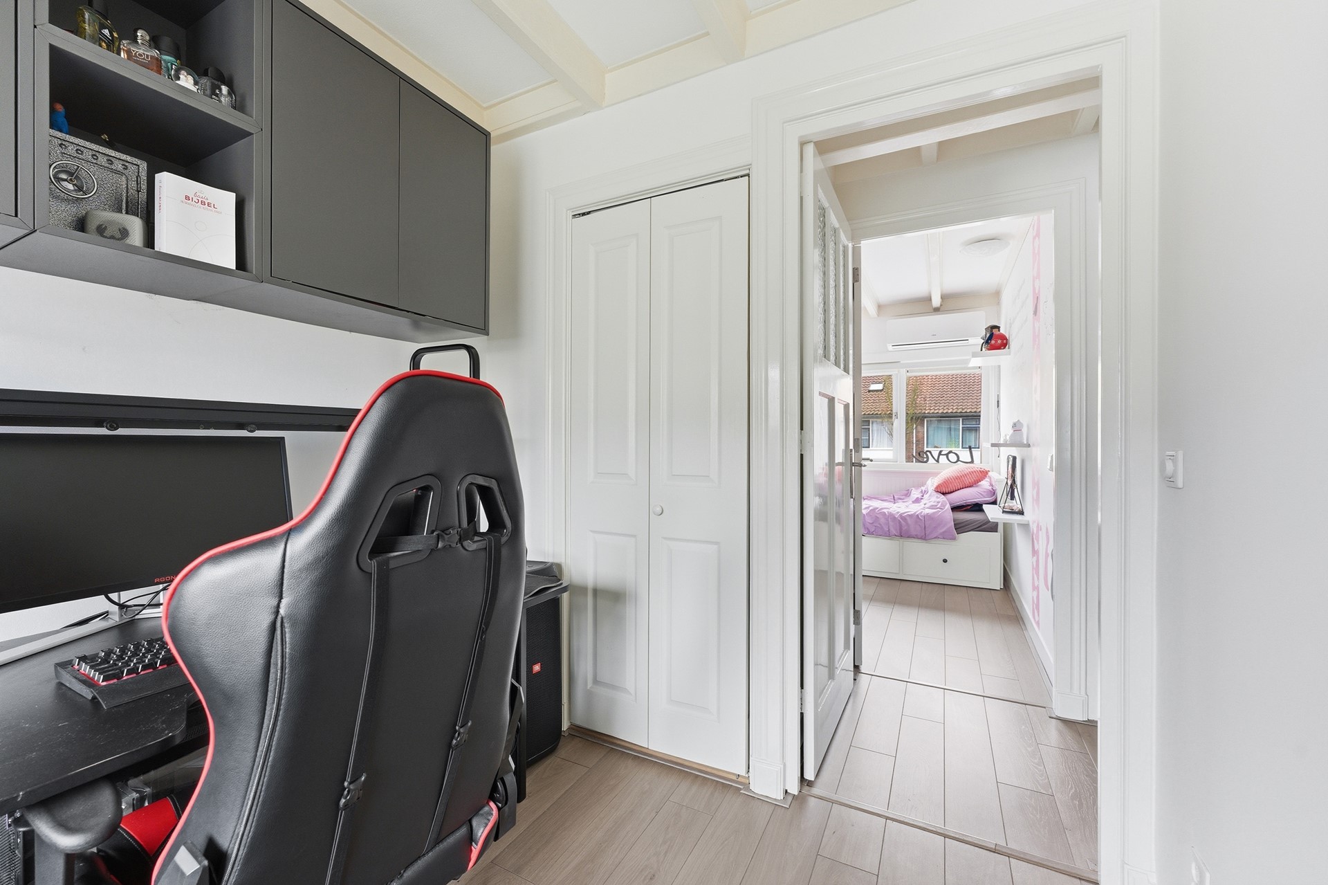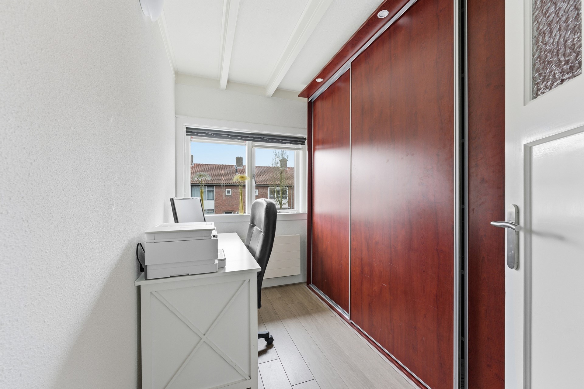 Slaapkamer 3: Slaapkamer drie is eveneens gelegen aan de achterzijde en wordt momenteel gebruikt als kantoor. Er is een grote vaste kast aanwezig. Uiteraard kun je de ruimte ook inrichten als slaapkamer of kledingkamer. De kamer is afgewerkt met een laminaatvloer, structuur wanden en een plafond met balken en spuitwerk.
