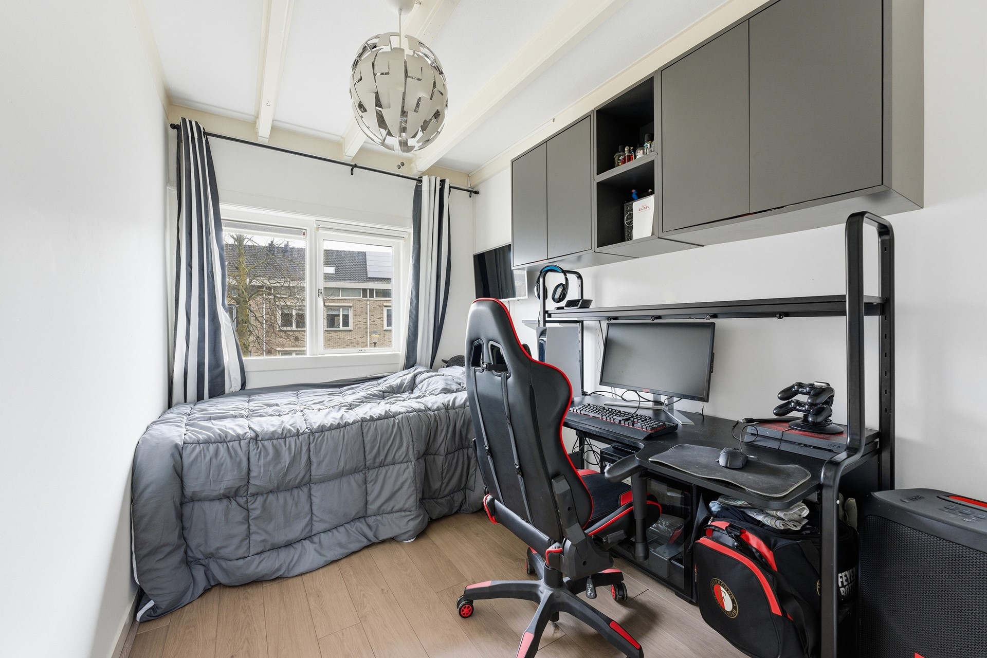 Slaapkamer 1: Slaapkamer één is gelegen aan de voorzijde en beschikt over een inbouwkast. De kamer is afgewerkt met een laminaatvloer, gestuukte wanden en een plafond met balken en spuitwerk. De kamers op deze verdieping zijn voorzien van rolluiken en daardoor goed te verduisteren. De horren zorgen ervoor dat je veilig kunt ventileren.