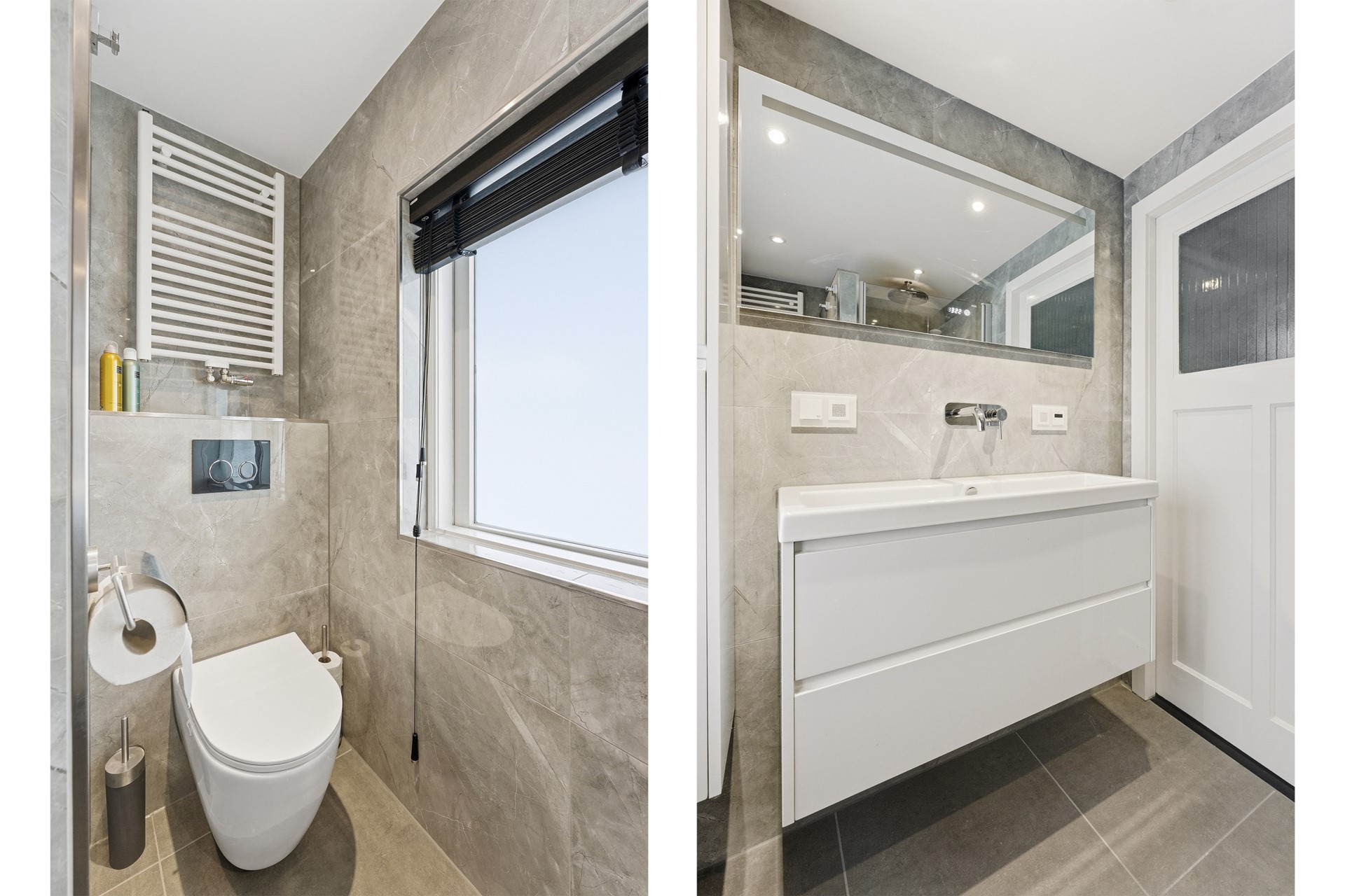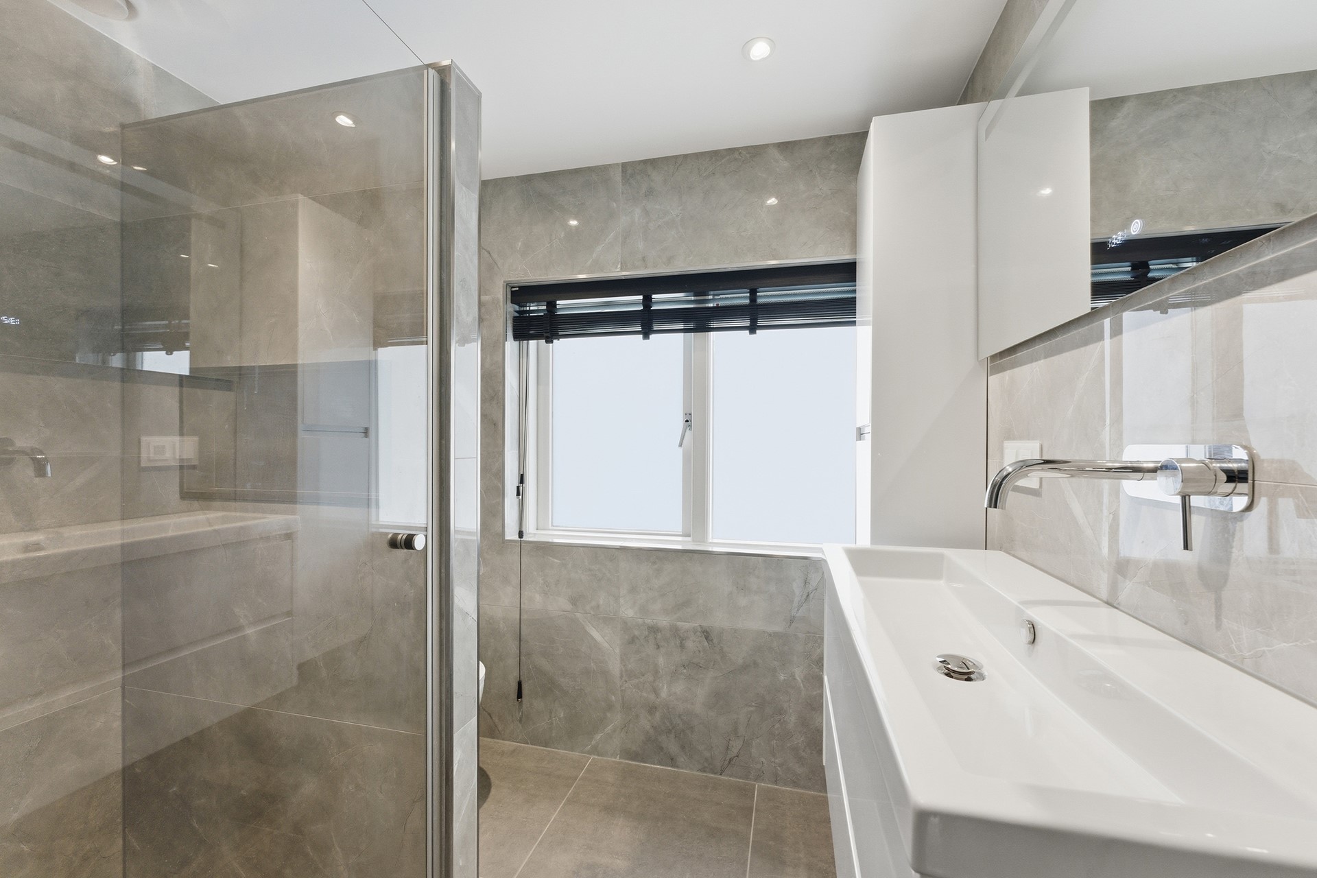 Badkamer: De mooie badkamer is voorzien van een douche, toilet, spiegel met verlichting en wastafelmeubel met geïntegreerde wastafel. Daarnaast zijn er inbouwspots, een designradiator en mechanische ventilatie aanwezig. Elektrische vloerverwarming en een raam met dubbel glas zorgen voor extra comfort. Als extra detail is er zelfs een ingebouwde radio aanwezig. De ruimte is volledig betegeld afgewerkt.