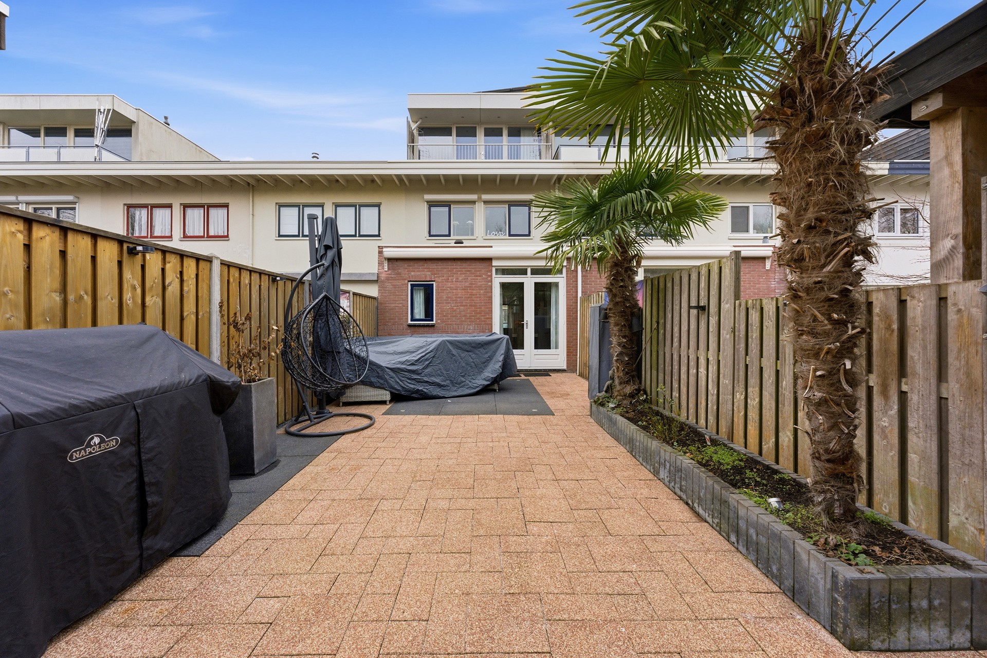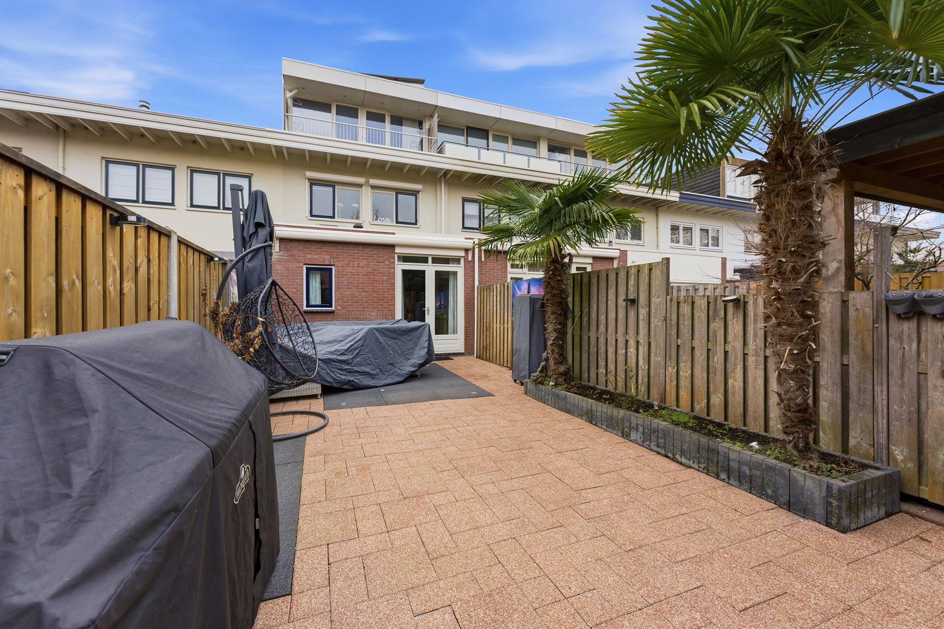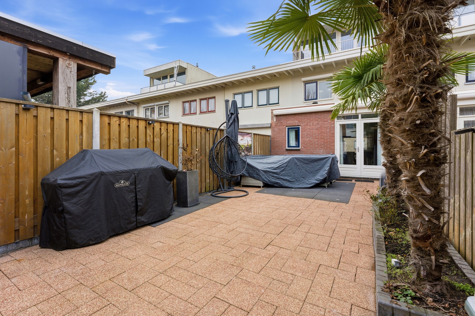 Achtertuin: De achtertuin ligt op het zuidoosten en meet circa 12,5 x 4,8 meter, waardoor er volop ruimte is voor verschillende gebruiksmogelijkheden. De tuin is grotendeels bestraat met sierbestrating en voorzien van tuinborders, wat zorgt voor een onderhoudsvriendelijke inrichting. Dankzij het zonnescherm kun je ook op zonnige dagen beschut buiten zitten en de aanwezige wateraansluiting maakt het gemakkelijk om planten te verzorgen of de tuin schoon te houden. De achtertuin biedt een prettige plek om te ontspannen, te spelen of te loungen tijdens warme dagen.