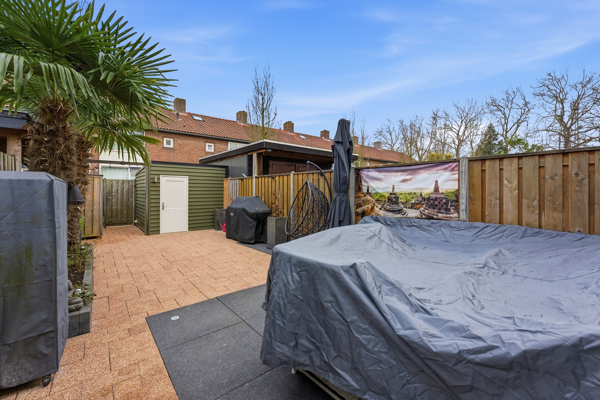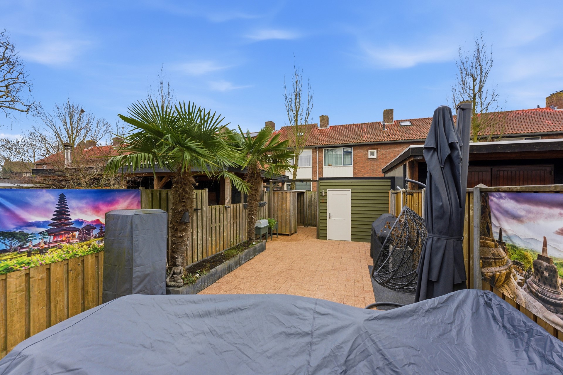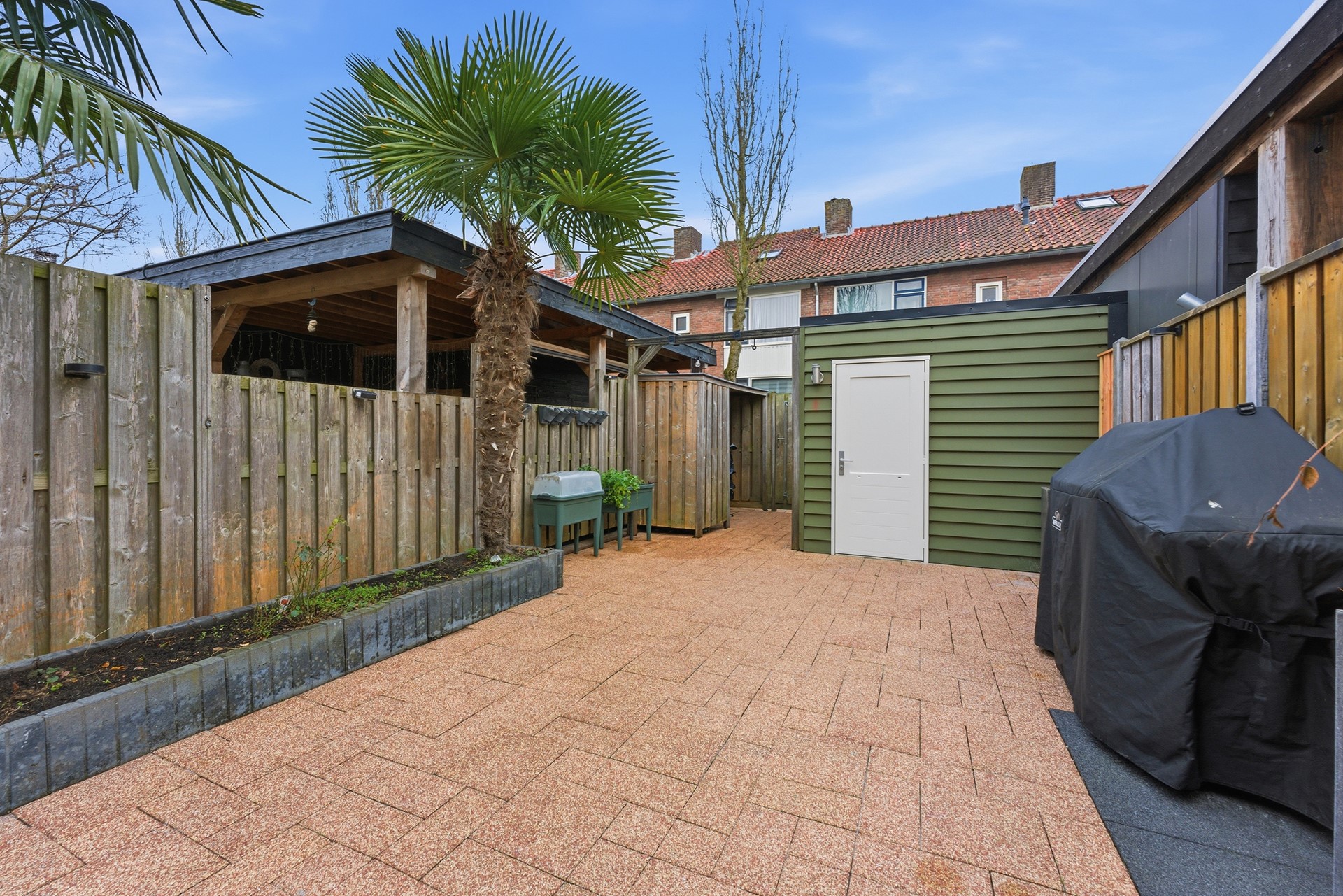 Schuur: Achter in de tuin staat een vrijstaande houten schuur, ideaal voor het opbergen van tuingereedschap of andere spullen. Daarnaast is er een houten overkapping aanwezig, geschikt voor het stallen van een scooter of het plaatsen van containers, zodat alles netjes en uit het zicht blijft.