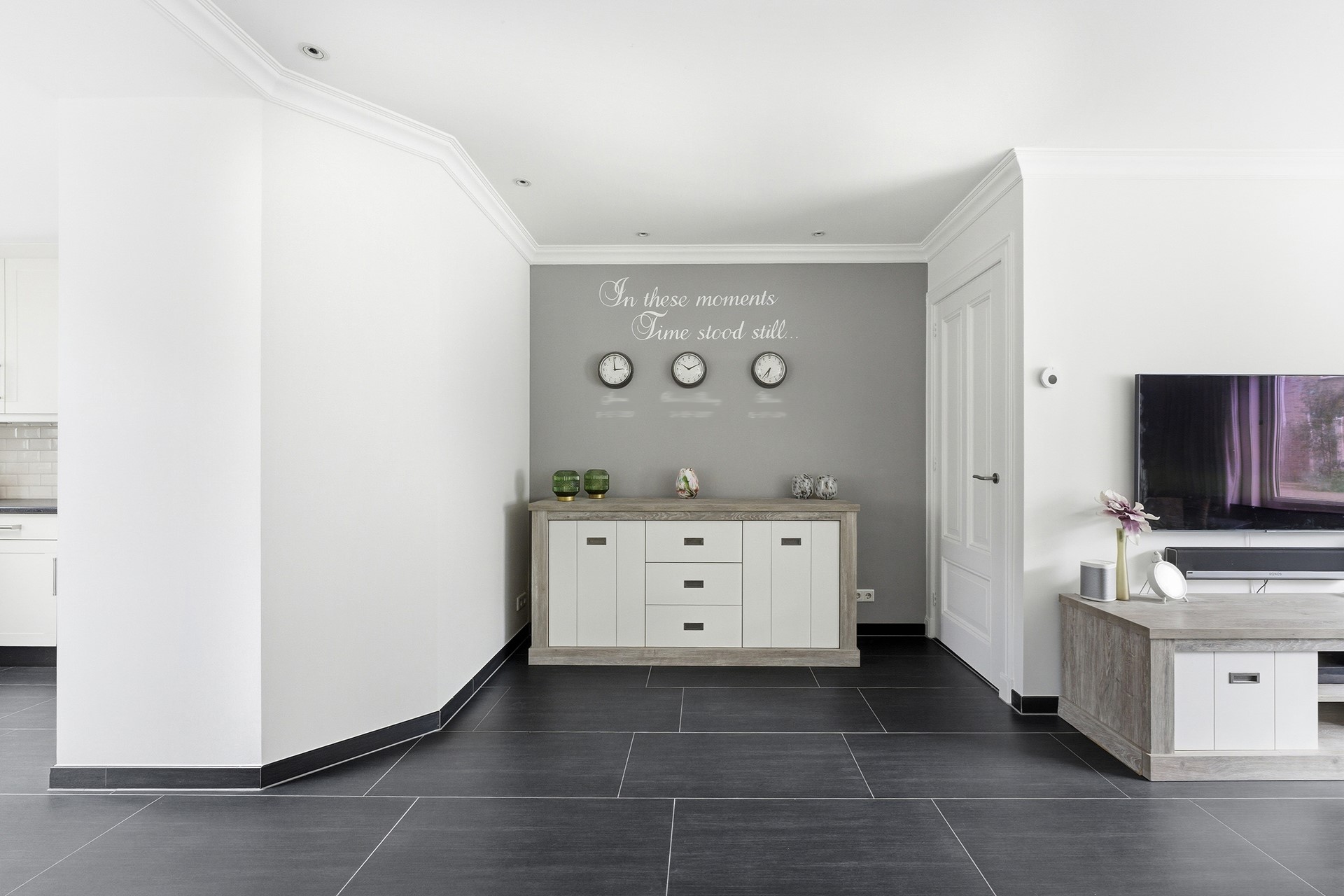 Woonkamer: De woonkamer vormt samen met de open keuken een prettige leefruimte. In de woonkamer is een trapkast aanwezig voor extra bergruimte. De begane grond is voorzien van vloerverwarming. Inbouwspots met RGB-verlichting zorgen voor verschillende lichtinstellingen. De ruimte is afgewerkt met een plavuizenvloer en gestuukte wanden en plafond.