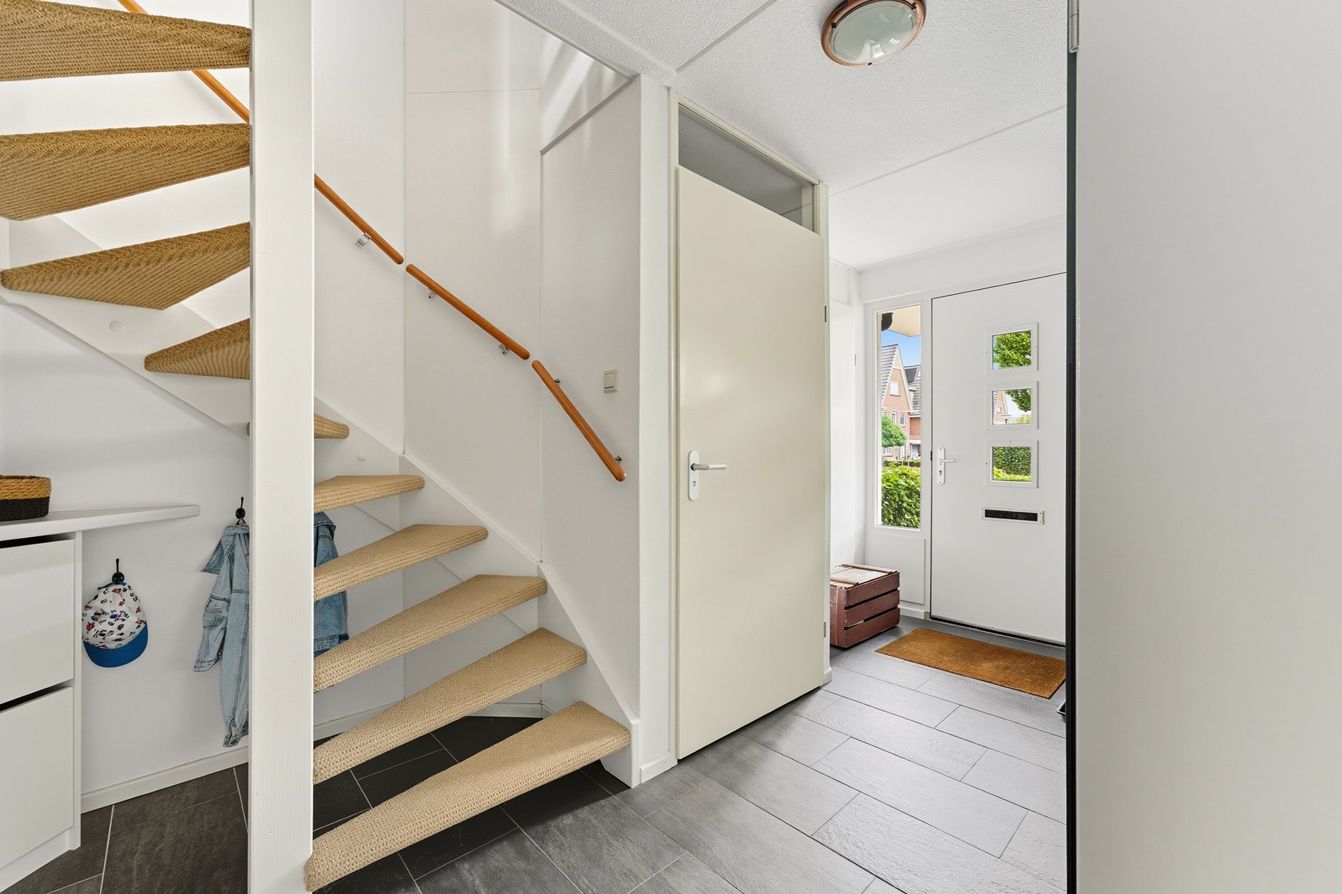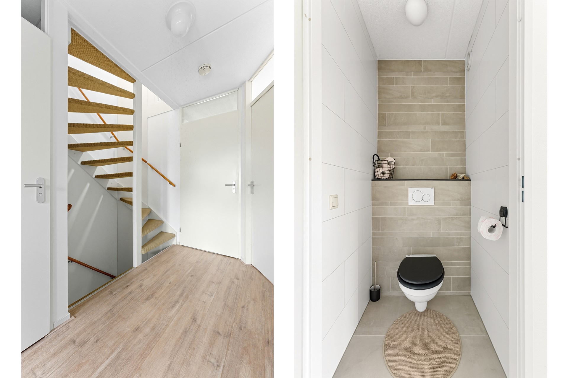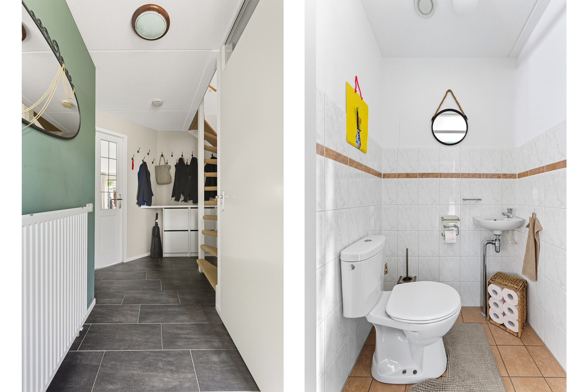 Entree: Je stapt de woning binnen in een ruime hal. De hal geeft toegang tot een inbouwkast met de cv-ketel, meterkast, toiletruimte, trapopgang en de woonkamer. De hal is afgewerkt met een plavuizen vloer, glasvlies behang wanden en een spuitwerk plafond.