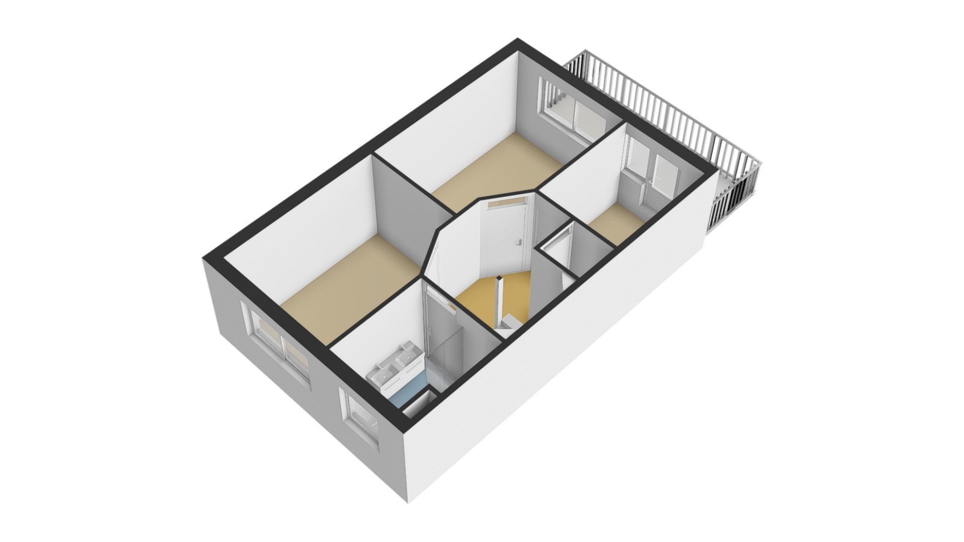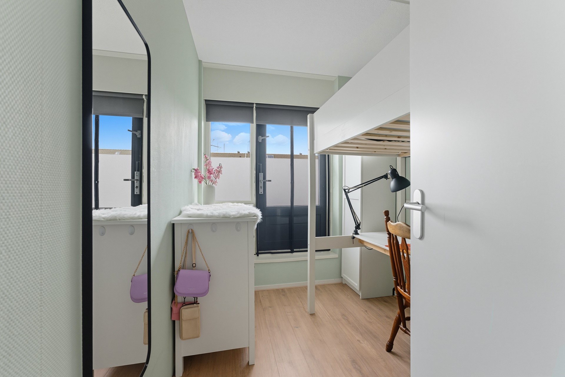 Slaapkamer 3: De slaapkamer aan de achterzijde van de woning biedt directe toegang tot het brede balkon op het westen. Hier kan je ’s ochtends genieten van de eerste zonnestralen. De kamer is voorzien van horren bij de ramen, waardoor frisse lucht binnenkomt zonder dat insecten binnenvliegen. Het balkon loopt over de gehele breedte van de woning. De kamer is afgewerkt met een laminaat vloer, glasvliesbehang wanden en een spuitwerk plafond.