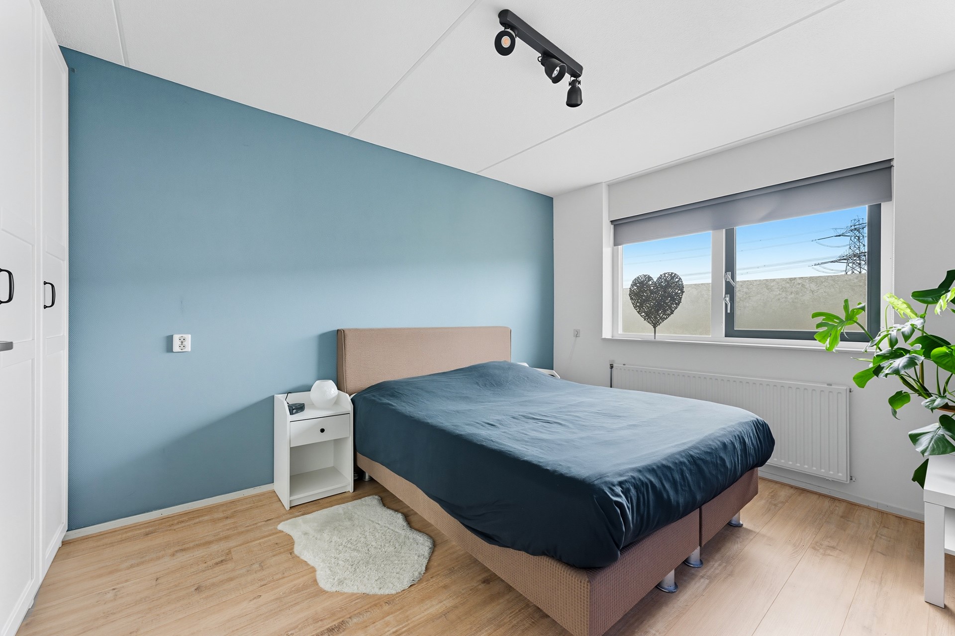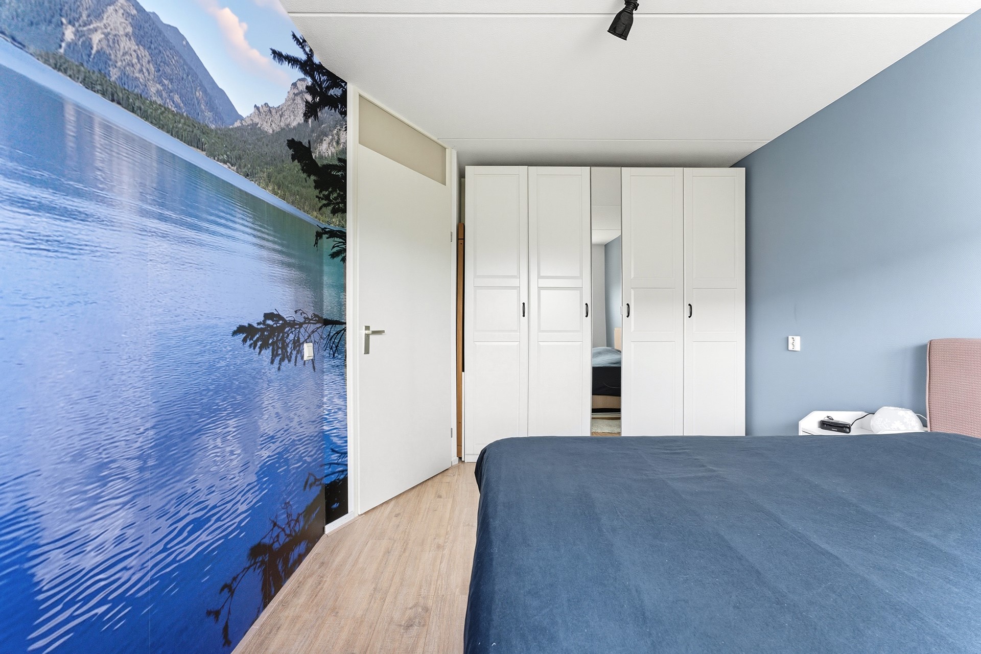 Slaapkamer 1: Fijne slaapkamer aan de voorzijde van de woning. De kamer is afgewerkt met een laminaat vloer, glasvlies behang wanden en een spuitwerk plafond.