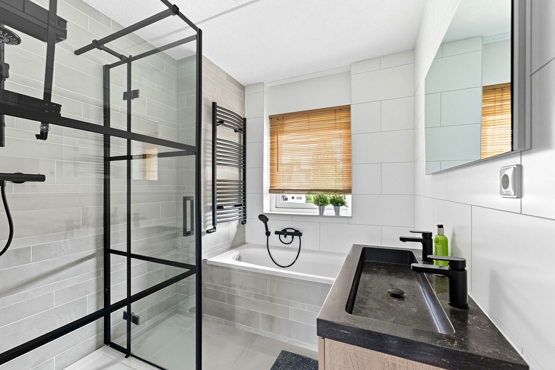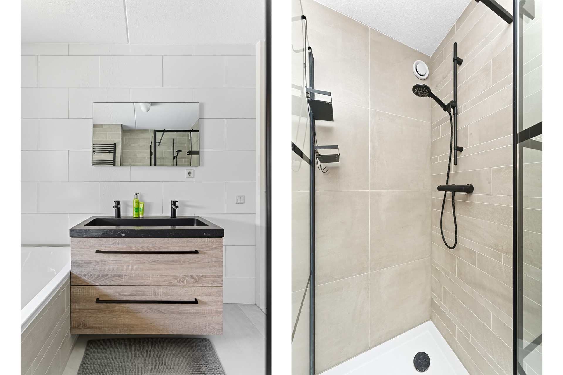 Badkamer: De volledig betegelde badkamer is een echte blikvanger. Hier geniet je van een luxueuze inloopdouche en een ligbad, ideaal voor ontspanning na een drukke dag. De zwarte opbouwkranen, het stalen frame van de douchedeur en de zwarte designradiator geven de ruimte uitstraling. Het houtlook wastafelmeubel met geïntegreerde wastafel biedt praktische opbergruimte, terwijl het raam zorgt voor volop natuurlijk licht. Dankzij de mechanische ventilatie blijft de badkamer altijd fris en comfortabel.