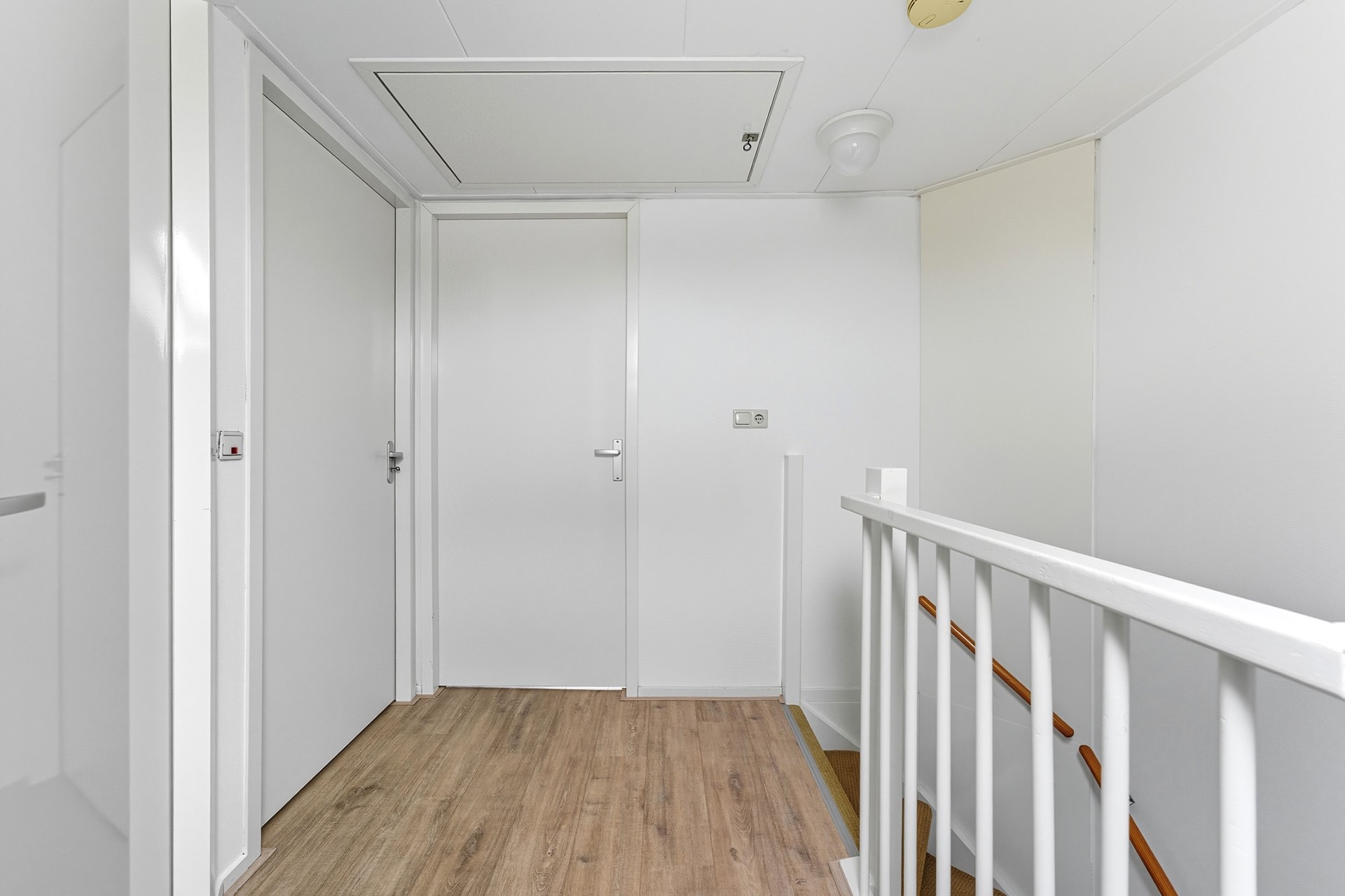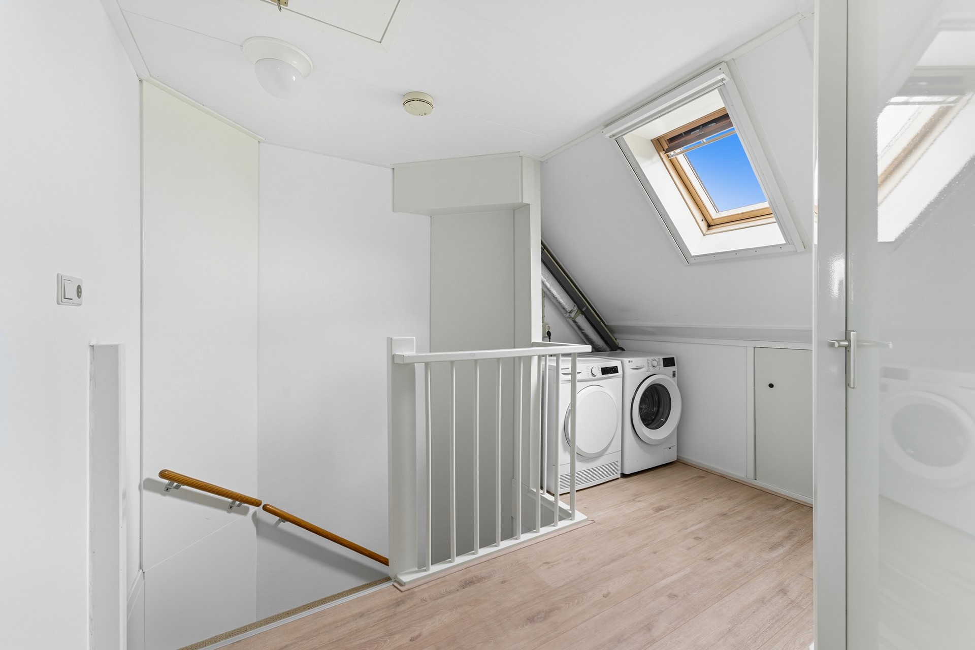 Overloop: De ruime overloop op de tweede verdieping is licht en luchtig dankzij het dakraam. Hier is ruimte voor de wasmachine en droger. Vanuit de overloop is er via een vlizotrap toegang tot een handige bergzolder, waar ook de omvormer van de zonnepanelen is geplaatst. De laminaatvloer loopt door over de hele verdieping, wat zorgt voor een uniforme uitstraling. De overloop geeft toegang tot drie ruime slaapkamers.