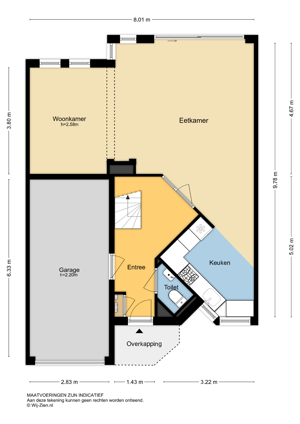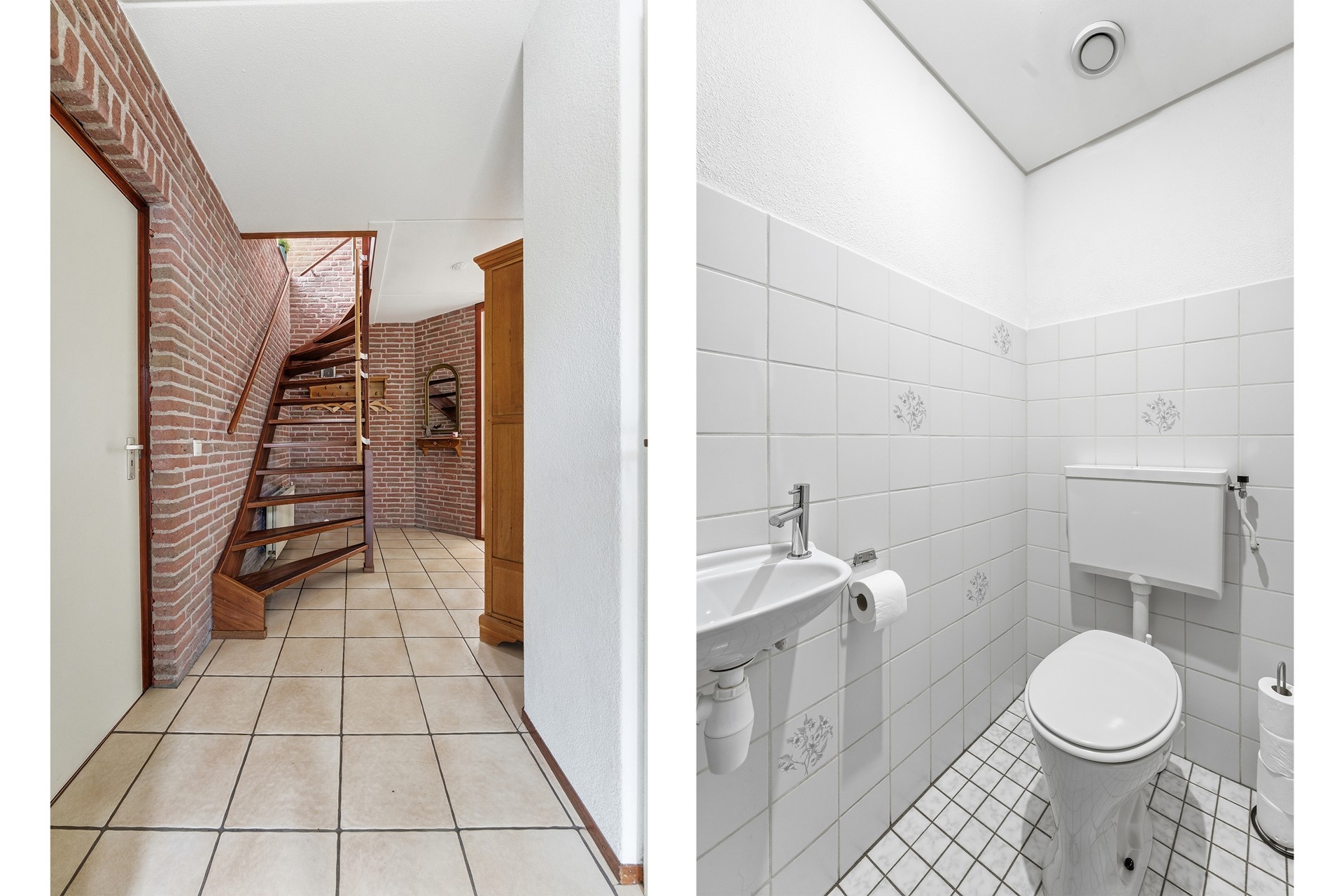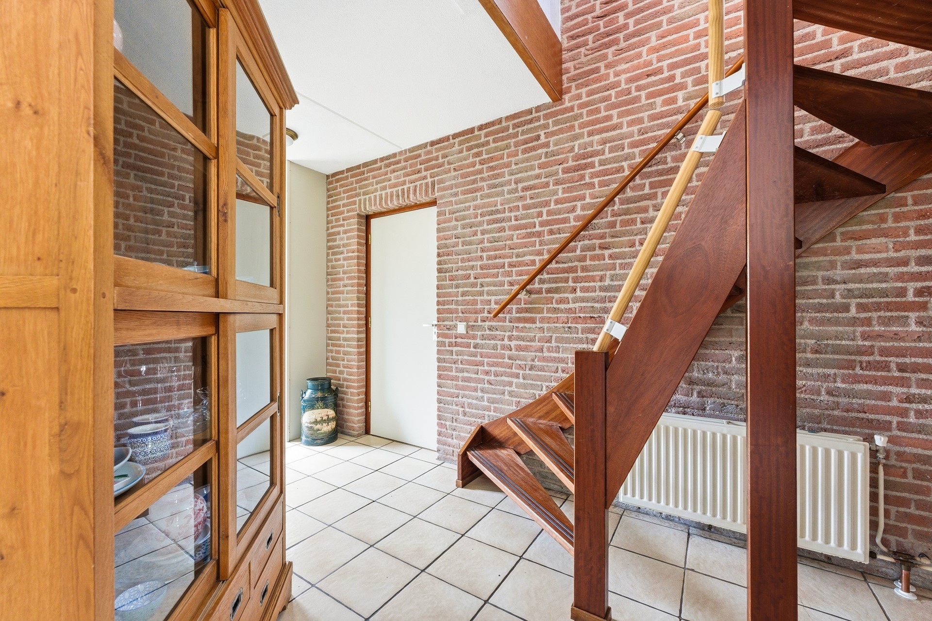 Entree: De hal biedt toegang tot de woonkamer, toiletruimte, meterkast, garage en trapopgang naar de eerste verdieping. De ruimte is afgewerkt met een plavuizenvloer, metselwerk wanden en een spuitwerk plafond. De vloer is doorgelegd over de gehele begane grond, wat zorgt voor een rustige aansluiting tussen de ruimtes.