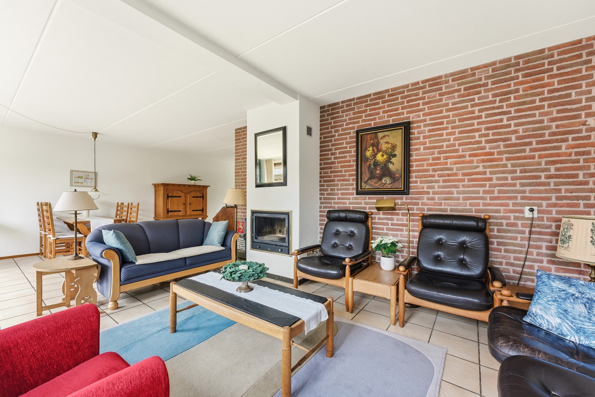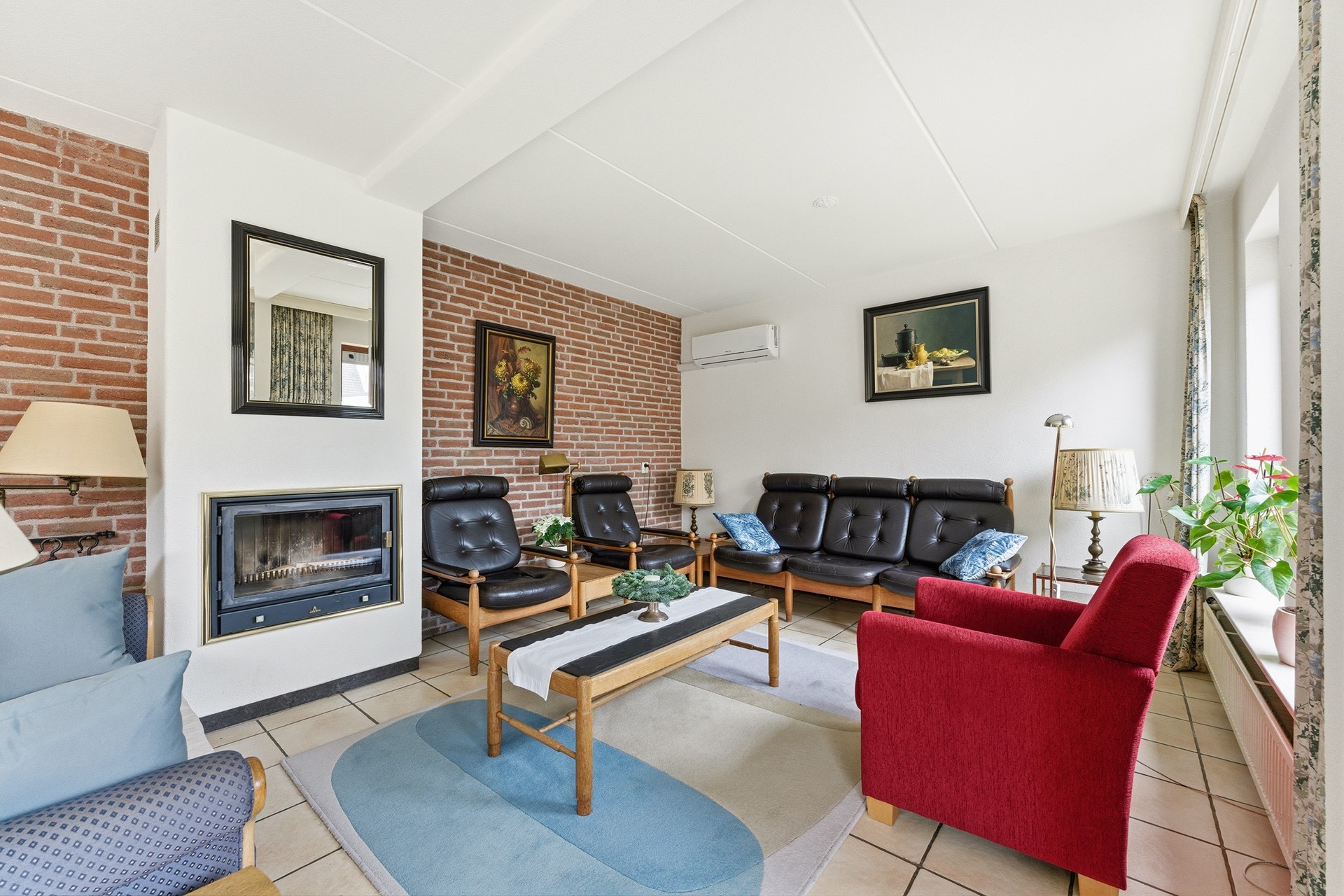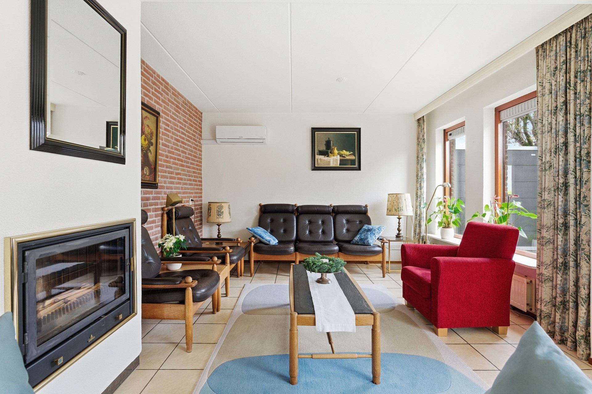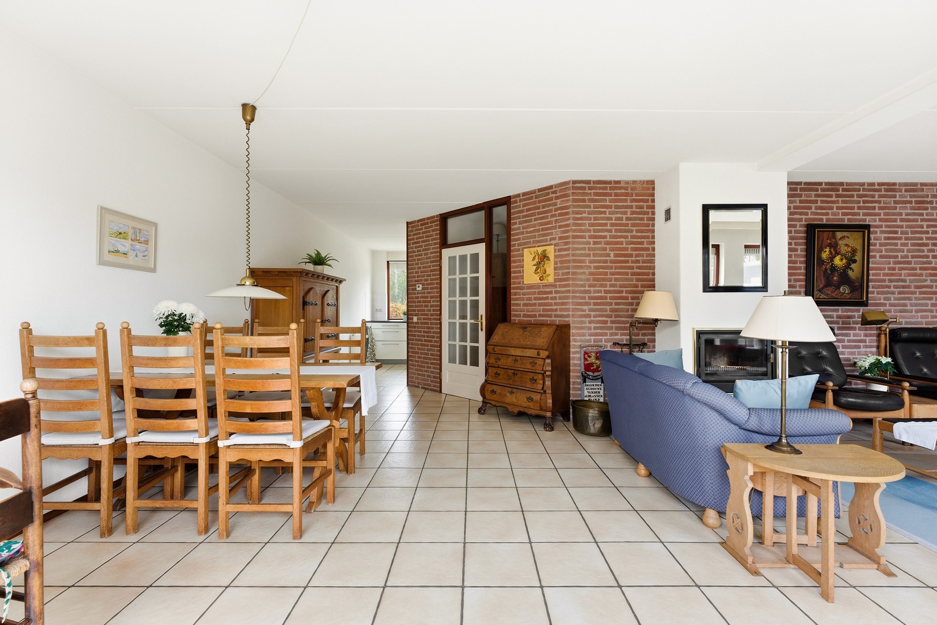 Woonkamer: De woonkamer ligt aan de tuinzijde en heeft een ruim karakter met zichtlijnen naar de achtertuin. De schuifpui zorgt voor een directe verbinding met buiten en het aanwezige zonnescherm biedt extra comfort op warme dagen. De ruimte beschikt over airconditioning, vloerverwarming, een haard en rolluiken aan de tuinzijde, waarmee het wooncomfort wordt vergroot. De afwerking bestaat uit een plavuizenvloer, metselwerk/steenstrips wanden en een spuitwerkplafond.