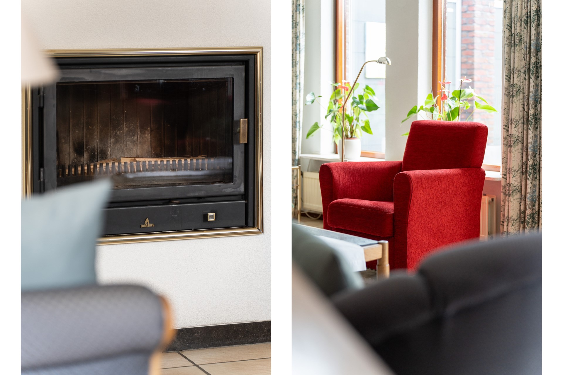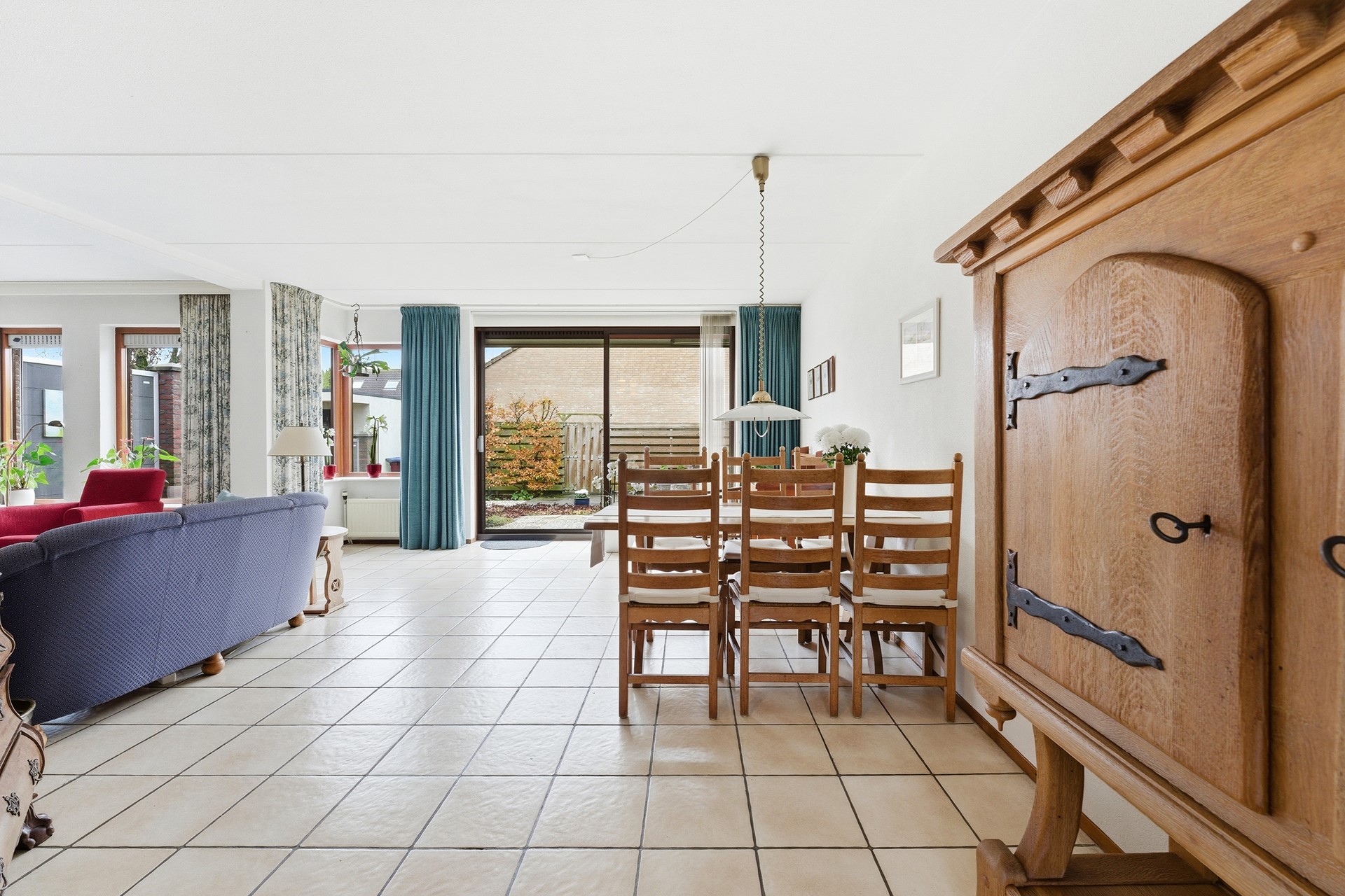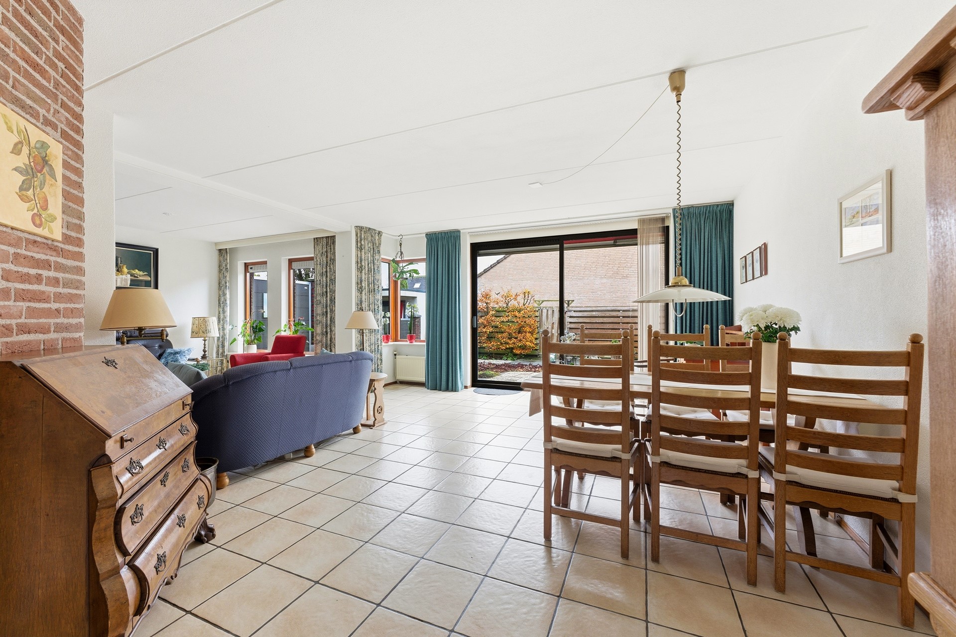 Woonkamer: De woonkamer ligt aan de tuinzijde en heeft een ruim karakter met zichtlijnen naar de achtertuin. De schuifpui zorgt voor een directe verbinding met buiten en het aanwezige zonnescherm biedt extra comfort op warme dagen. De ruimte beschikt over airconditioning, vloerverwarming, een haard en rolluiken aan de tuinzijde, waarmee het wooncomfort wordt vergroot. De afwerking bestaat uit een plavuizenvloer, metselwerk/steenstrips wanden en een spuitwerkplafond.