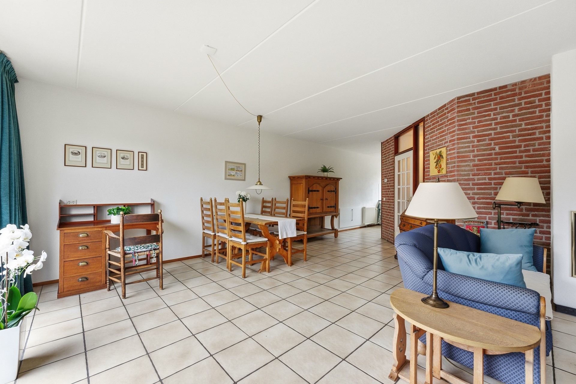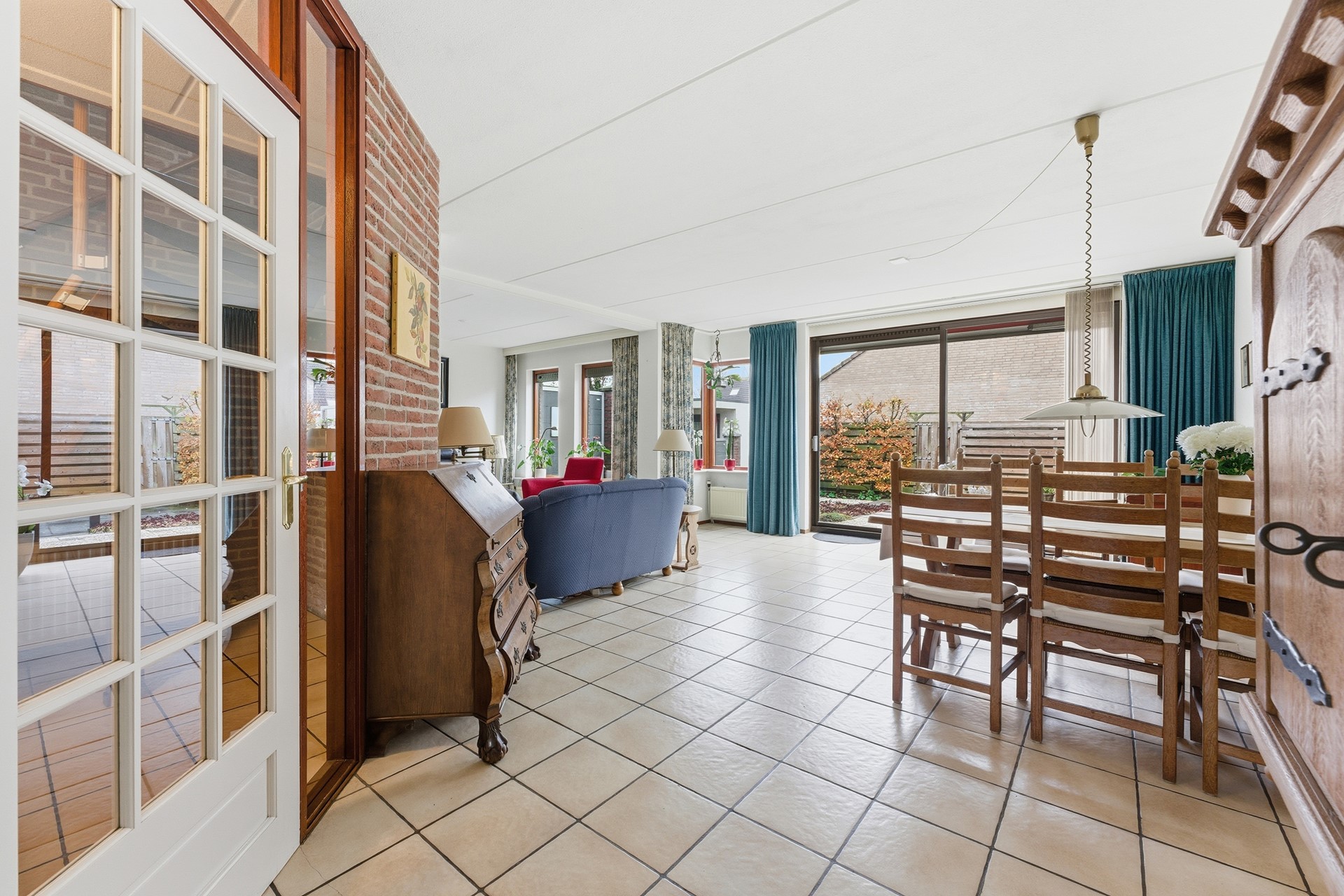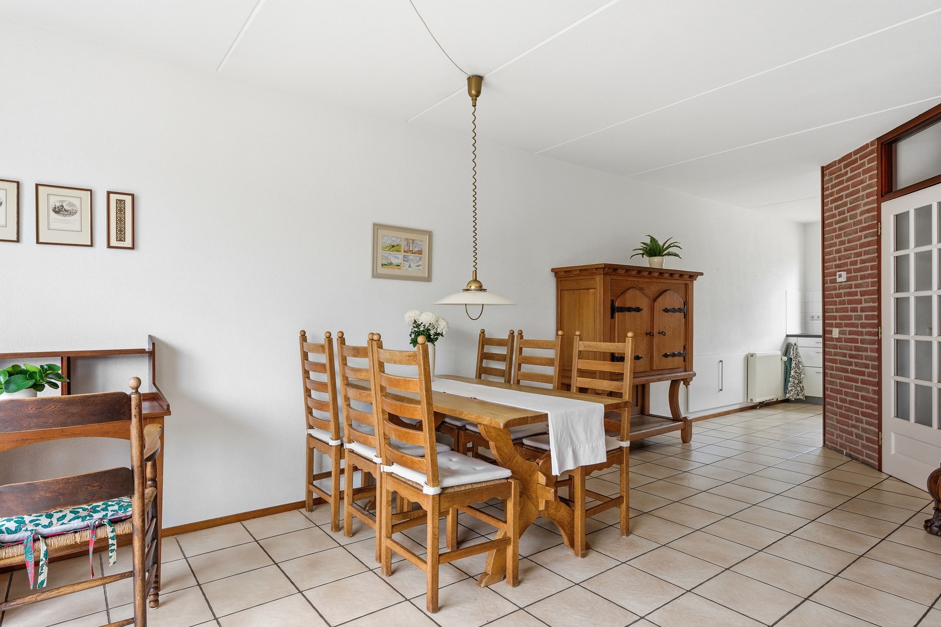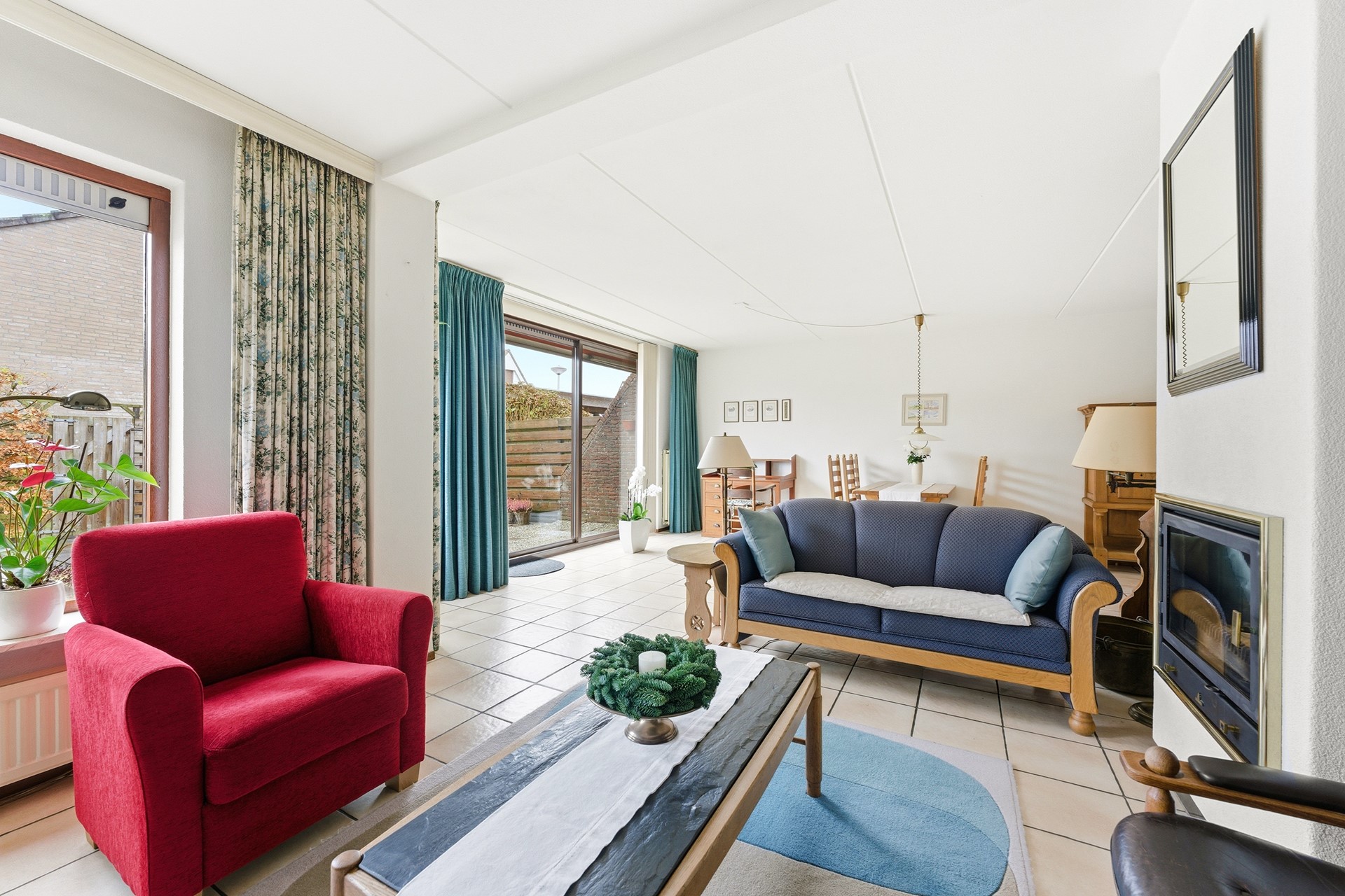 Woonkamer: De woonkamer ligt aan de tuinzijde en heeft een ruim karakter met zichtlijnen naar de achtertuin. De schuifpui zorgt voor een directe verbinding met buiten en het aanwezige zonnescherm biedt extra comfort op warme dagen. De ruimte beschikt over airconditioning, vloerverwarming, een haard en rolluiken aan de tuinzijde, waarmee het wooncomfort wordt vergroot. De afwerking bestaat uit een plavuizenvloer, metselwerk/steenstrips wanden en een spuitwerkplafond.