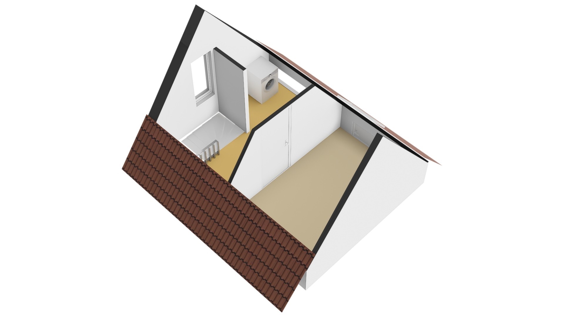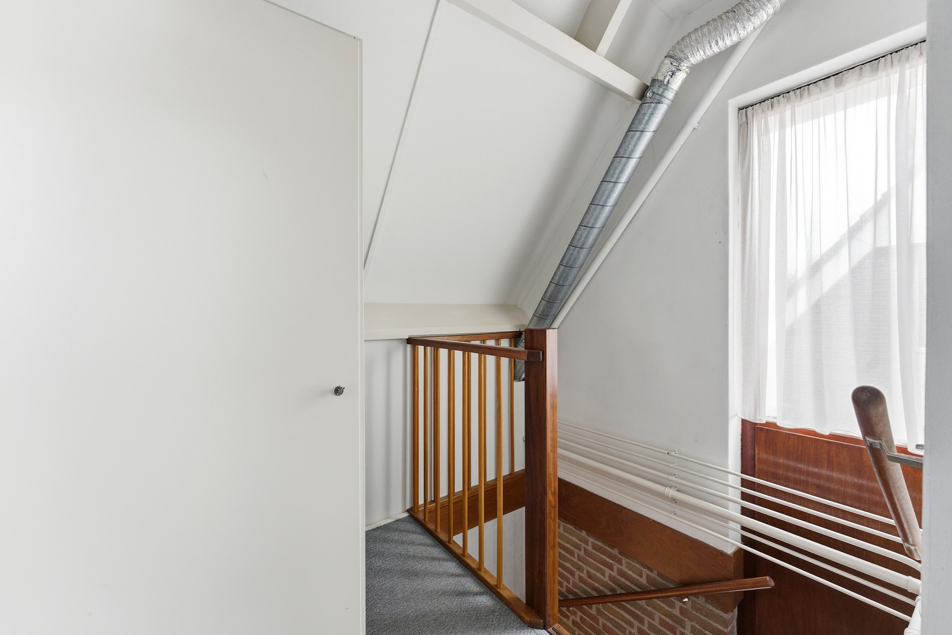 Overloop: De overloop is ingericht met de Cv-ketel, wasmachineaansluiting en knieschotten. Een groot raam aan de zijkant zorgt voor lichtinval. De overloop geeft toegang tot slaapkamer vier en een vliering. De afwerking bestaat uit vloerbedekking, gipswanden en een hardboardplafond.