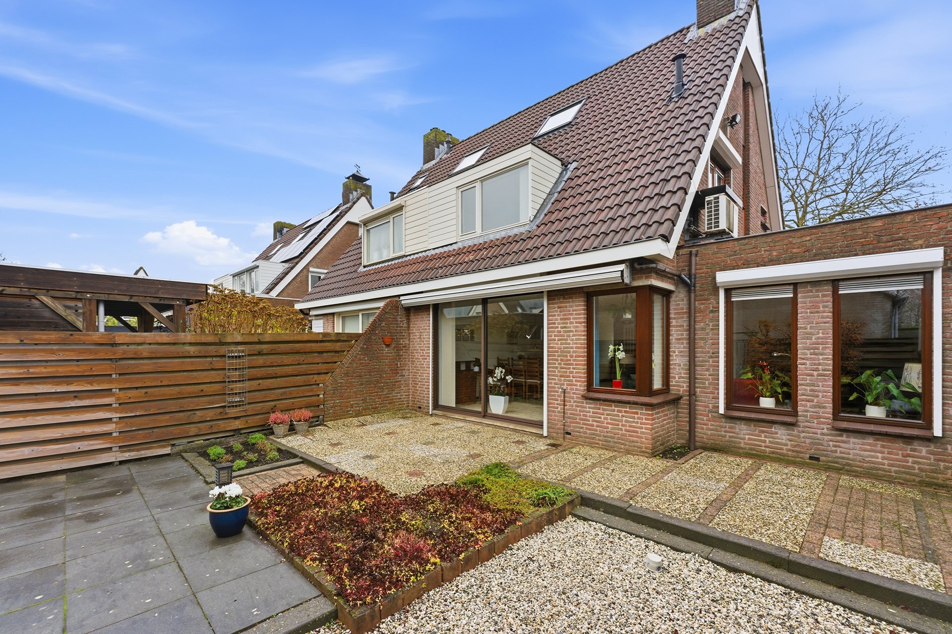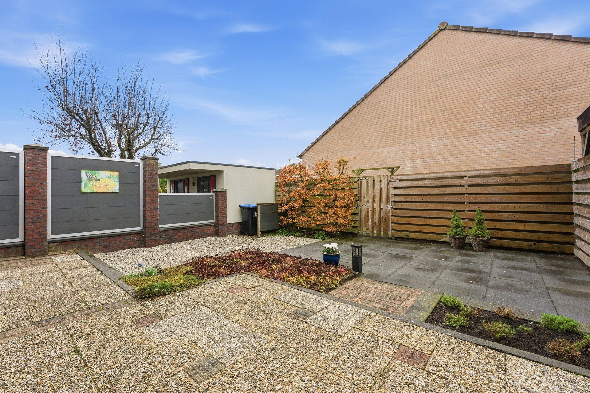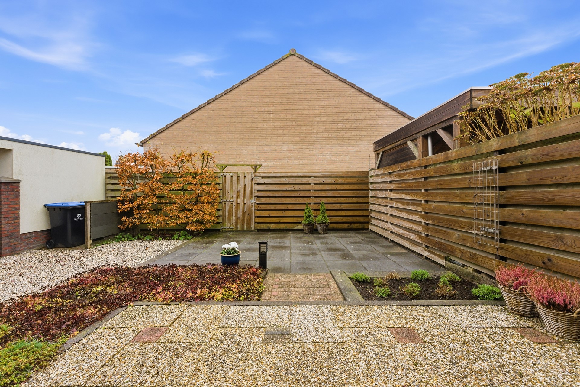Achtertuin: De achtertuin (afm. ca. 7.80 x 8.30) ligt op het zuidwesten en biedt daardoor een heerlijke zonligging vanaf de middag tot in de avond. De tuin is ingericht met sierbestrating en groene borders, waardoor er meerdere zitplekken mogelijk zijn. Dankzij de praktische indeling met achterom is de tuin goed bereikbaar voor fietsen of tuinmateriaal. Aan de woning bevindt zich een wateraansluiting en het aanwezige zonnescherm zorgt voor aangename schaduw op warme dagen.
