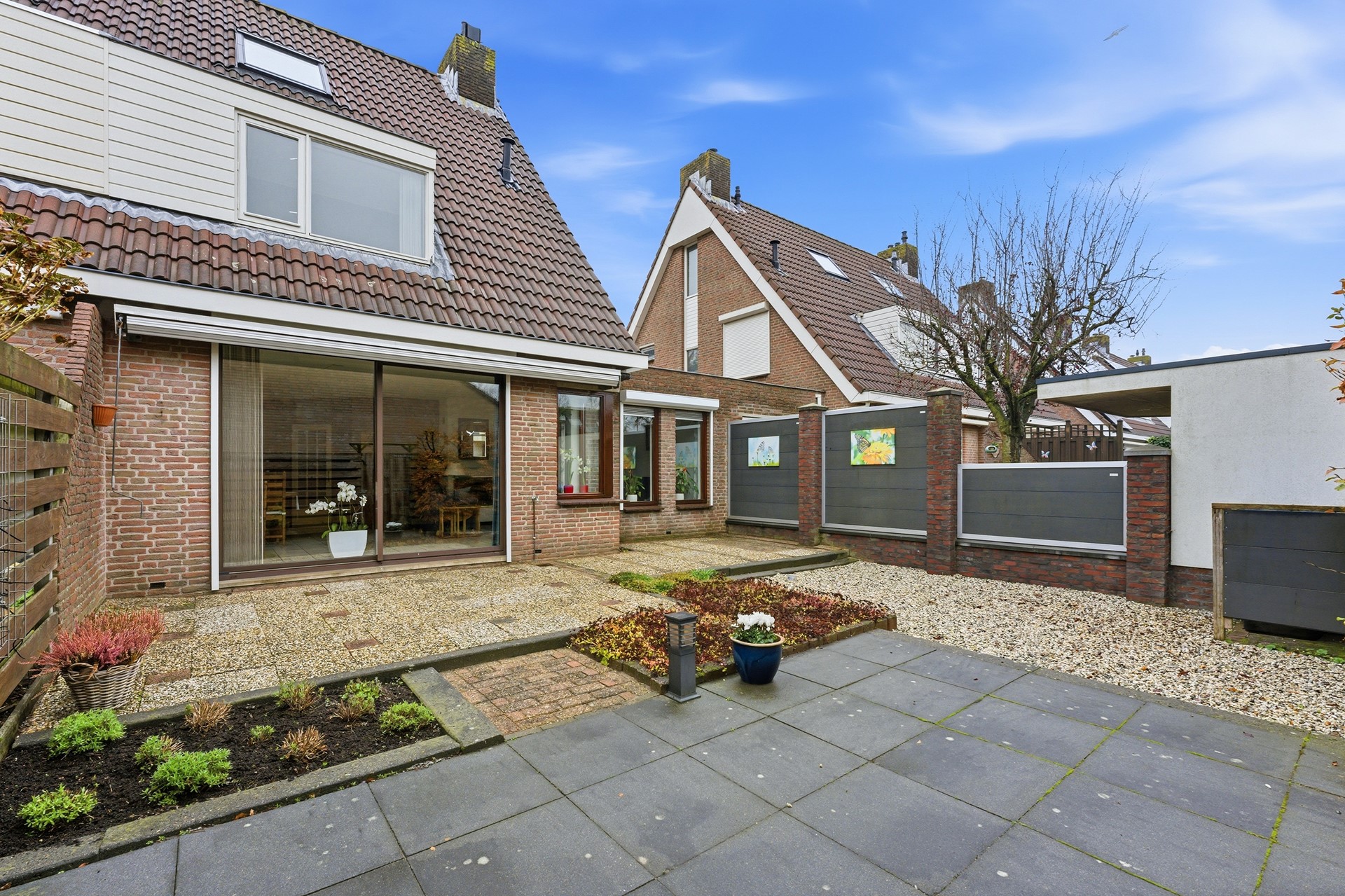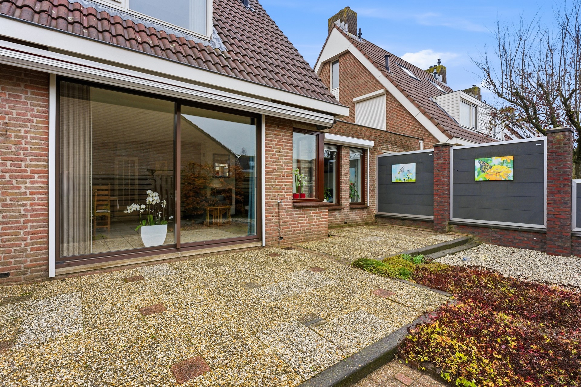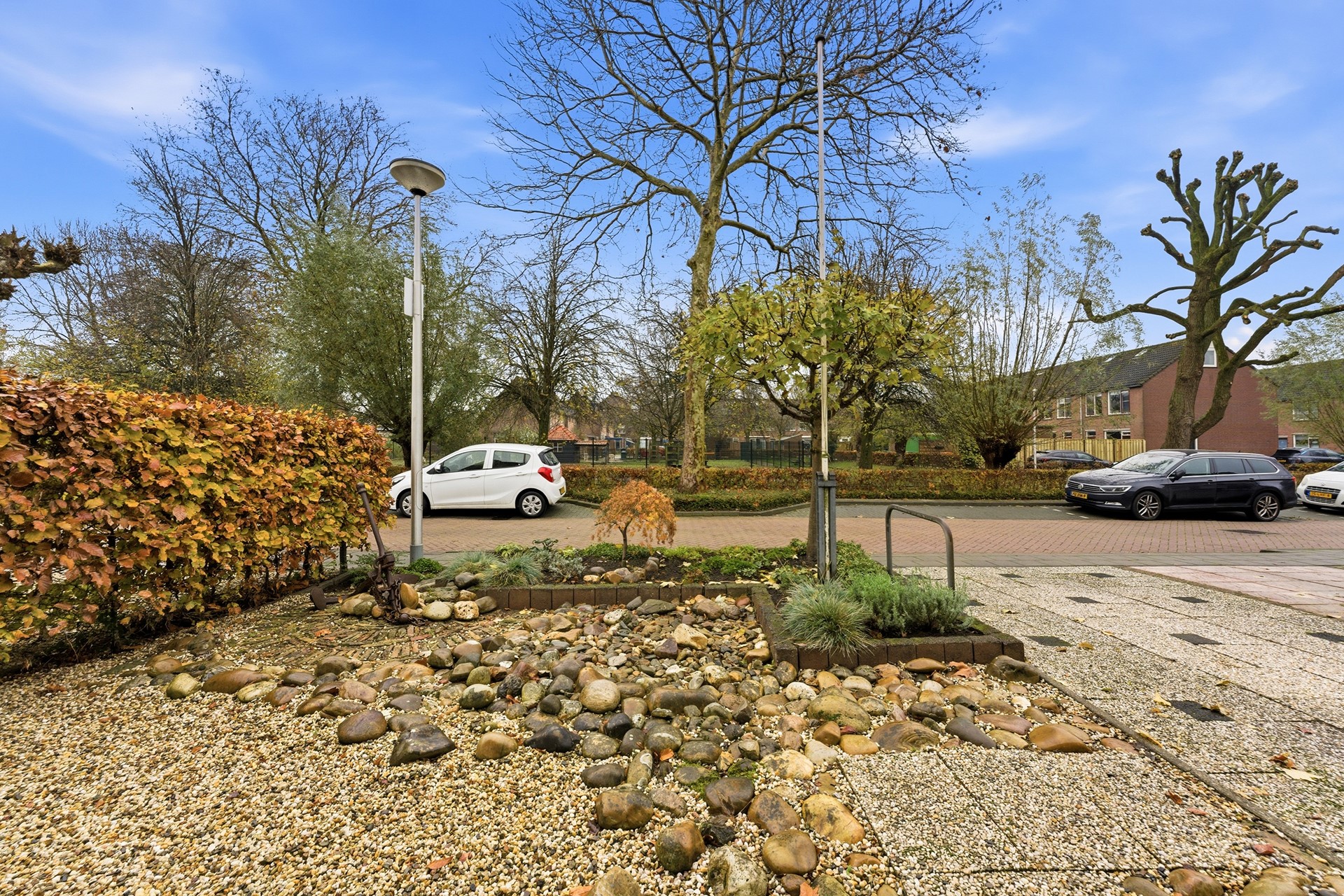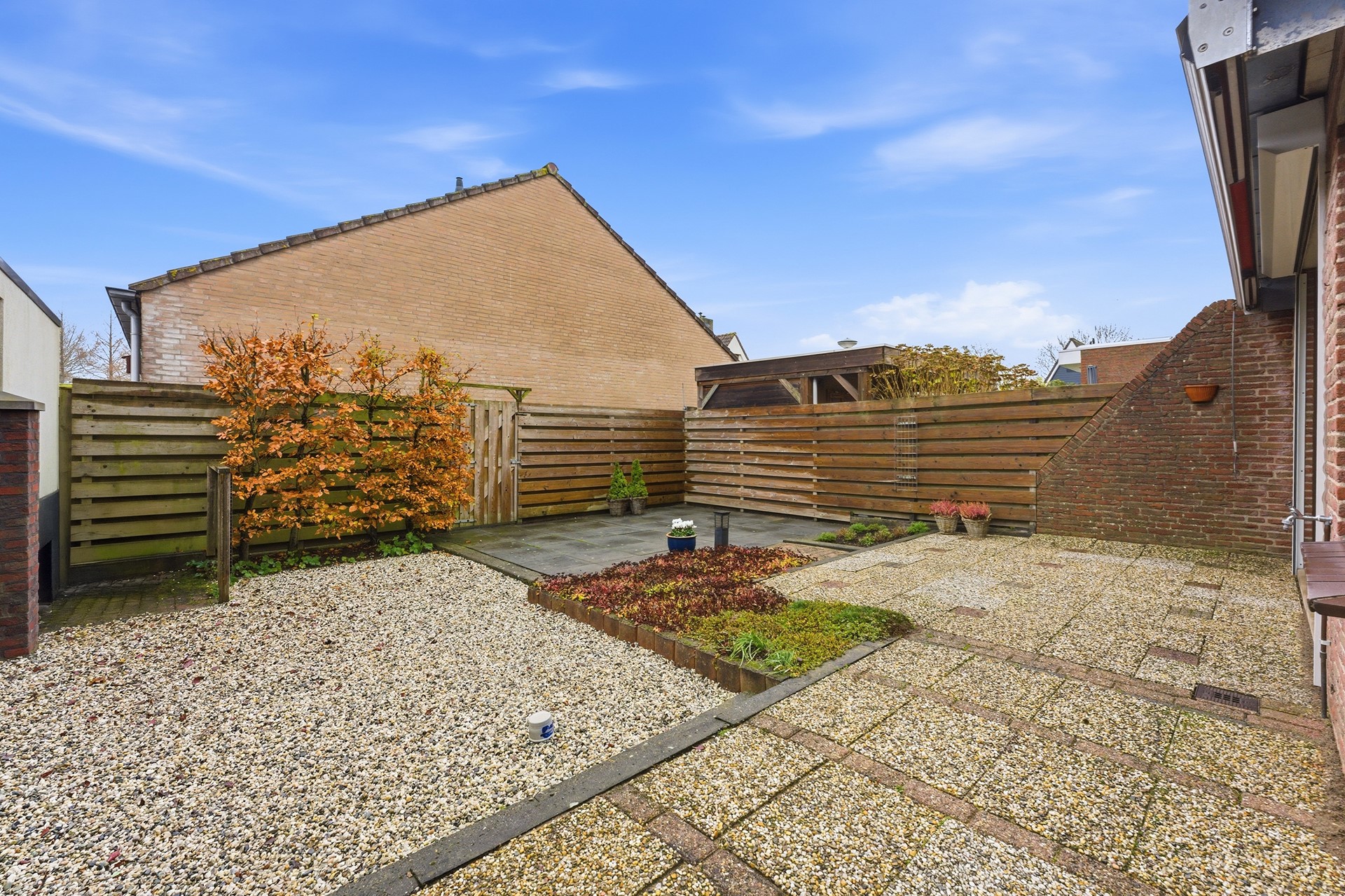 Achtertuin: De achtertuin (afm. ca. 7.80 x 8.30) ligt op het zuidwesten en biedt daardoor een heerlijke zonligging vanaf de middag tot in de avond. De tuin is ingericht met sierbestrating en groene borders, waardoor er meerdere zitplekken mogelijk zijn. Dankzij de praktische indeling met achterom is de tuin goed bereikbaar voor fietsen of tuinmateriaal. Aan de woning bevindt zich een wateraansluiting en het aanwezige zonnescherm zorgt voor aangename schaduw op warme dagen.