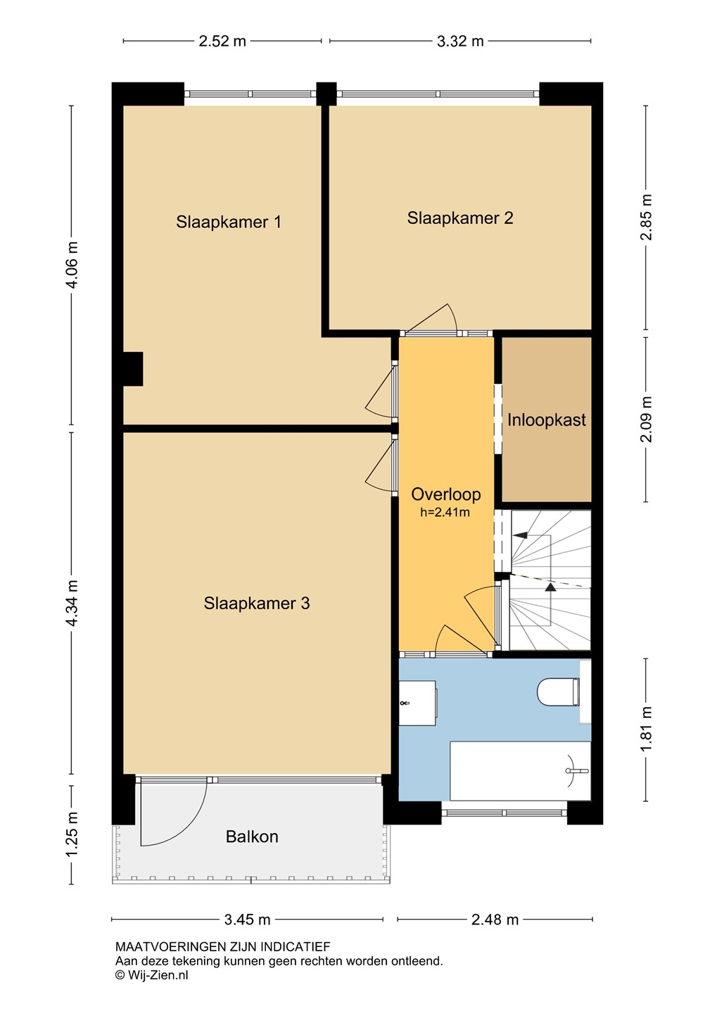 Overloop: De overloop geeft toegang tot drie slaapkamers, de badkamer, een inloopkast en de trapopgang naar de tweede verdieping. De afwerking van de hele verdieping bestaat uit een laminaatvloer, gestuukte wanden en een gestuukt plafond.