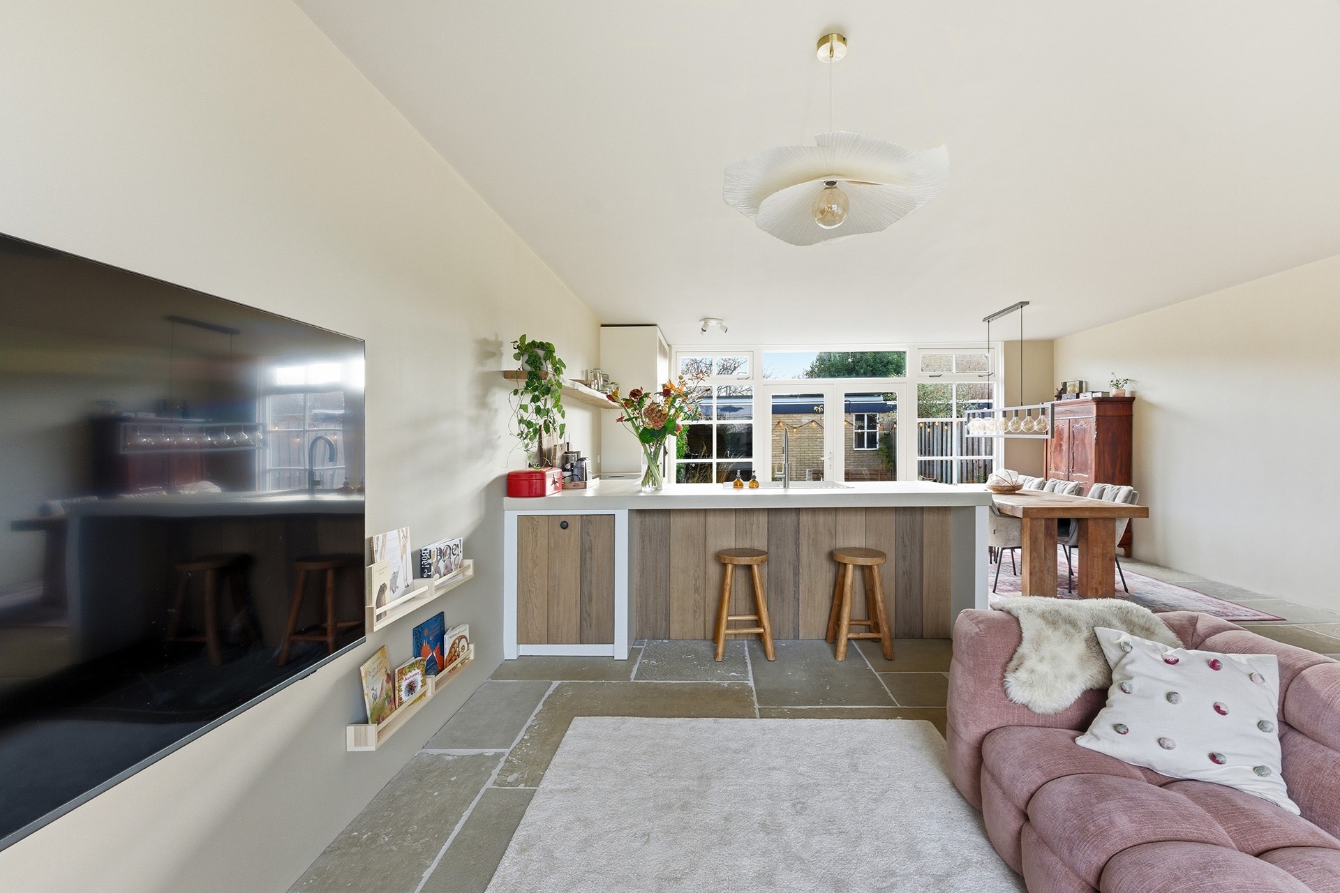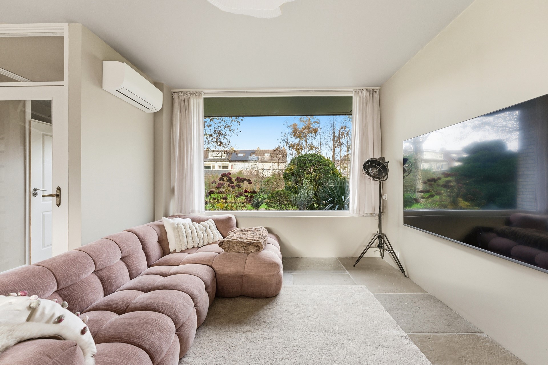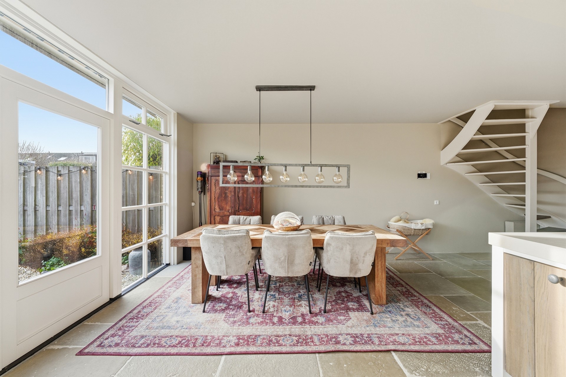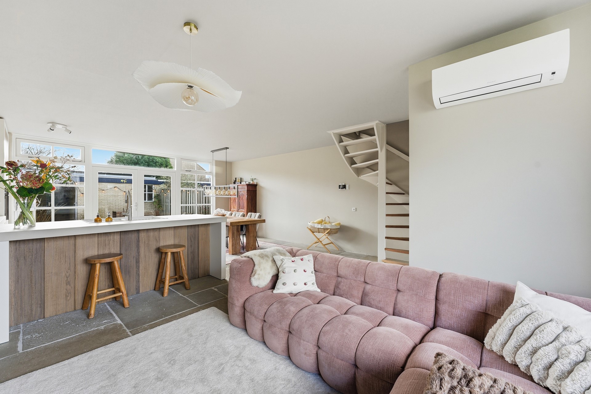 Woonkamer: De woonkamer is een ruime leefruimte met plaats voor een zit- en eethoek. Dankzij de indeling is er ruimte voor een aparte eethoek aan de achterzijde. Je zithoek plaats je gezellig aan de voorzijde met uitzicht op het groen en de sloot. Aan de achterzijde zorgt de nieuwe achterpui met openslaande deuren voor verbinding met de tuin en veel lichtinval. De pui heeft aan de linker- en rechterzijde een sfeervolle roedeverdeling. In de woonkamer is airconditioning aanwezig. De ruimte is afgewerkt met een prachtige RAW STONE vloer met vloerverwarming, gestuukte wanden en een gestuukt plafond.