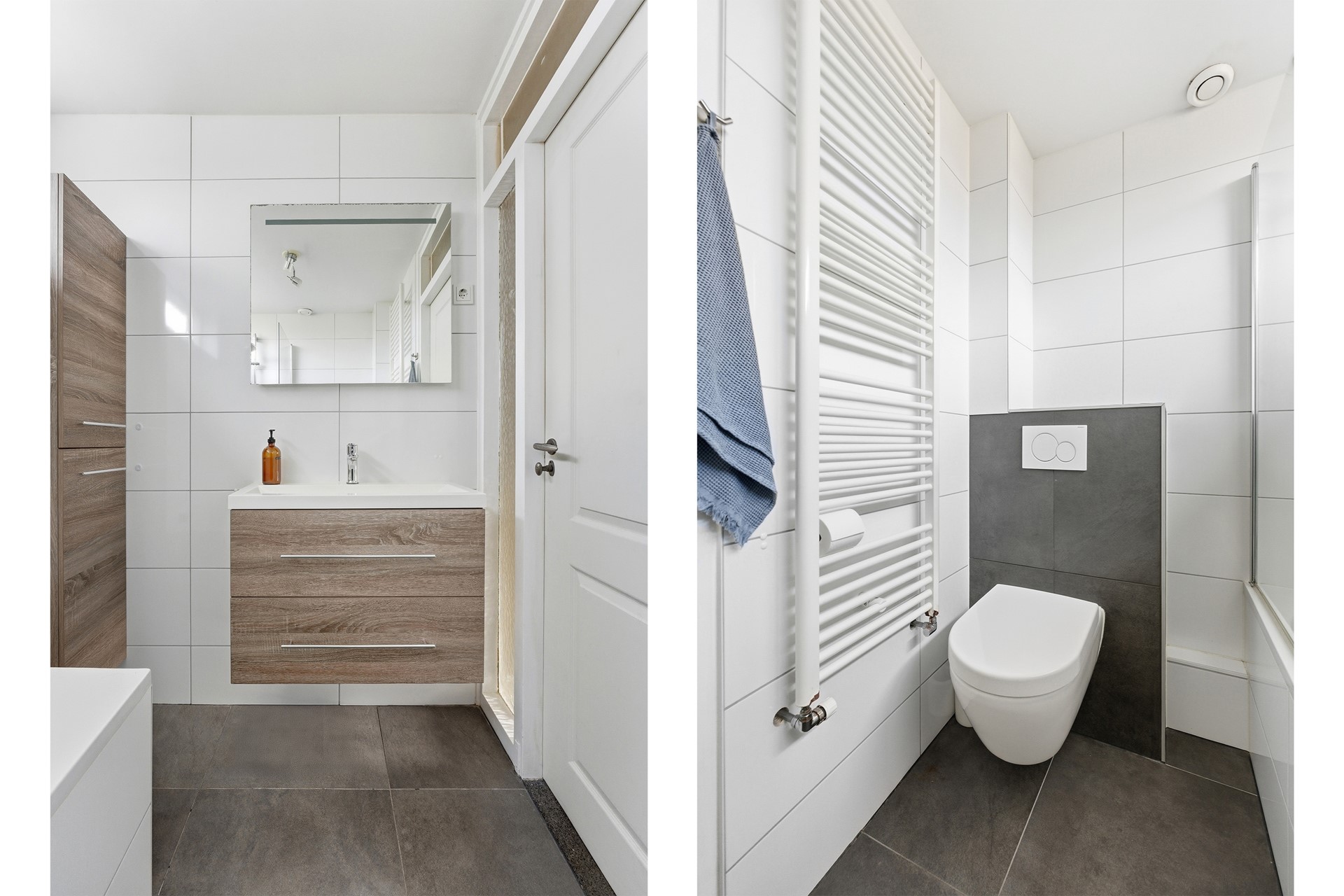 Badkamer: De nette badkamer is uitgerust met een ligbad, toilet en wastafelmeubel. Daarnaast zijn een designradiator en natuurlijke ventilatie aanwezig. De afwerking is volledig betegeld in een neutrale kleurstelling. Een prettige ruimte waar je nog jaren plezier van kan hebben.