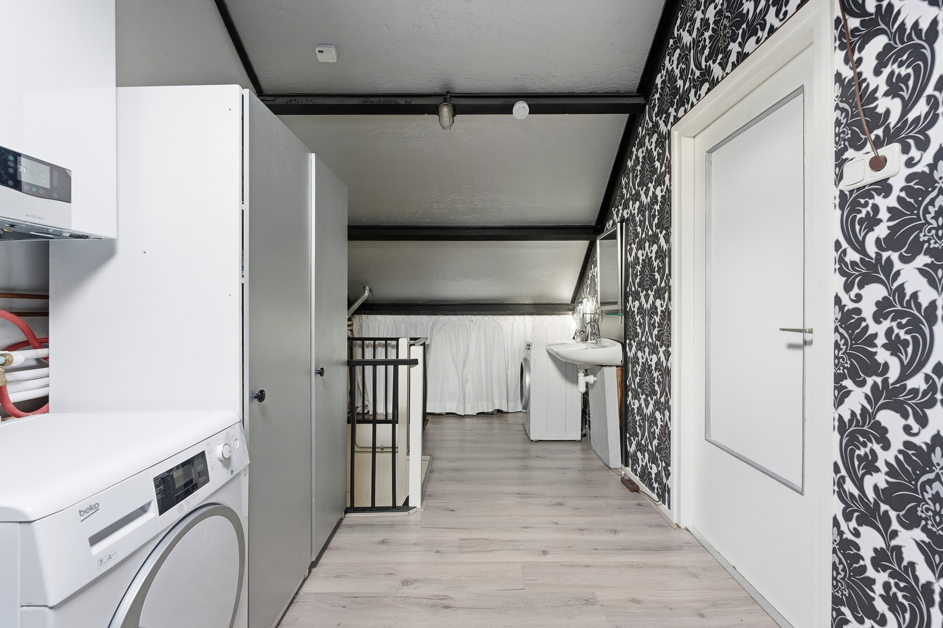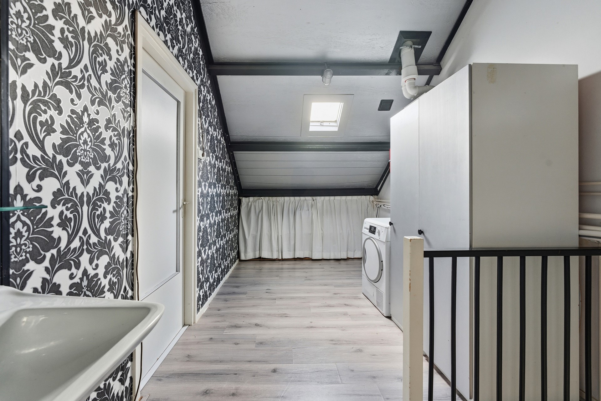 Overloop: De overloop op de tweede verdieping is ingericht met een wasmachineaansluiting en de opstelplaats van de Cv-ketel. Ook is hier een fonteintje aanwezig en zorgt een dakraam voor lichtinval. De afwerking van de verdieping bestaat uit een laminaatvloer, behangwanden en een plafond van houten delen.