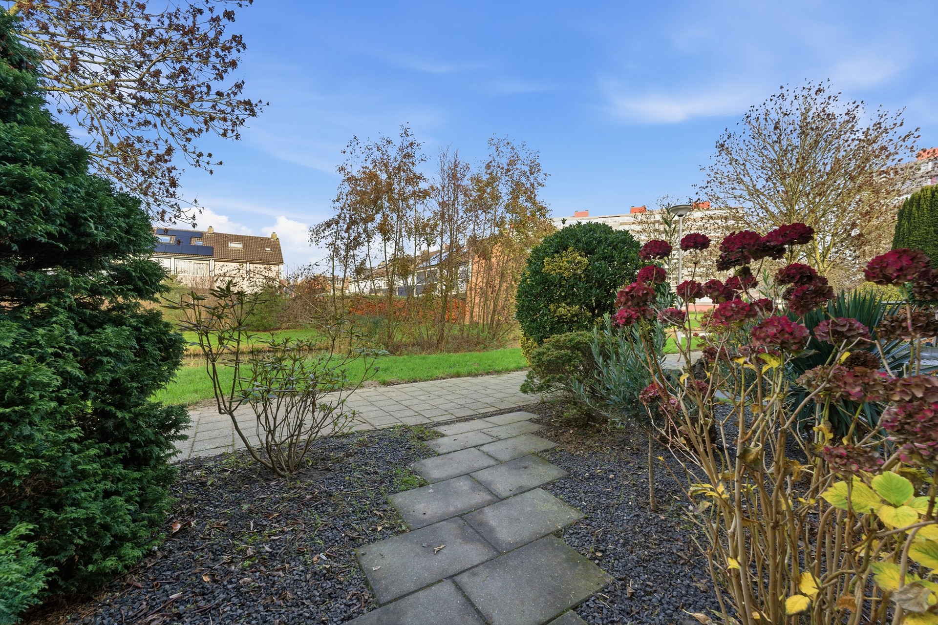 Voortuin: De voortuin (ca. 3,80 x 6,10 m) ligt op het noordwesten en is ingericht met bestrating, tuinborders en enkele boompjes. Voor de woning loopt alleen een wandelpad, waardoor er geen auto’s voorbijkomen en de ligging rustig is. Aan de voorzijde grenst de tuin aan een slootje, waar in de zomer bijvoorbeeld gevist kan worden.