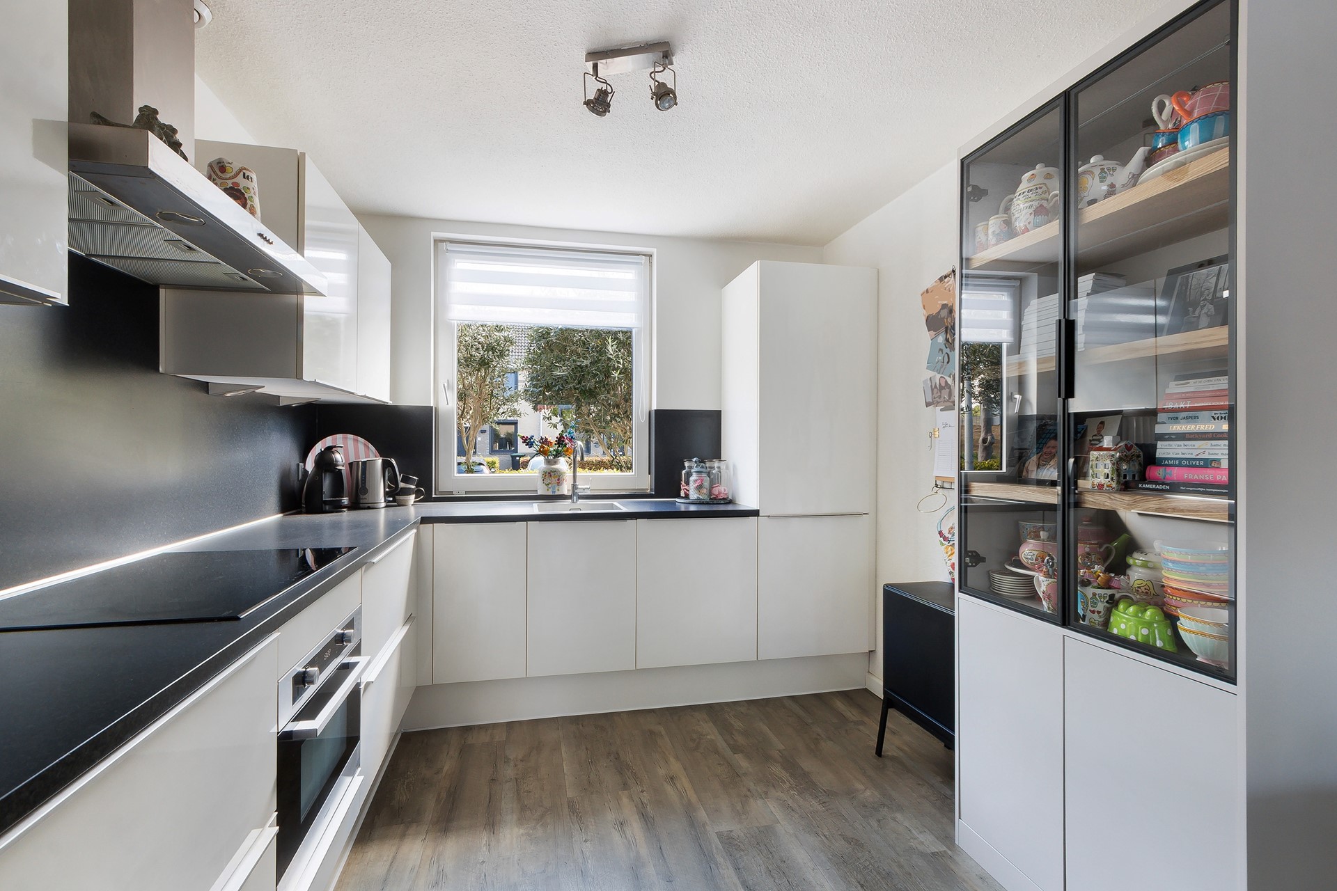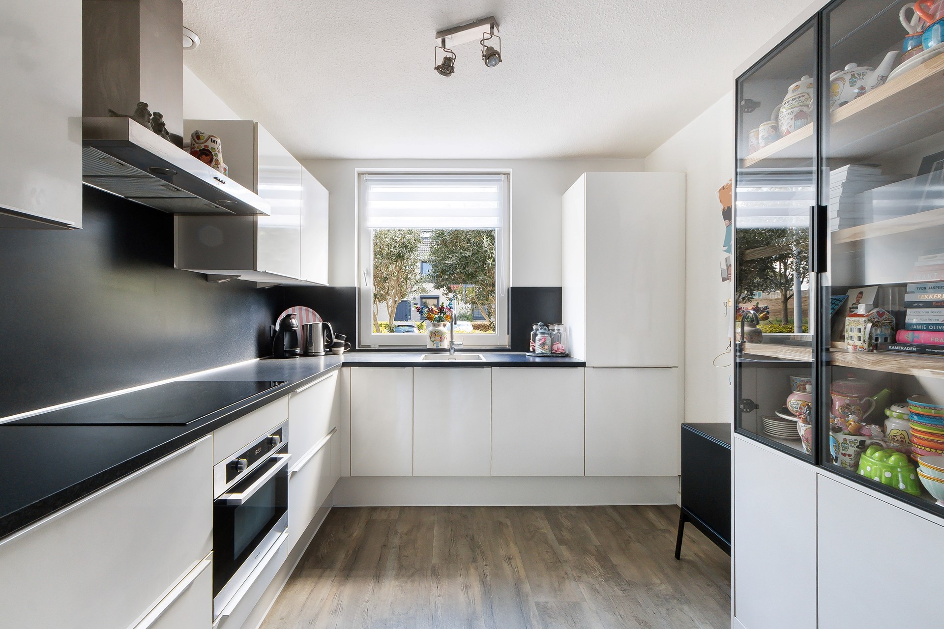 Keuken: Aansluitend aan de woonkamer ligt de halfopen keuken in hoekopstelling. De ruime keuken is in 2015 geplaatst en uitgevoerd in hoogglans wit met een antracieten werkblad. Je vindt hier alle wenselijke voorzieningen: een koel-/vriescombinatie, combimagnetron, vaatwasser en inductiekookplaat met afzuigkap.
