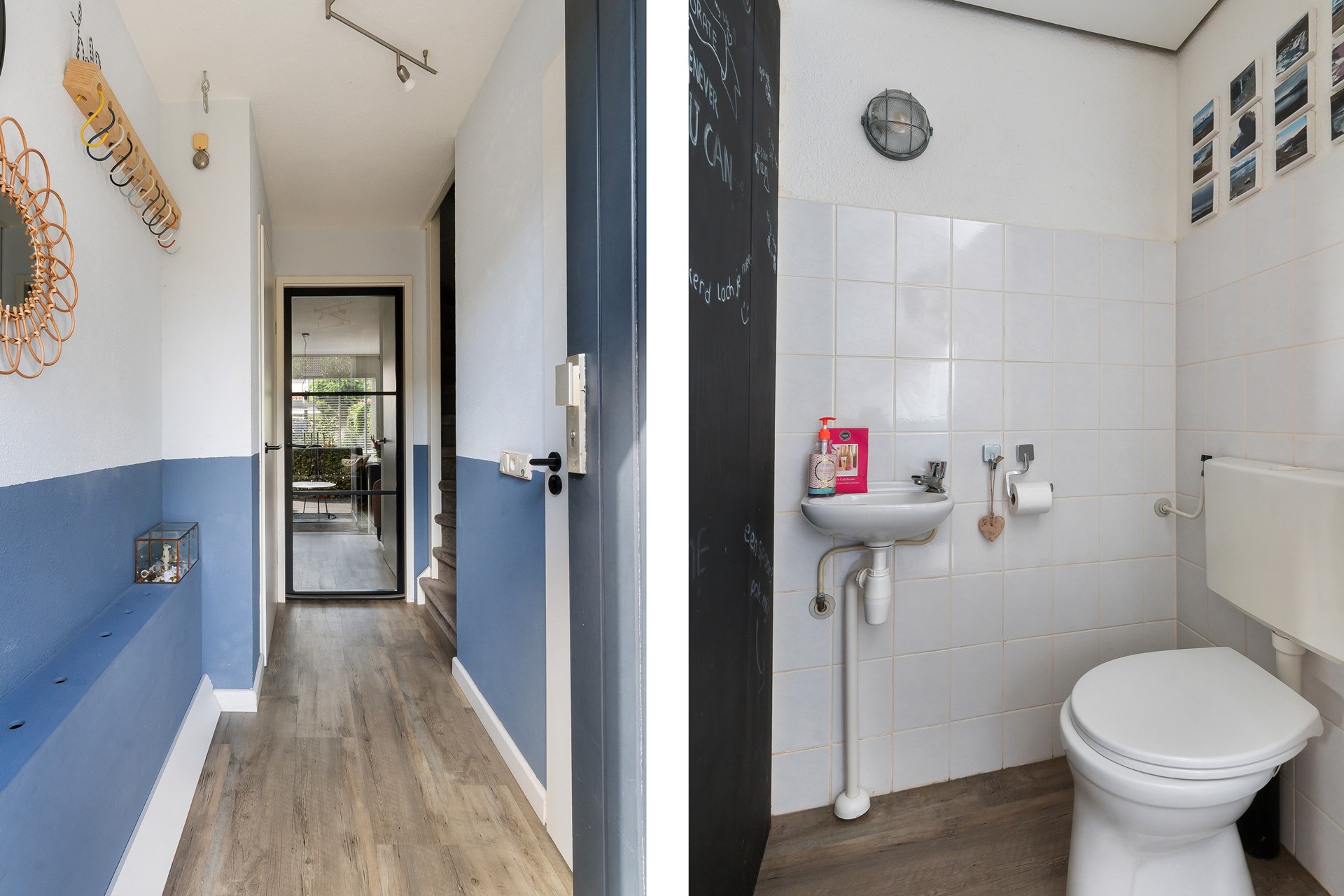 Toilet: De toiletruimte is deels betegeld in een lichte kleurstelling en voorzien van een toilet en een fonteintje. Achter de toiletruimte bevindt zich de HR combi-ketel (Intergas 2019).