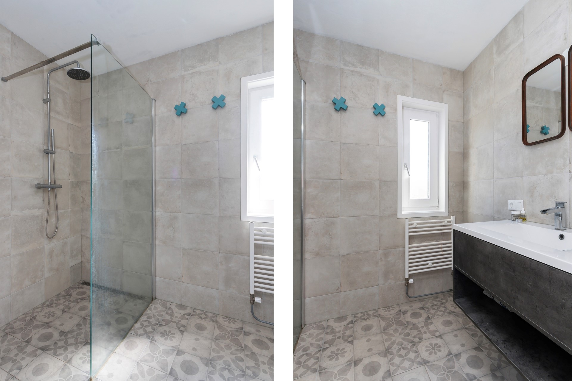 Badkamer: De royale badkamer is uitgevoerd in een lichte kleurstelling en beschikt over een inloopdouche, wastafelmeubel en mechanische ventilatie. De tegels hebben een leuk motief en geven de badkamer een moderne uitstraling.