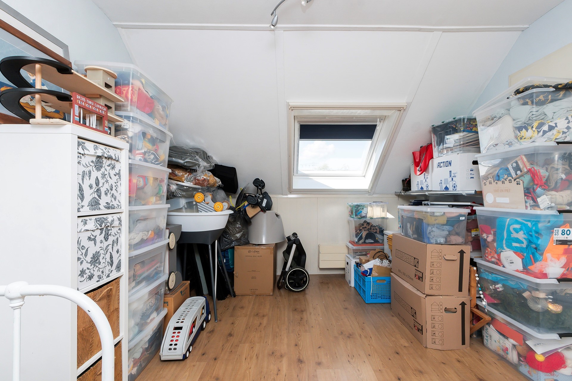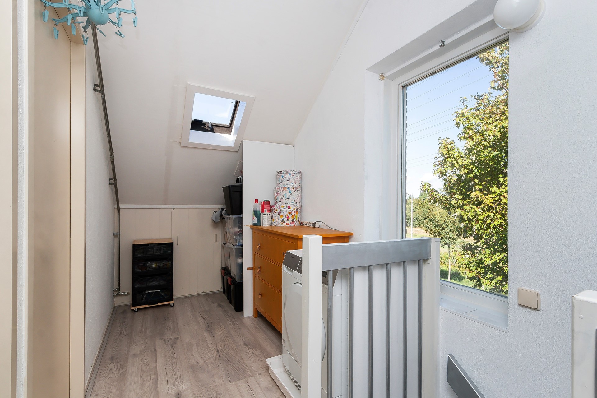Overloop: De ruime voorzolder heeft aansluitingen voor de wasmachine en droger en is voorzien van een zijraam en dakraam. De gehele zolder is afgewerkt met een laminaatvloer en behangwanden. Daarnaast zijn er knieschotten, ideaal voor extra opbergruimte.